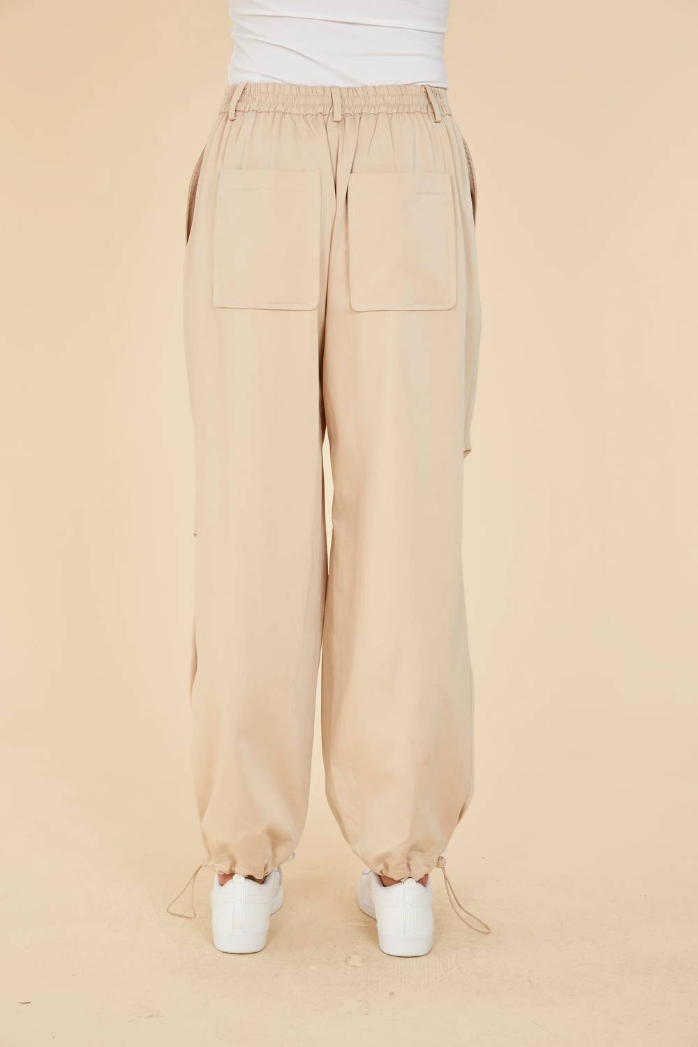 Elevate your streetwear style with the Drawstring Ruched Knee Trousers by DOLCE CABO, designed in a versatile Sand hue. These tapered-leg pants offer a relaxed fit and feature ruched knees and drawstring cuffs for a laid-back yet chic aesthetic. Made for comfort and fashion, they boast a high-rise waist and practical pockets, with a solid pattern ideal for various spring occasions. Closure is a zip closure, and care is simple with a dry clean recommendation.