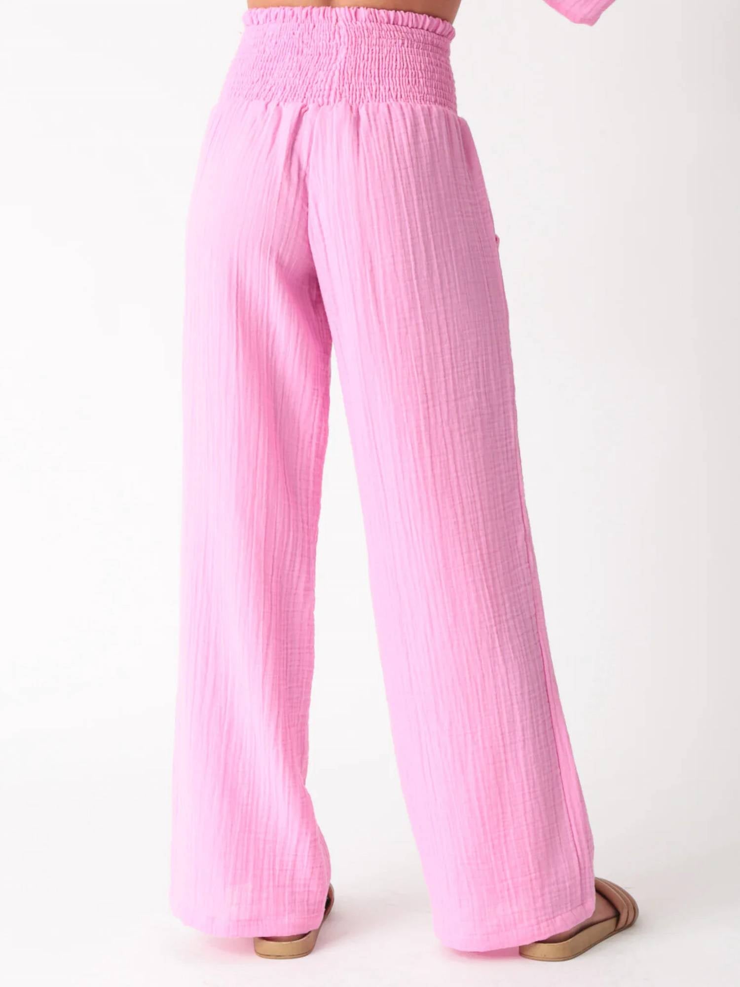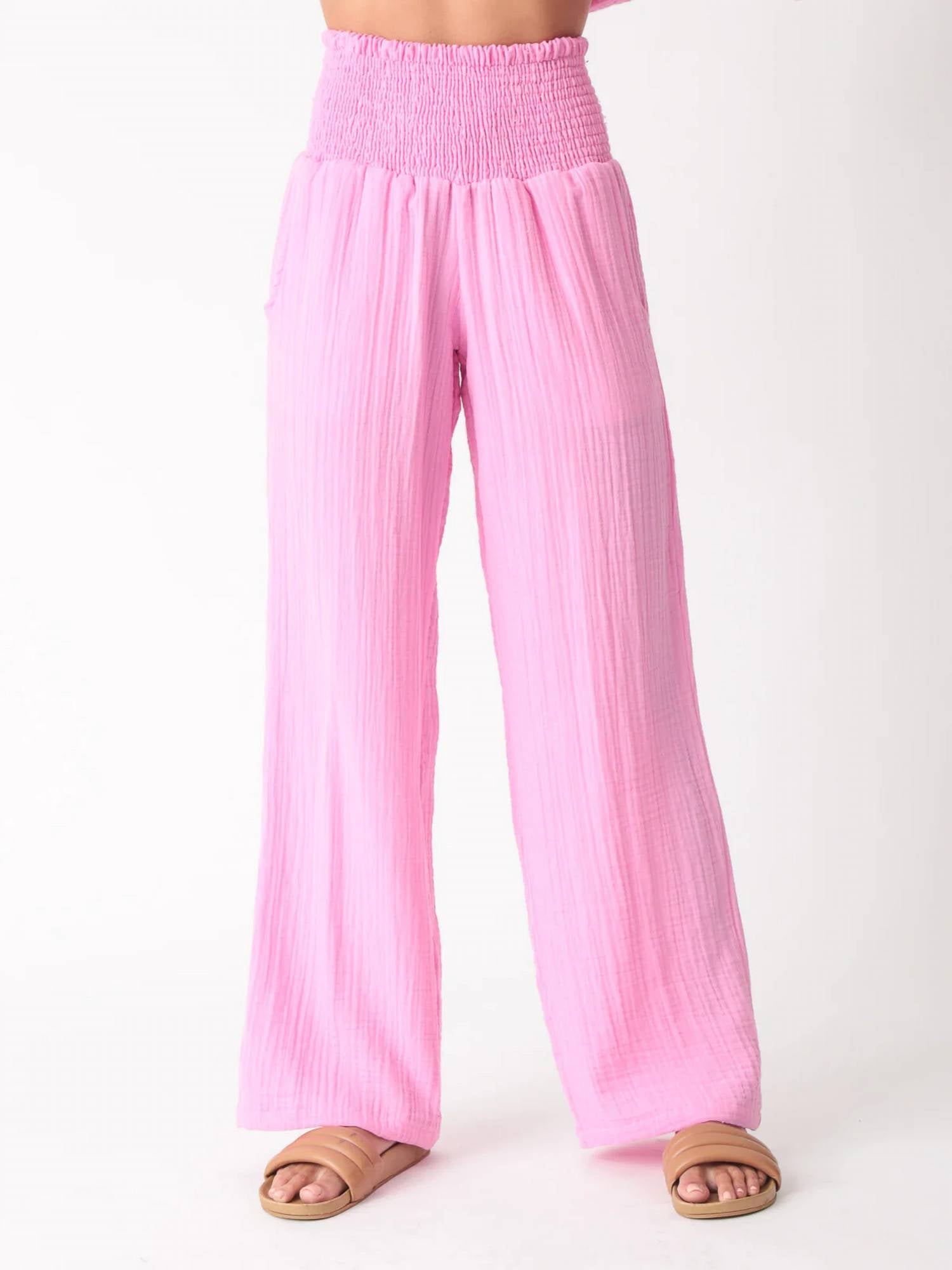 Elevate your summer wardrobe with the Beach Pant by Electric & Rose, featuring a high-rise and relaxed fit for effortless beach-day style. Made in the USA, these wide-leg trousers boast a flowy textured cotton fabric with a smocked pull-on waistband, offering ultimate comfort. The pants come in a versatile pink hue equipped with convenient pockets, making them both practical and stylish. Care instructions include machine wash cold and lay flat to dry. Fabric: 100% Cotton.