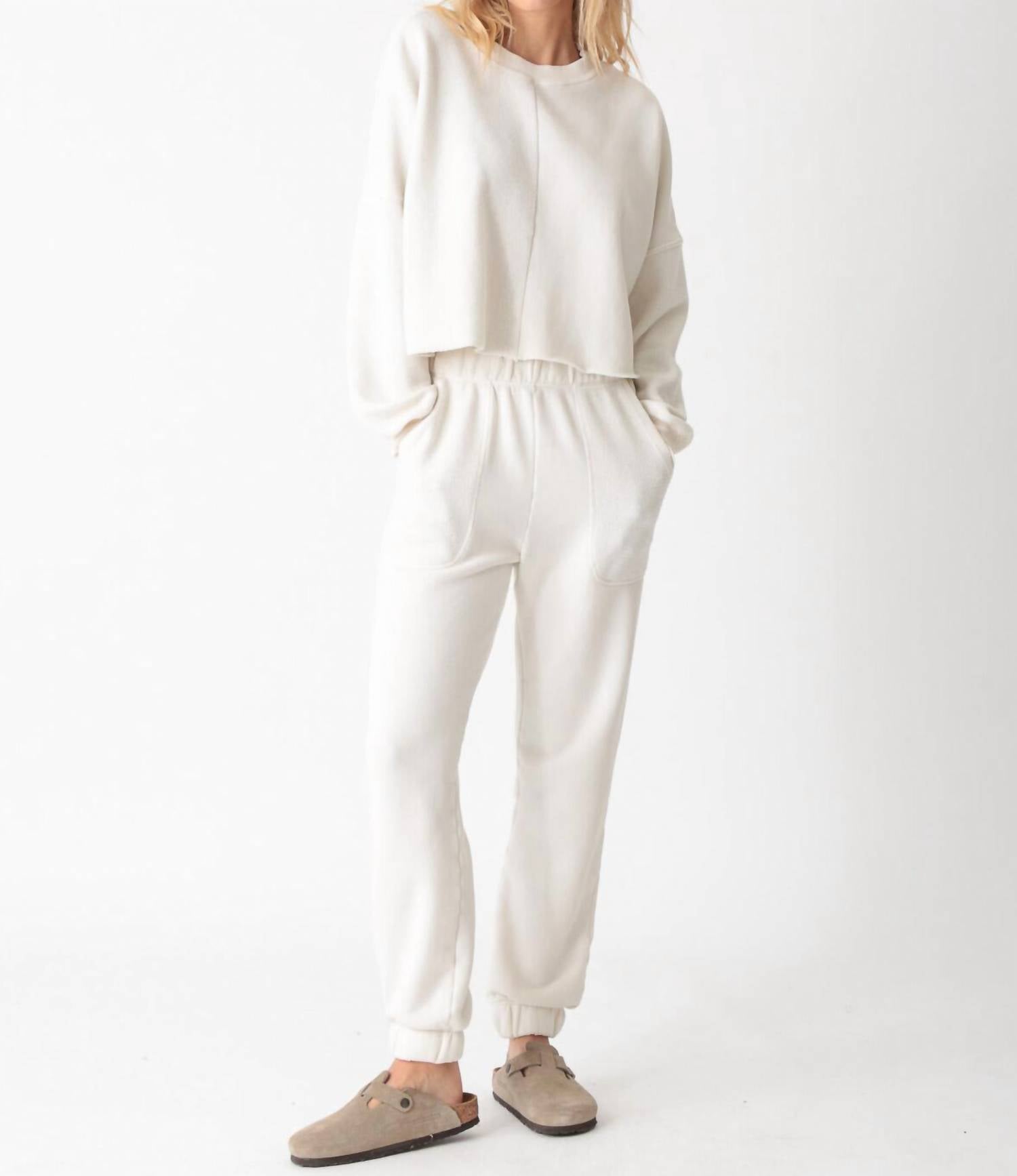 Combine-os com seus tênis favoritos para um visual descolado e descontraído. Experimente o máximo conforto com a Calça de Moletom Hayden da Electric & Rose, confeccionada em sherpa ultramacia com composição de algodão 50% poliéster e 50% algodão. Com cós alto, caimento regular e pernas retas, esta calça cor marfim conta com um prático fecho pull-on e bolsos para maior funcionalidade. Orgulhosamente fabricada nos EUA, esta calça de moletom é perfeita para qualquer passeio casual. As instruções de cuidado são simples: lavar à máquina e secar em temperatura baixa. A modelo mede 1,75 m e veste tamanho P.