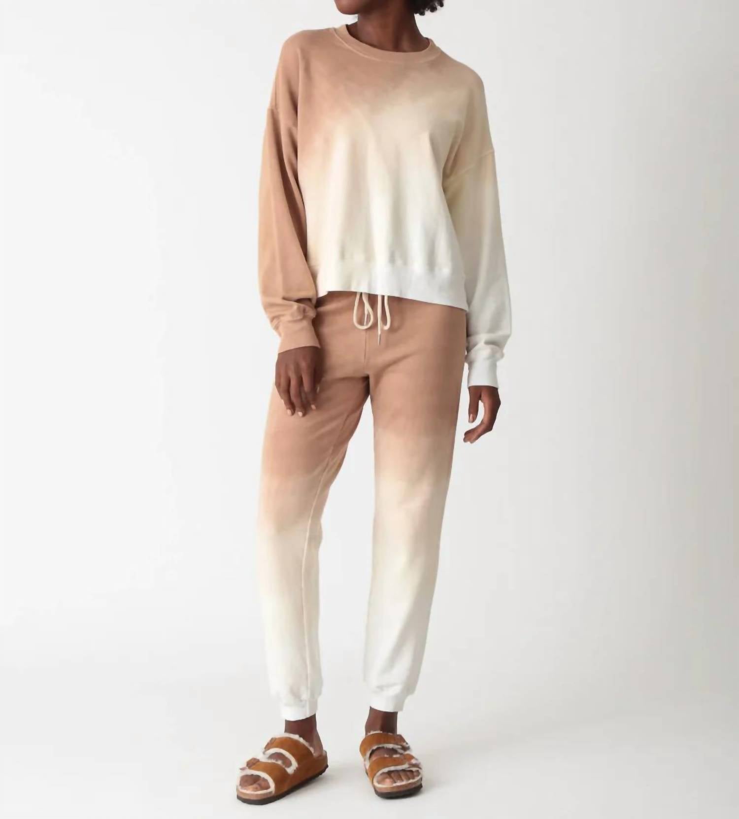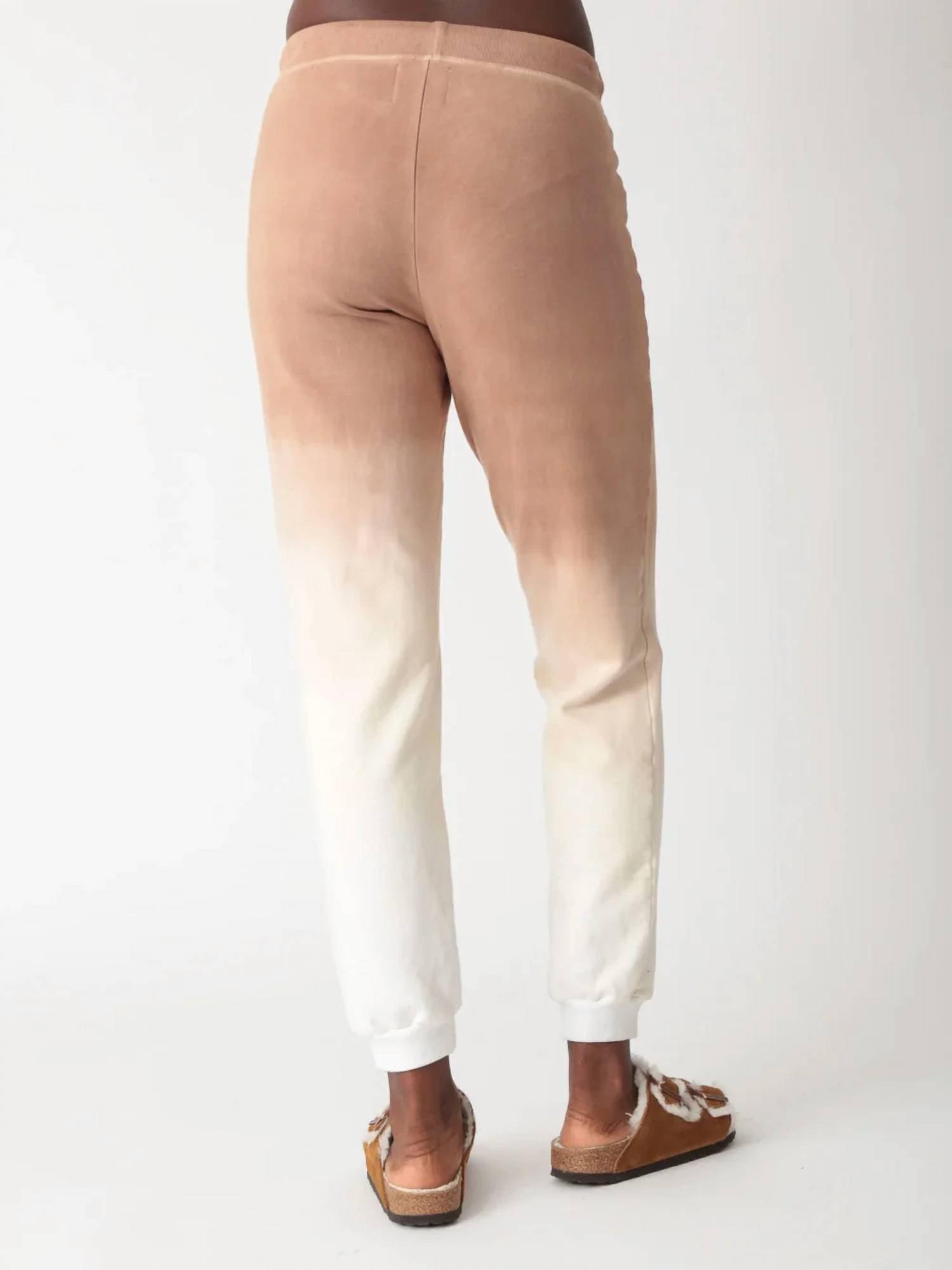 No gym necessary for these cool-girl joggers. Discover the Electric & Rose Sunny Jogger, a cozy staple in Latte Ombré, perfect for travel and Thanksgiving festivities. These women's joggers feature a relaxed fit with a low-rise waist and a stylish tapered leg. Made in the USA, they boast a luxurious cotton blend of 70% Pima Cotton, 25% Modal, and 5% Spandex, enhanced by a unique hand-dyed tie-dye pattern. Closure is a convenient pull-on style, with easy care instructions of machine wash and tumble dry on low.