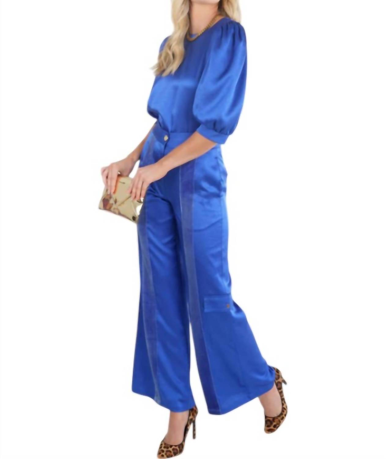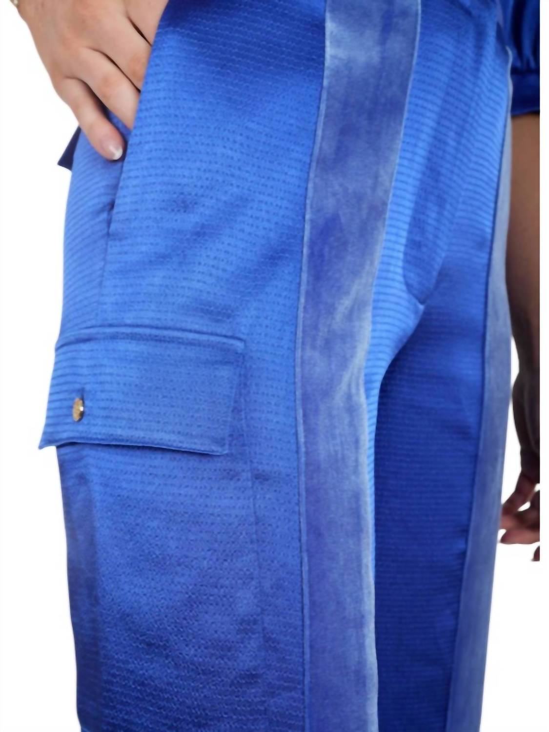 Peça marcante em Azul Dazzle. Confeccionada em 100% poliéster com acabamento em veludo. Calça reta de cós alto com fecho exclusivo em botão dourado e zíper oculto para um toque de luxo. Apresenta estampa lisa e dois bolsos funcionais. Lave esta peça em um ciclo delicado, usando sabão neutro em água fria para preservar sua cor e formato, e finalize secando no varal.