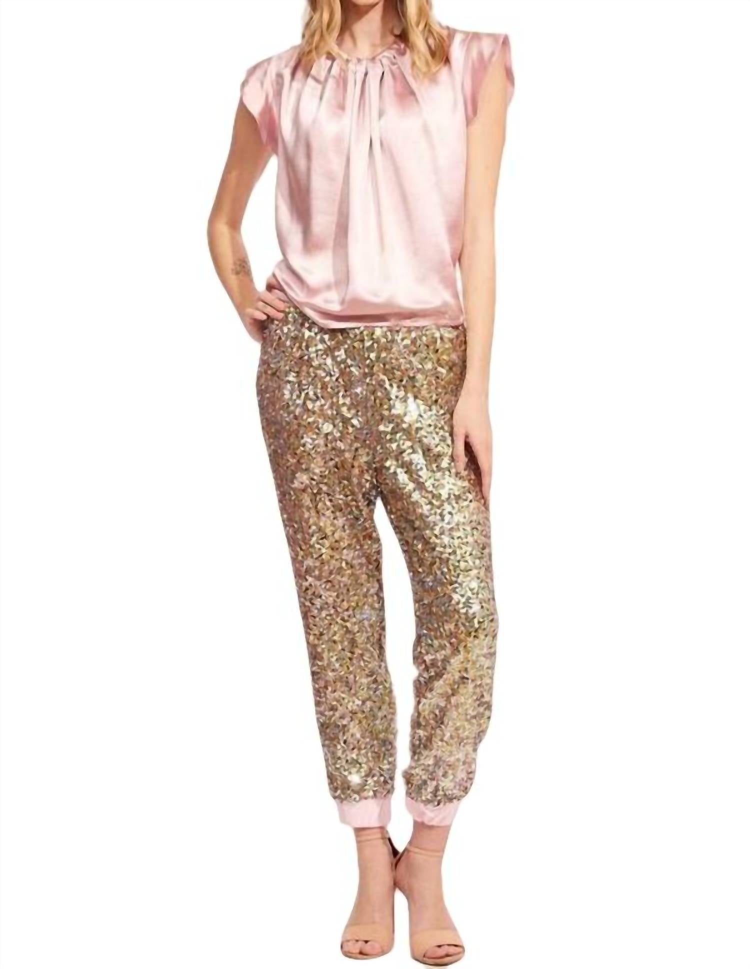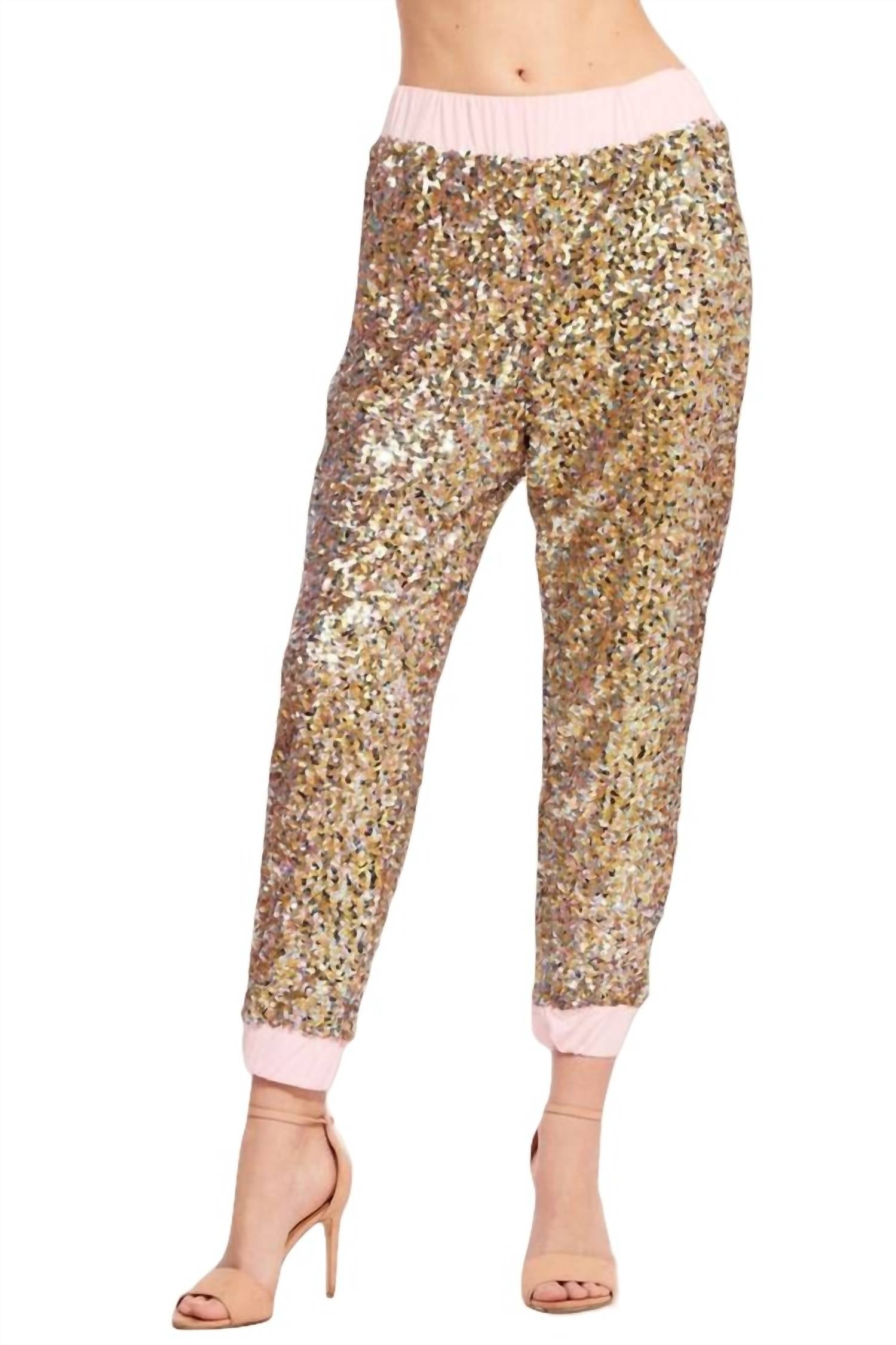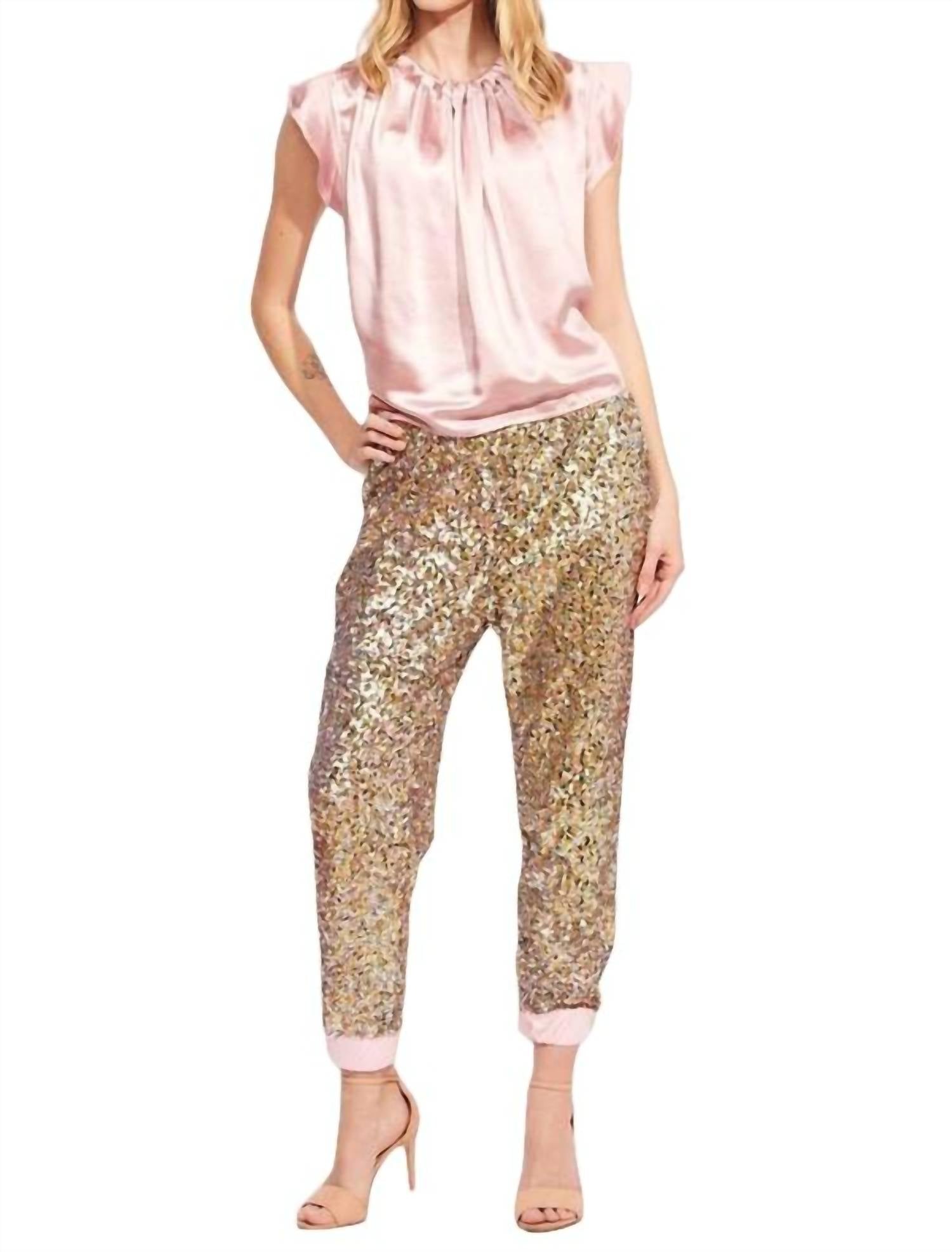 Este modelo de calça jogger Fernanda, queridinho da marca, é feito em lantejoulas brilhantes. Com cós elástico e bainha franzida, esta calça brilhante pode ser usada para festas com saltos ou até mesmo com um par de tênis estilosos para um look casual sofisticado pela cidade. Calça jogger. Totalmente forrada. Cós e punho elásticos. Parte interna: 100% poliéster. Forro: 100% poliéster. Lavagem a seco somente. Fabricado em Los Angeles, EUA.