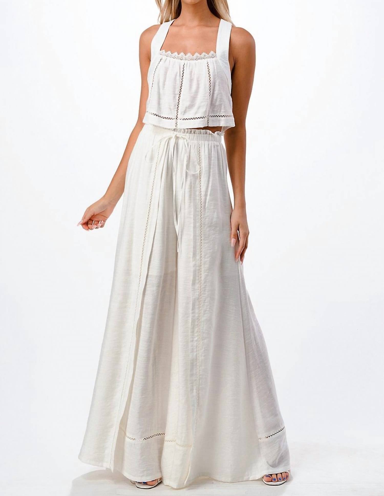 Elevate your look with the Valerina Wide Leg Pants by Fate by LFD, crafted for a boho chic vibe in a striking white textured design. These luxurious pants feature a wide leg silhouette with a twist front and a hidden back zipper closure for a seamless fit. Made from 70% Viscose and 30% Linen, with a 100% Cotton lining, they provide both comfort and style. Imported and designed for easy care, simply hand wash and line dry to keep them looking their best. Perfect for spring vacations or Thanksgiving gatherings.