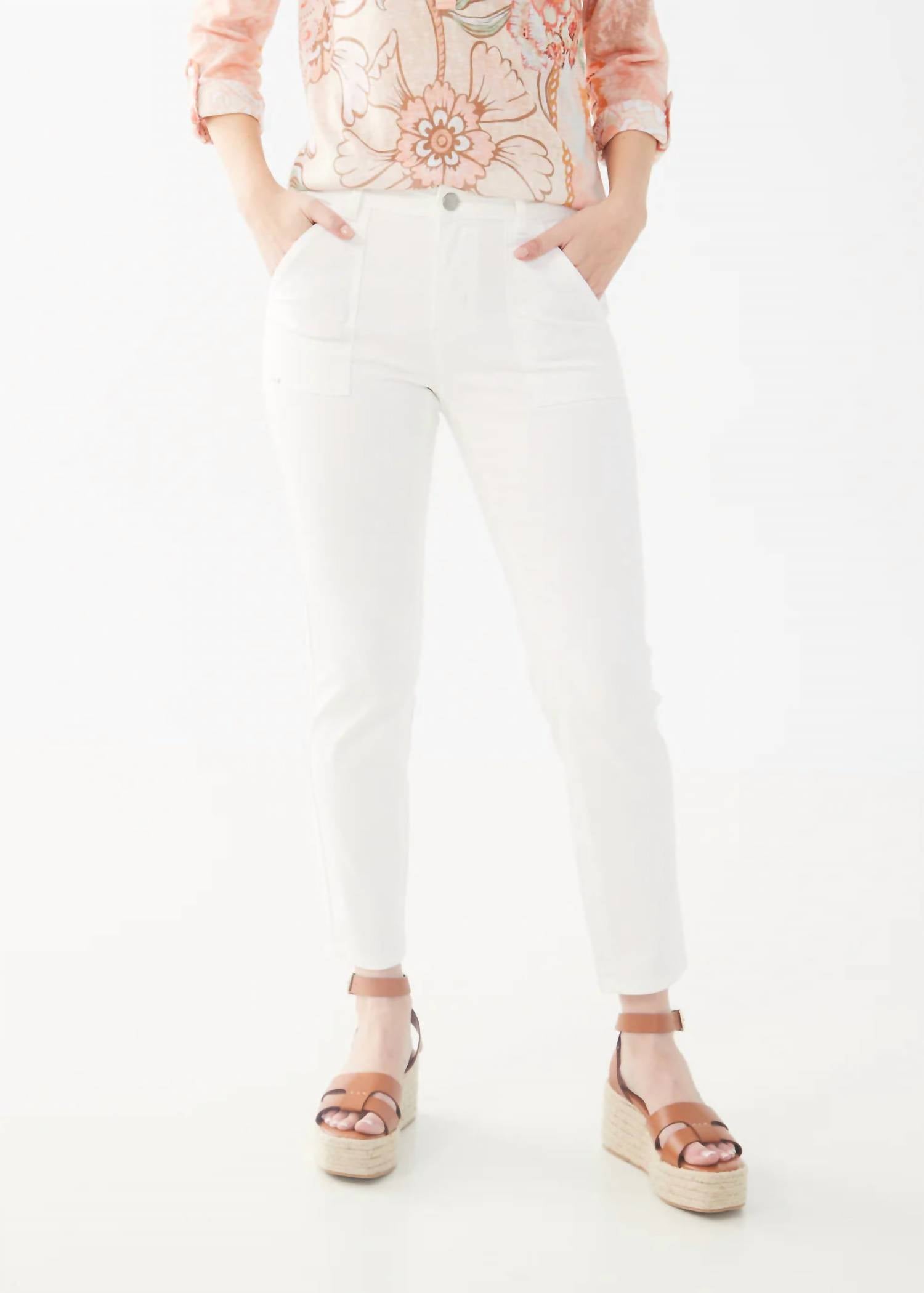 Stay on-trend and showcase your impeccable taste with these adaptable and stylish cropped pants. The perfect length to wear with your favorite mules. You'll love the fit! Highlighting style and functionality, the Olivia Pencil Ankle Carpenter Pants by FDJ are your go-to for a chic workwear look. Crafted from a cotton blend, these solid white pants feature a high-rise waist and a slim fit with a skinny leg that flatters any silhouette. Equipped with a button closure and practical pockets, they offer both convenience and elegance. Easy to maintain, simply machine wash and tumble dry these trendy pants, ideal for a spring vacation or holiday festivities.