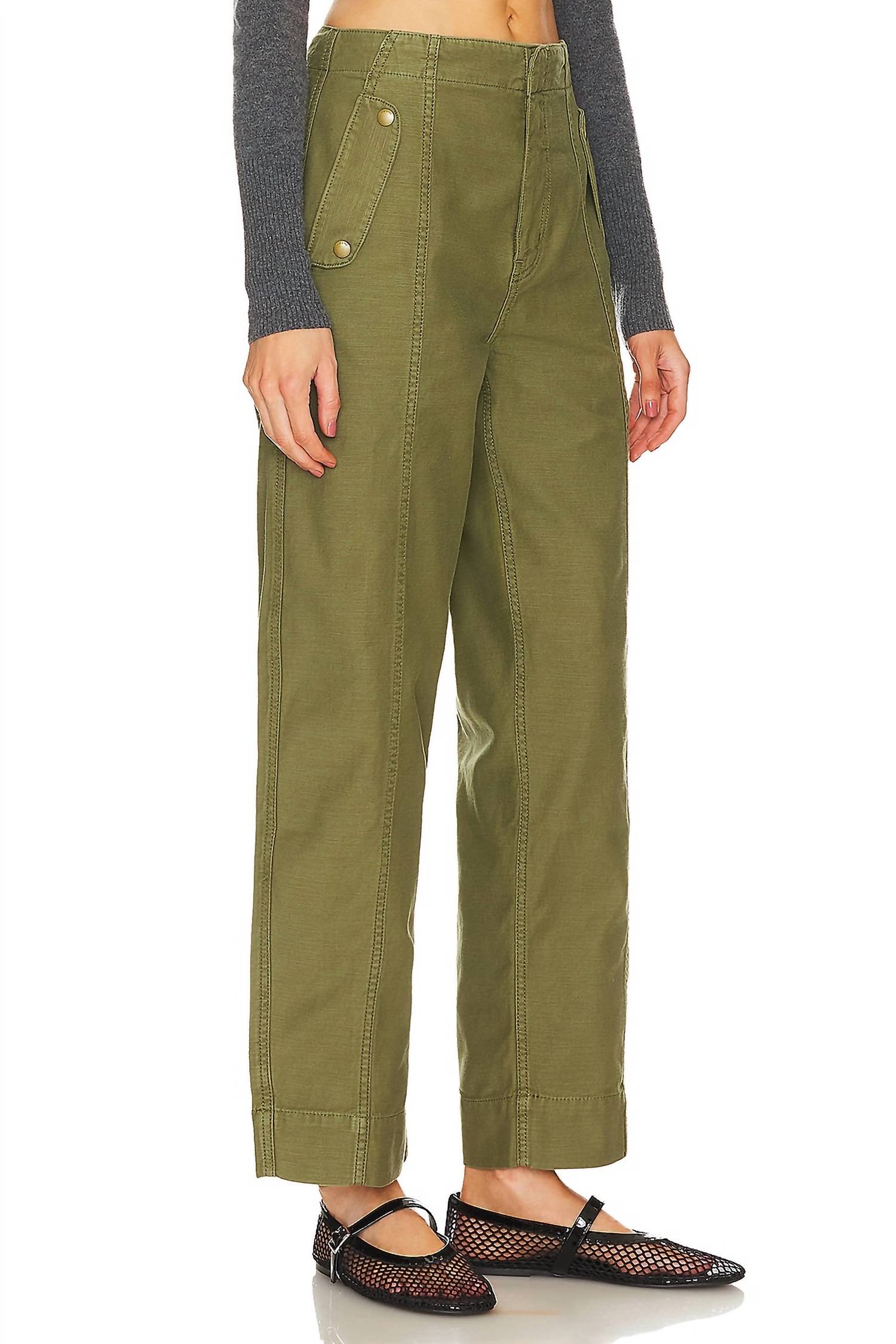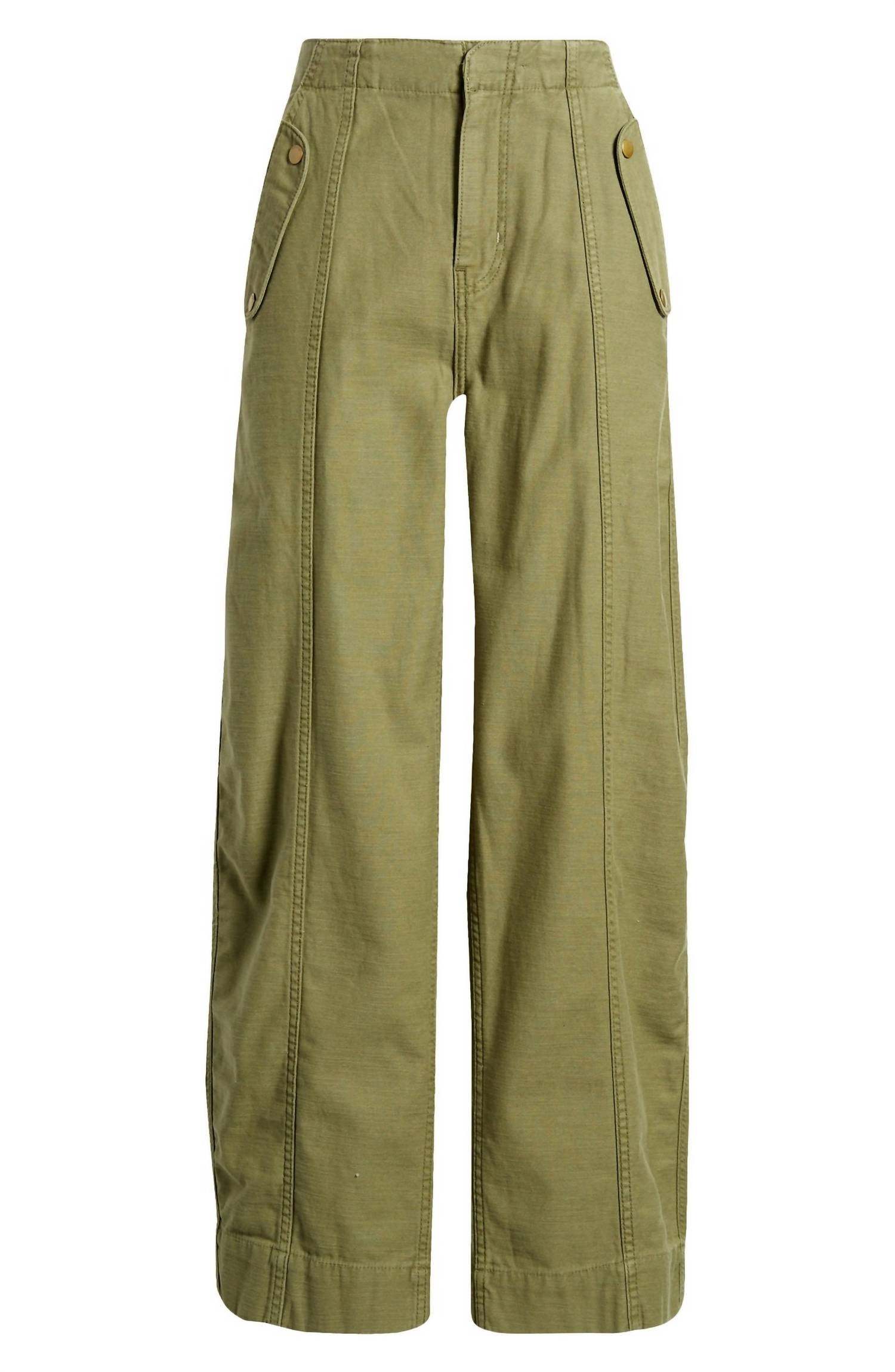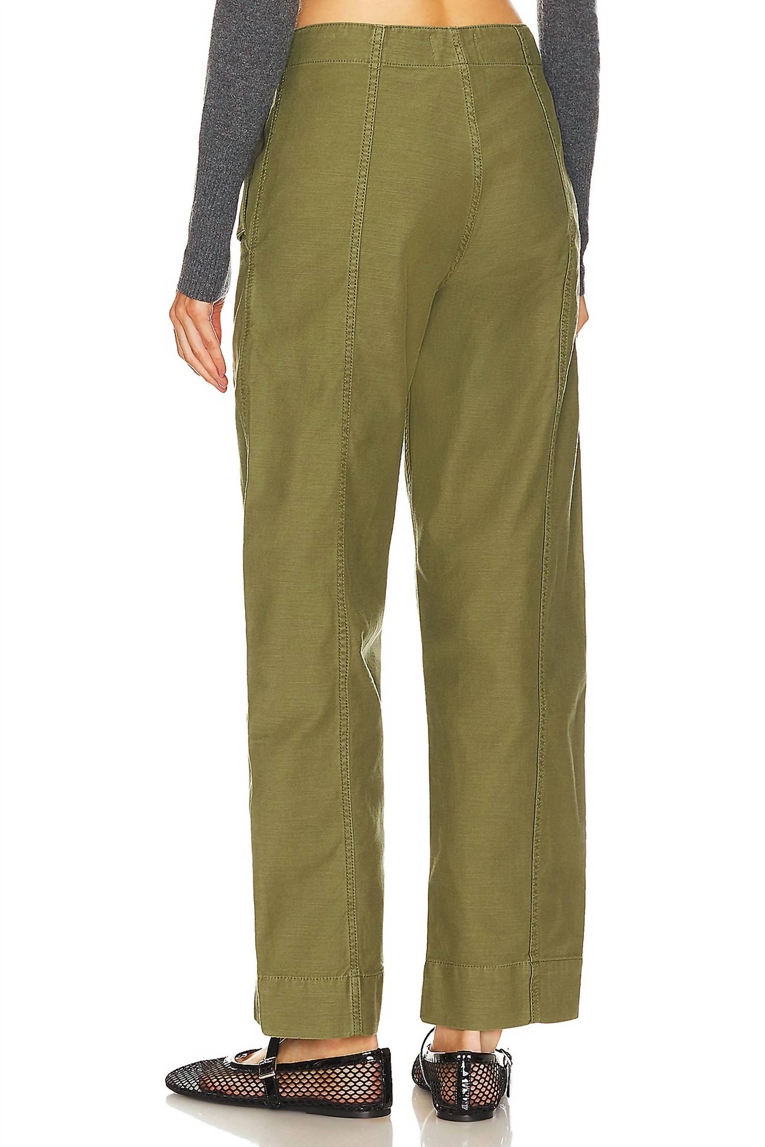 Introducing the FRAME Utility Barrel Washed Pants in Winter Moss, expertly crafted for travel-ready style. These women's straight-leg pants boast an ultra-high rise and a slim fit, designed with a 29" inseam and an 11.75" rise for flattering comfort. Made from 100% cotton in Turkey, they feature sturdy zip and snap closures, side slant pockets with button flap detail, and are machine washable for easy care. Embrace the workwear trend with these versatile pants, perfect for any fall occasion.