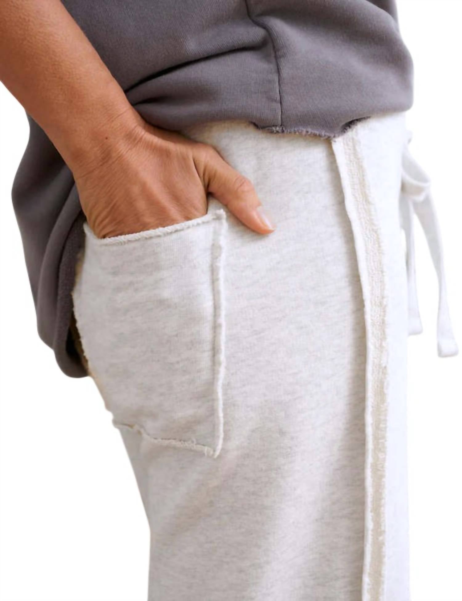This straightleg pant is both stylish and comfortable. Did we mention the fit is perfection? Elevate your wardrobe with the Bella Full Sweatpants by Frank & Eileen, a luxurious everyday essential in Heather White Melange. These pants offer a relaxed fit with a mid-rise and long wide-leg style, featuring a hand-cut raw hem and adjustable drawstring elastic waistband for ultimate comfort. Crafted from 100% cotton triple fleece, they include convenient back patch pockets, while their pull-on closure provides effortless wear. Designed with a 25.5" inseam for size S, they are easy to care for with machine wash and tumble dry capabilities.