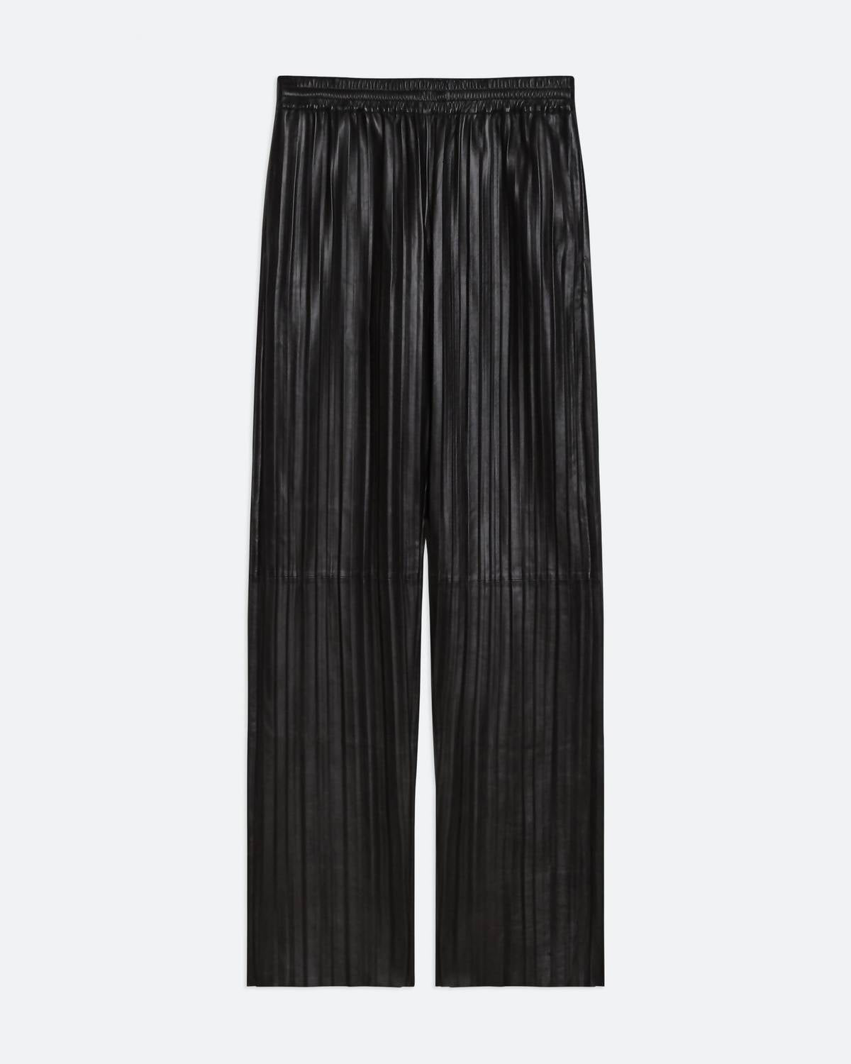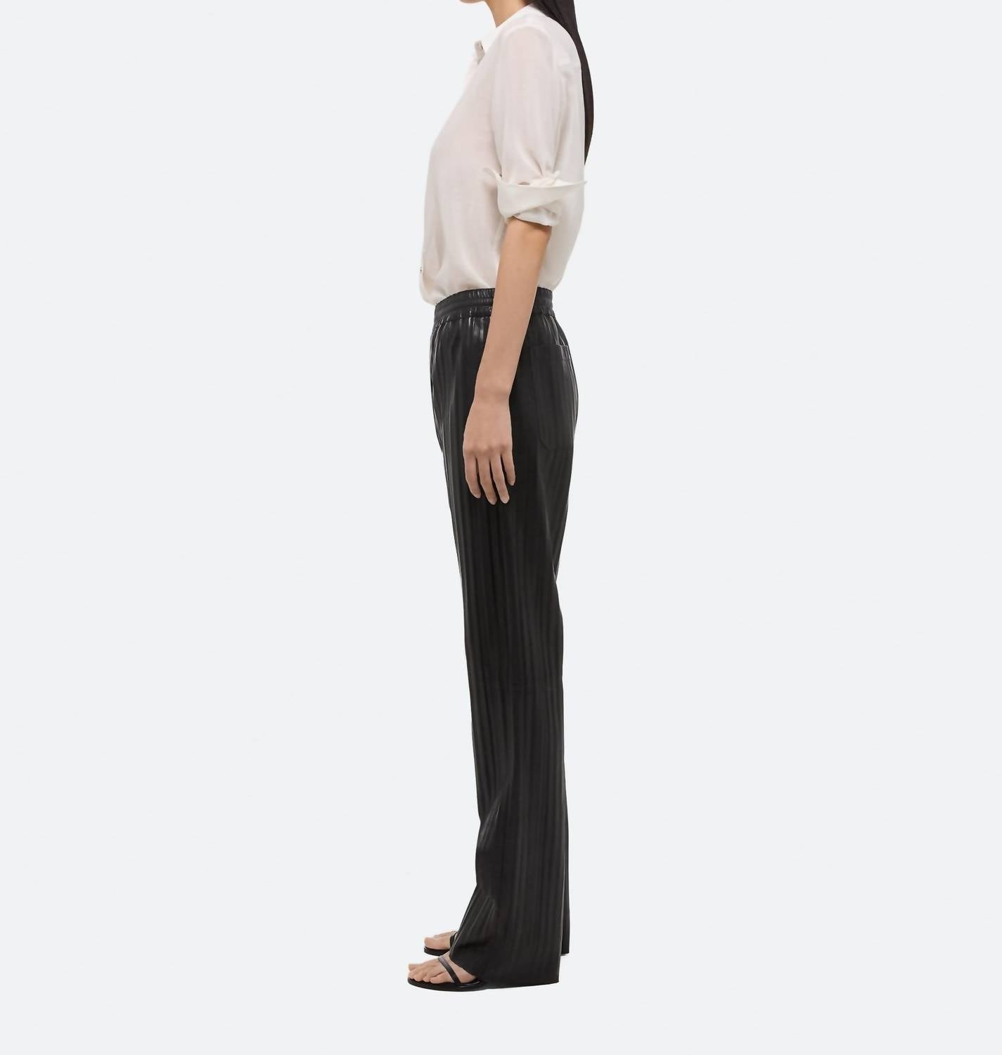 Introducing the Pleated Leather Car Trouser by HELMUT LANG, tailored in classic black for effortless elegance. These mid-rise trousers feature a relaxed fit and straight leg, highlighting pressed pleats for a modern silhouette. Composition: 100% Sheep Leather with an elasticized drawstring waistband for easy pull-on closure. Care: Professional leather clean only. The trousers are fully lined and include in-seam side pockets, back patch pockets, a 32.5” inseam, and a 15” leg opening, making it a stylish and functional addition to your wardrobe.