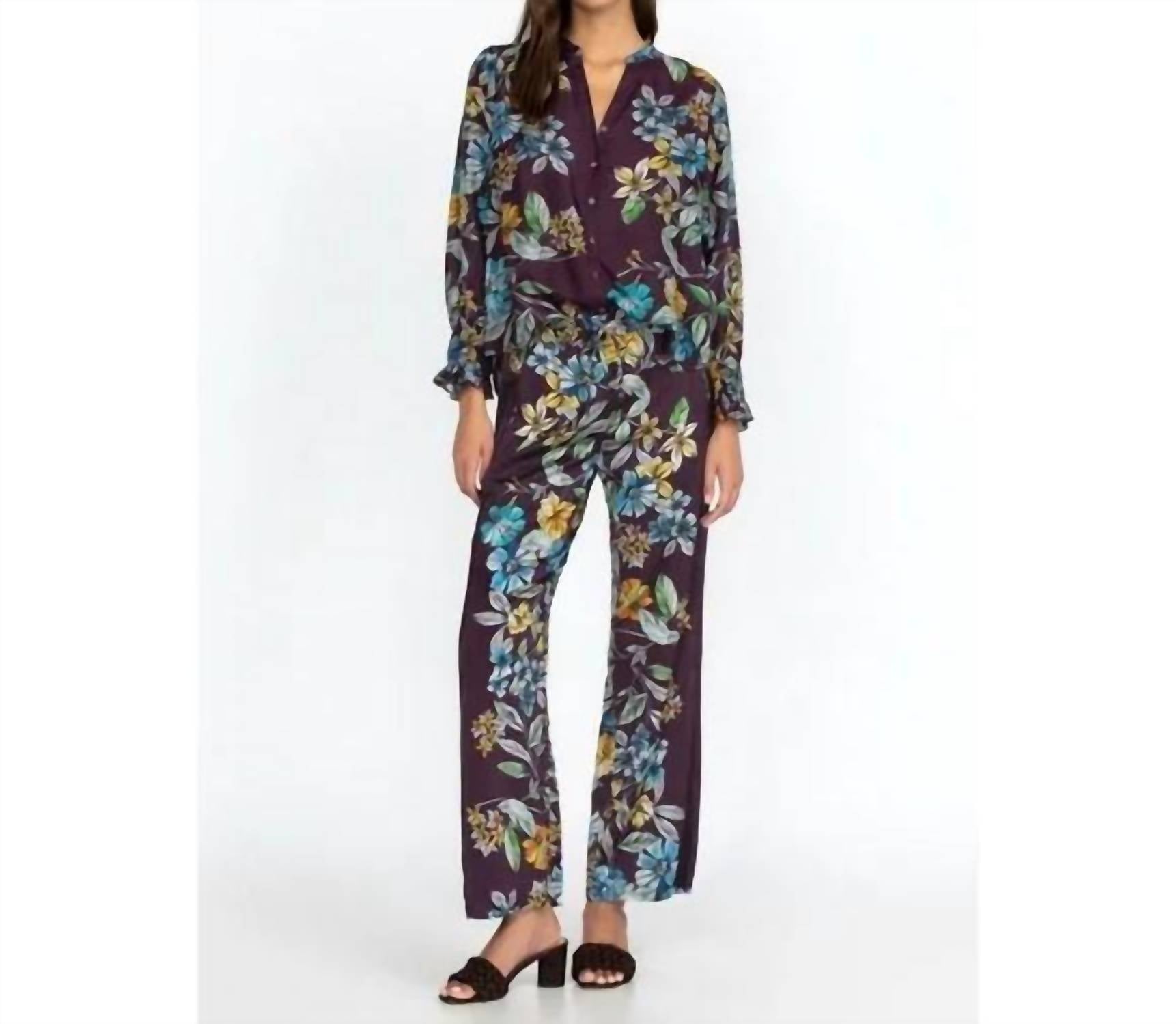 Slightly flared pants are all the rage right now and these are no exception. Pair these with your favorite tee for a more casual look, or with your favorite button-up blouse for an evening out. These pants are made of 92% silk and 8% spandex and feature large floral motifs, contrast piping, an elastic waistband with a drawstring, and side pockets. The size medium measures a 32.5" relaxed waist and a 31" inseam. The model is wearing a size small. Turn inside out, hand wash gently, lay flat to dry, and use a light steam iron if needed.