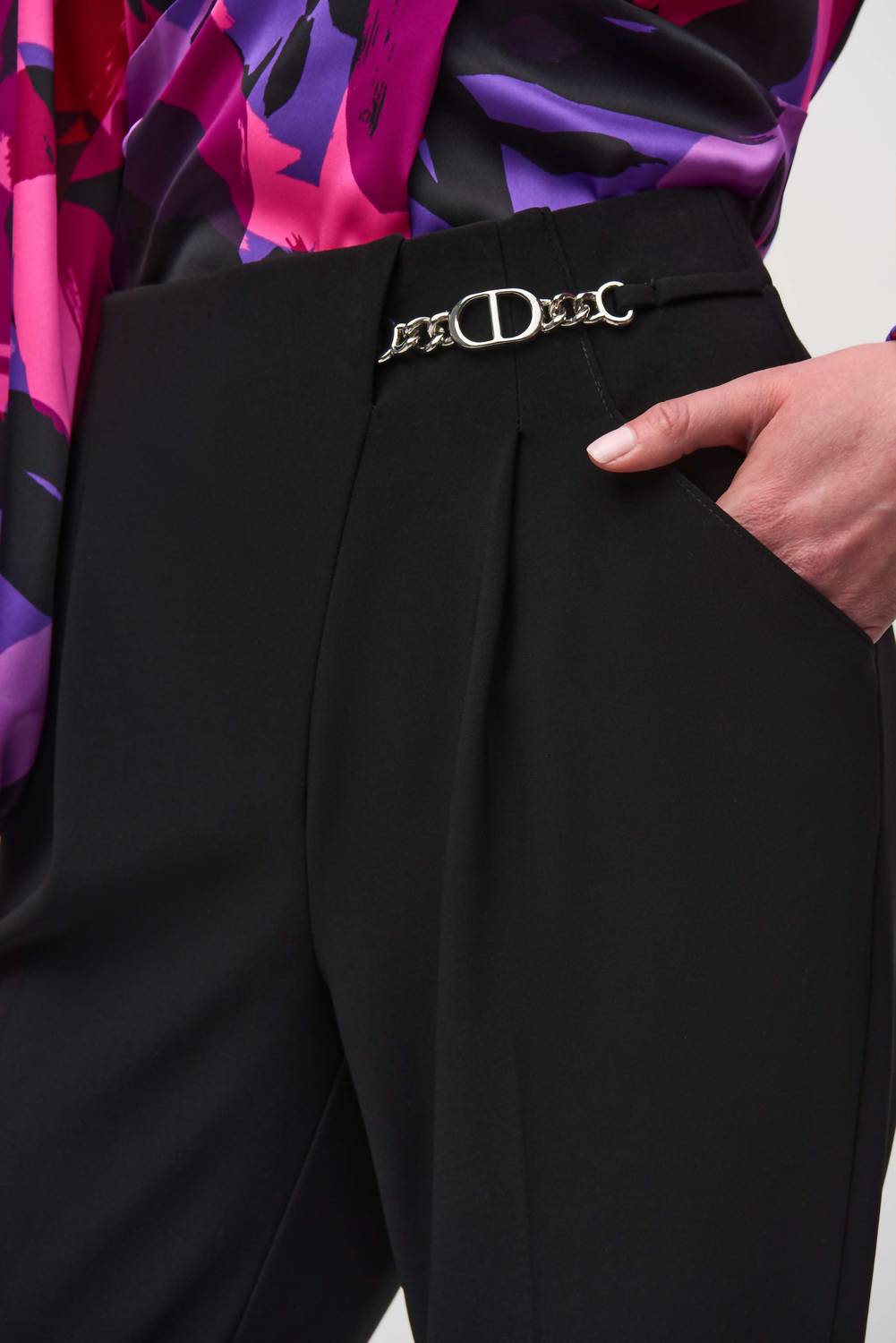 Uma calça reta que combina com todas as estações. Combine-a com sua blusa favorita ou use-a casualmente com sua camiseta favorita. Apresentamos a Calça Crop Pull-on Preta em Malha Seda da Joseph Ribkoff, criada para o minimalista empresarial moderno. Esta calça de cintura alta, com comprimento até o tornozelo, apresenta um corte slim com um padrão sólido e simples, ideal para ambientes formais ou de escritório. Confeccionada em uma mistura de 96% poliéster e 4% elastano, apresenta cós elástico confortável e um corte que esbanja elegância. Fabricada no Canadá, esta calça versátil é fácil de cuidar, com instruções de lavagem à mão e secagem no varal. A costura interna do tamanho 12 mede aproximadamente 74 cm.