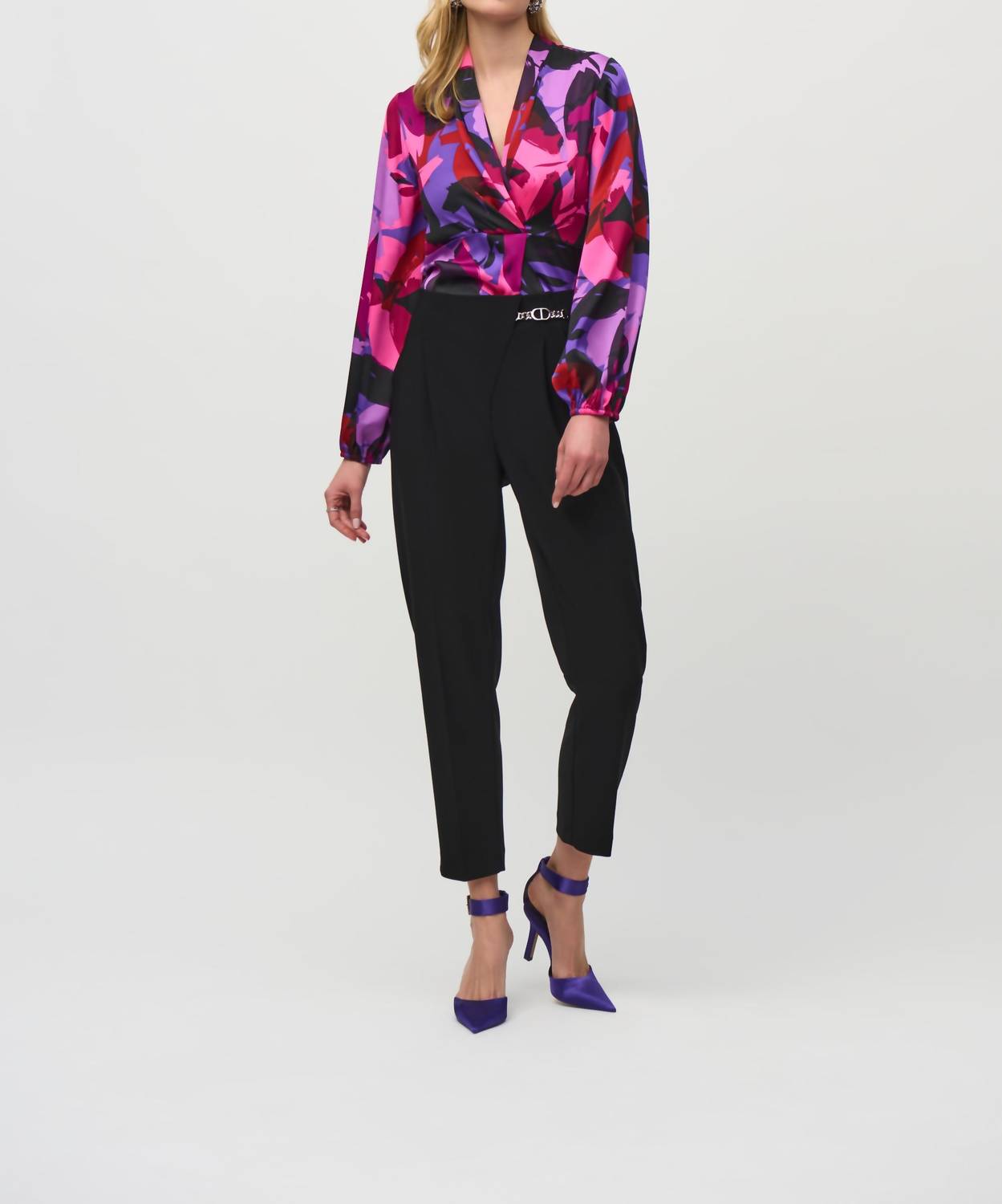 Apresentamos a Calça Crop Pull-on Preta em Malha Seda da Joseph Ribkoff, criada para o minimalista empresarial moderno. Esta calça de cintura alta, com comprimento até o tornozelo, apresenta um corte slim com um padrão sólido e simples, ideal para ambientes formais ou de escritório. Confeccionada em uma mistura de 96% poliéster e 4% elastano, apresenta cós elástico confortável e um corte que esbanja elegância. Fabricada no Canadá, esta calça versátil é fácil de cuidar, com instruções de lavagem à mão e secagem no varal. A costura interna do tamanho 12 mede aproximadamente 74 cm.