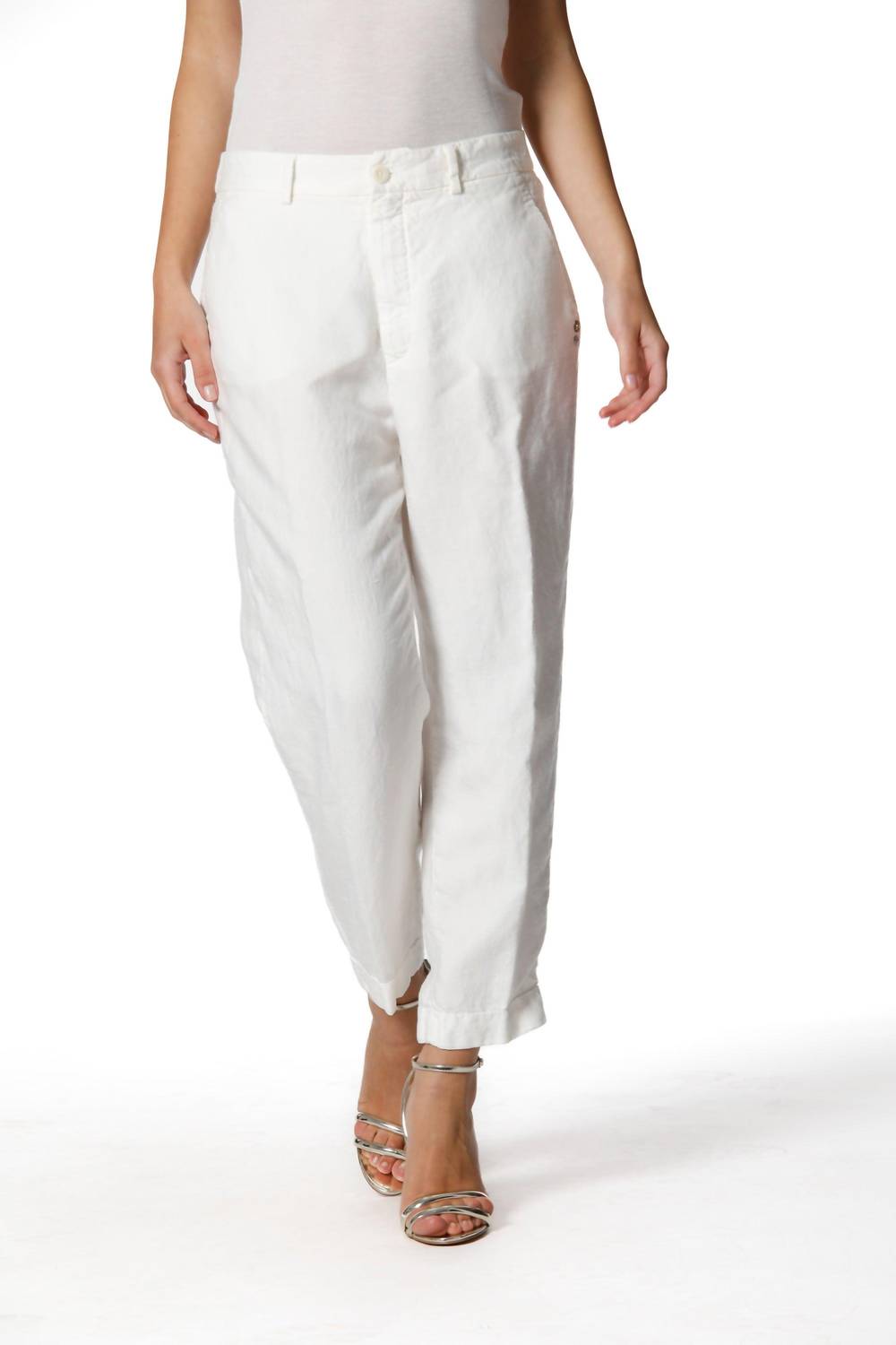 Apresentamos a Calça Chino Jogger da Mason's, criada para trazer estilo e conforto ao seu guarda-roupa de primavera. Esta calça branca de corte clássico é confeccionada em Tencel e linho, proporcionando uma silhueta relaxada e adequada a todos os tipos de corpo. Possui pernas retas e bolsos traseiros aplicados para maior funcionalidade. Ela possui fecho de botão, tornando-a ideal para a transição de um dia de trabalho para um jantar.