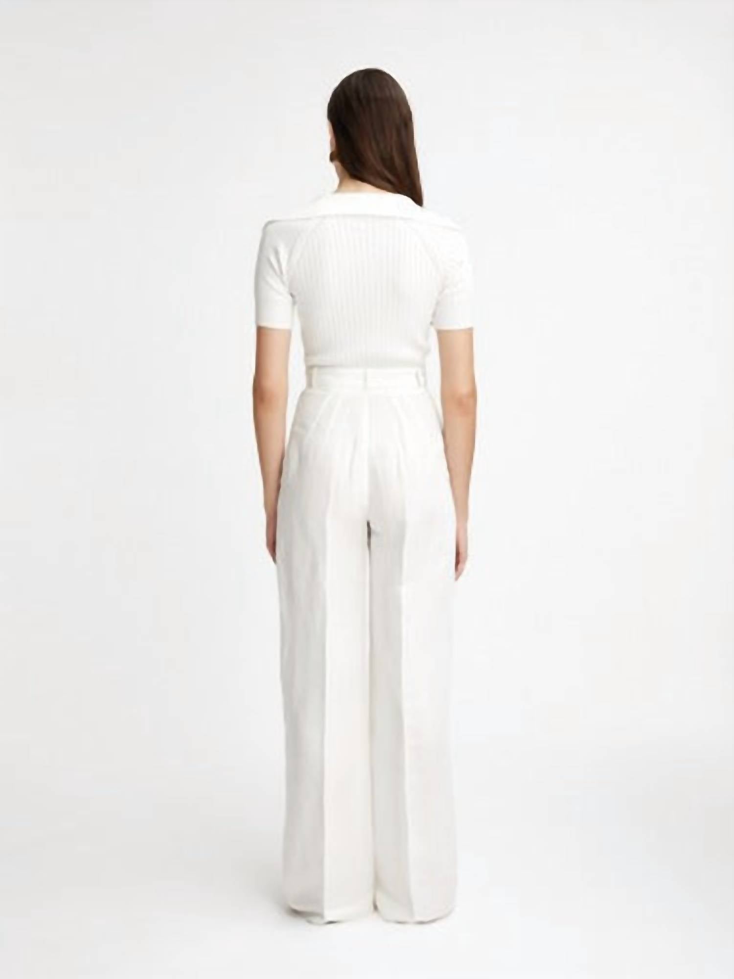 Introducing the Button Pleated Trouser by Matthew Bruch, a sophisticated choice in timeless white. Crafted from a 50% viscose and 50% linen blend, these trousers feature a comfortable wide-leg style with a flattering front pintuck detail. They are made in the USA and offer practical side seam pockets, with a zip fly and button closure. For maintenance, simply dry clean only, and enjoy a chic, lightweight fabric measuring 61 cm at the knee and leg opening.
