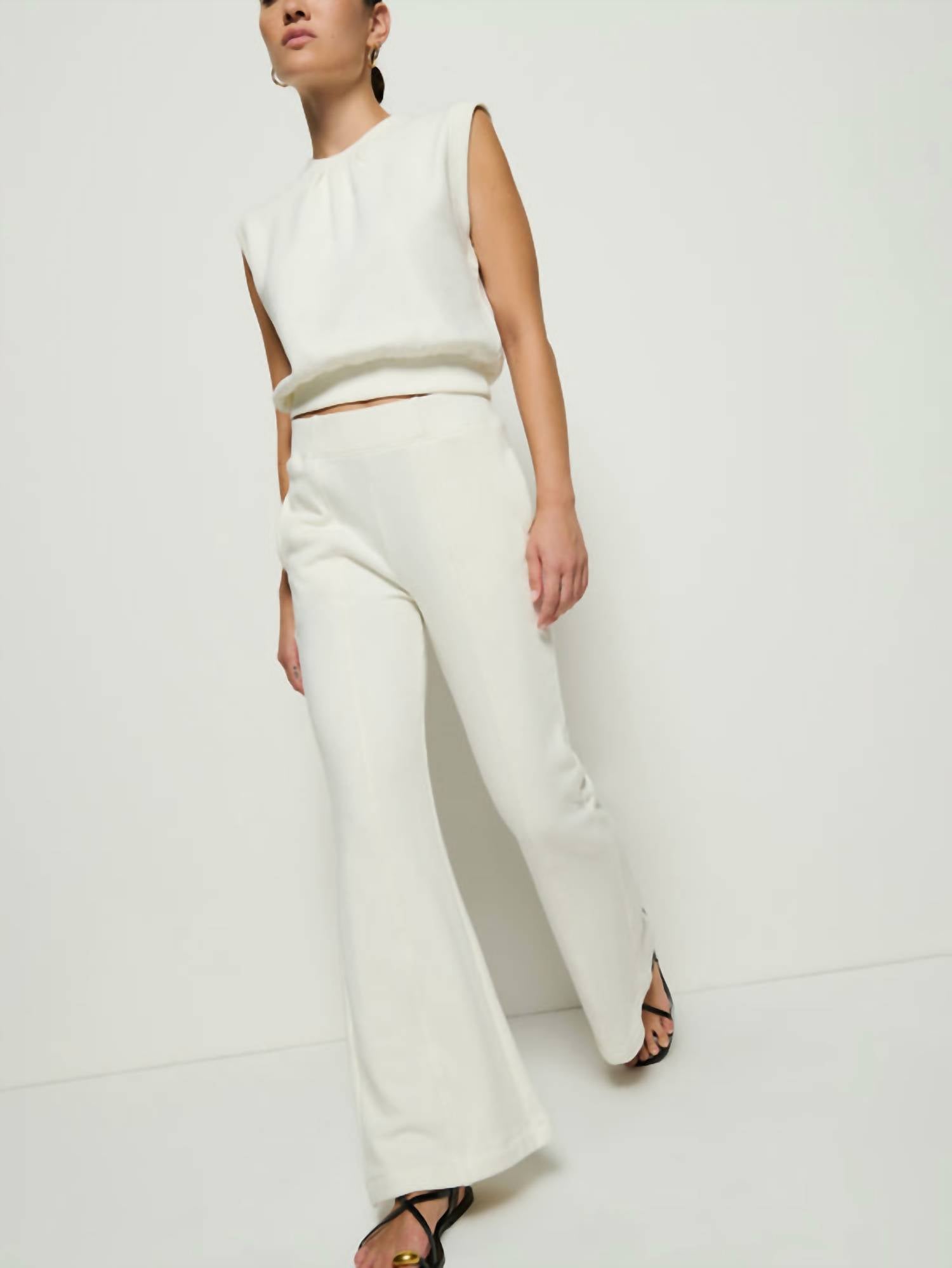 Slightly flared pants are all the rage right now and these are no exception. Pair these with your favorite tee for a more casual look, or with your favorite button-up blouse for an evening out. Introducing the Reece Sweatpants by Nation LTD, designed to provide both comfort and style in a porcelain hue. Featuring a fitted silhouette with snug fit through the hips and legs, these sweatpants have convenient on-seam pockets and classic pintuck details. Made from 100% Organic Peruvian Cotton, the fabric is both soft and midweight, perfect for a minimalist wardrobe. Closure is pull-on, with a high rise of 11.25 inches and an inseam of 29 inches. Keep it simple with machine washing for easy care.