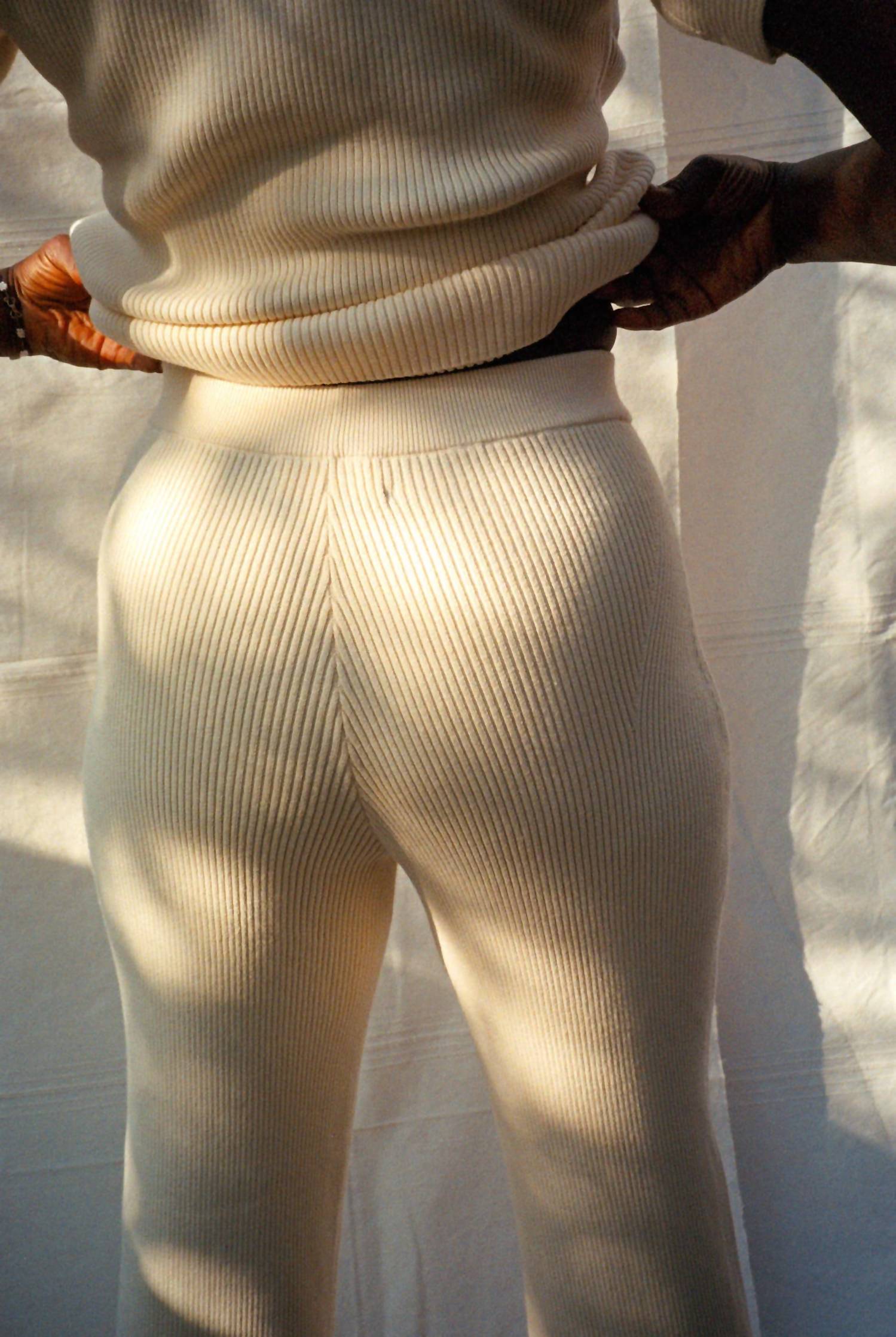 The trend report says boot-cut is in and that's exactly why we love this style. They are fit to perfection, flattering on any body type, and comfortable. They will be your go-to all season long. Introducing the Nia Thomas Hombre Pants in elegant Ivory, designed to offer both style and comfort. These high-rise, relaxed-fit pants feature a flared leg and are crafted from a cotton blend with textured detailing that enhances the overall chic appearance. With a convenient pull-on closure and no pockets, they are perfect for effortless dressing during fall occasions. Care for them by machine washing and line drying to maintain their quality.