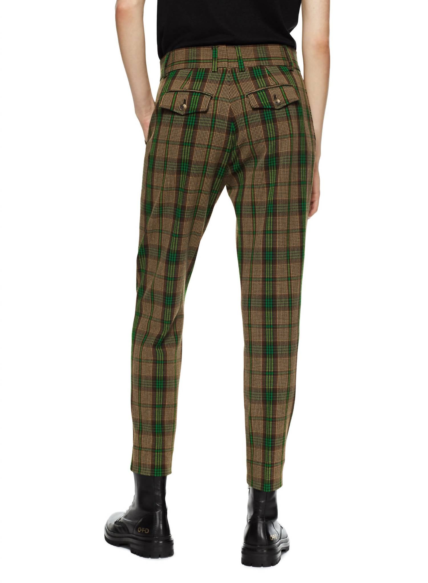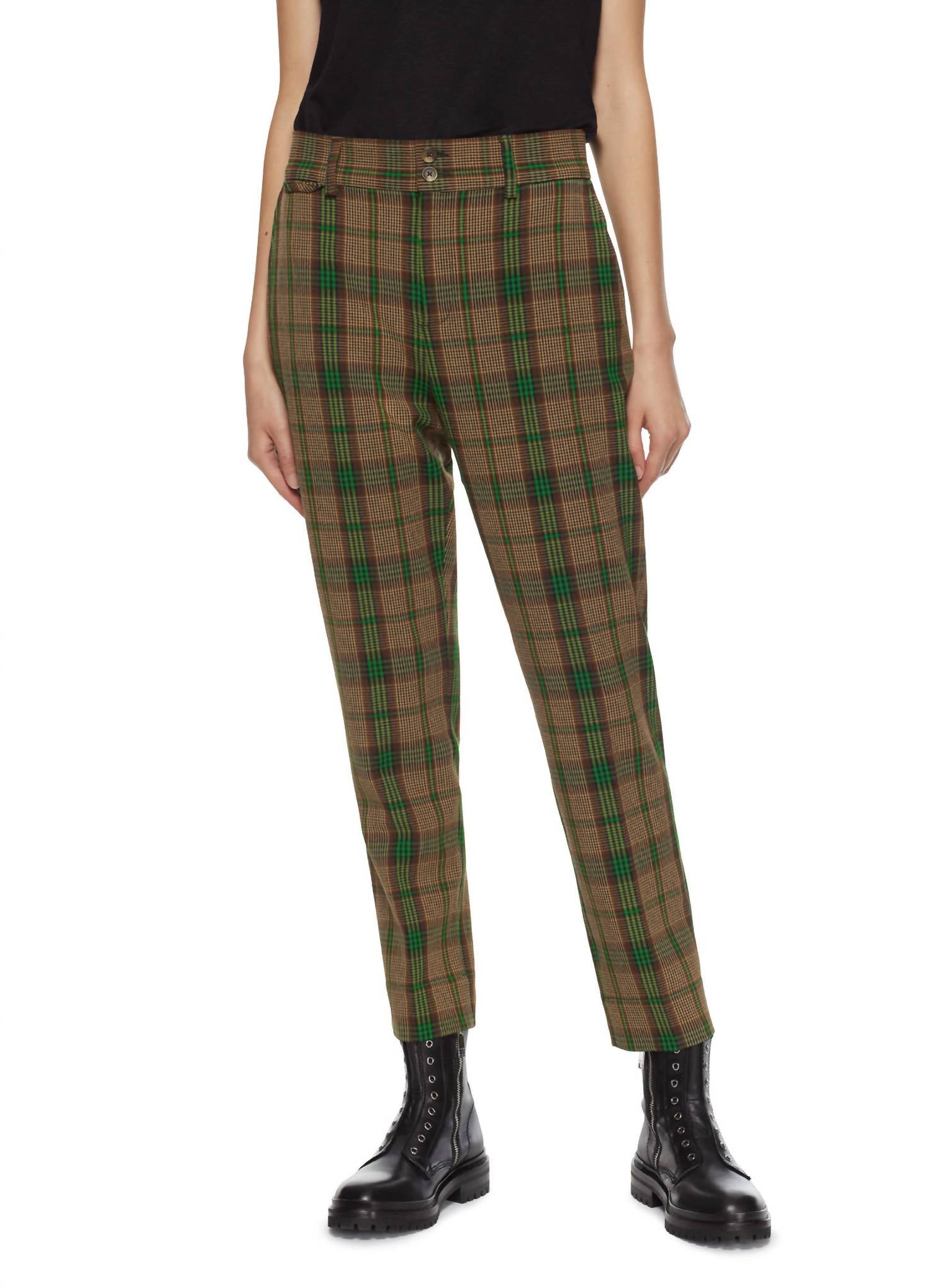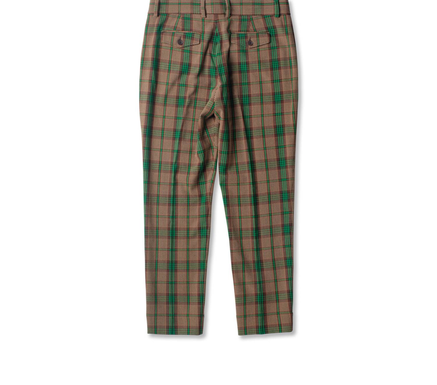 Estas calças apresentam um sofisticado padrão xadrez e xadrez em marrom multicolorido, com um corte afunilado que valoriza a silhueta. Confeccionadas com um elástico sutil, oferecem conforto o ano todo. Contam com um prático fecho de zíper e bolsos práticos.
