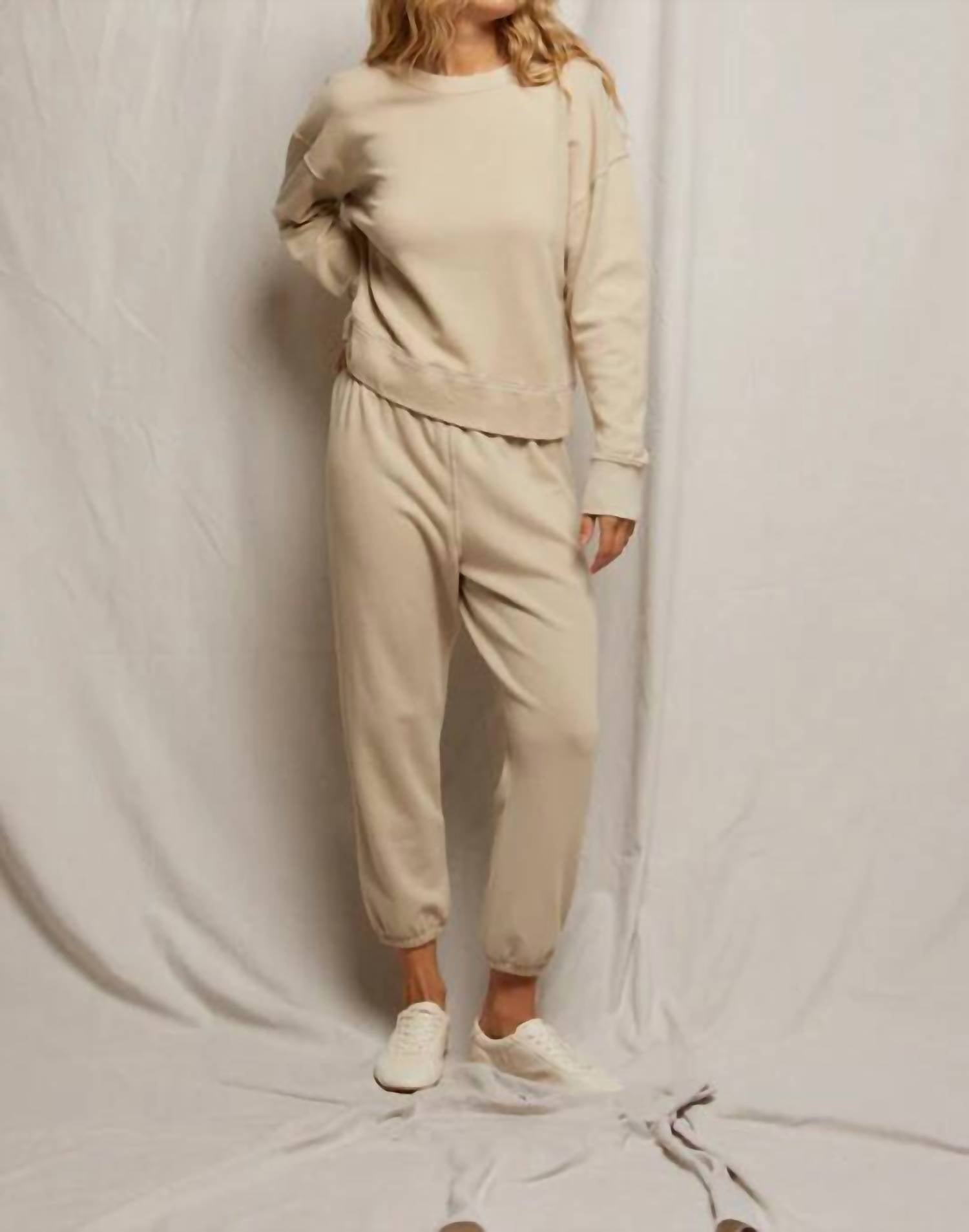 No gym necessary for these cool-girl joggers. Experience ultimate comfort with the Johnny Easy Sweatpant by perfectwhitetee, an ideal choice for both casual outings and relaxed days at home. These putty-colored sweatpants are crafted from high-quality 100% cotton, featuring a relaxed, low-rise fit with tapered legs. Designed with a convenient tie closure, these joggers ensure easy movement without sacrificing style. Care instructions recommend a gentle machine wash, avoiding bleach and spot treatments, followed by a low tumble dry.