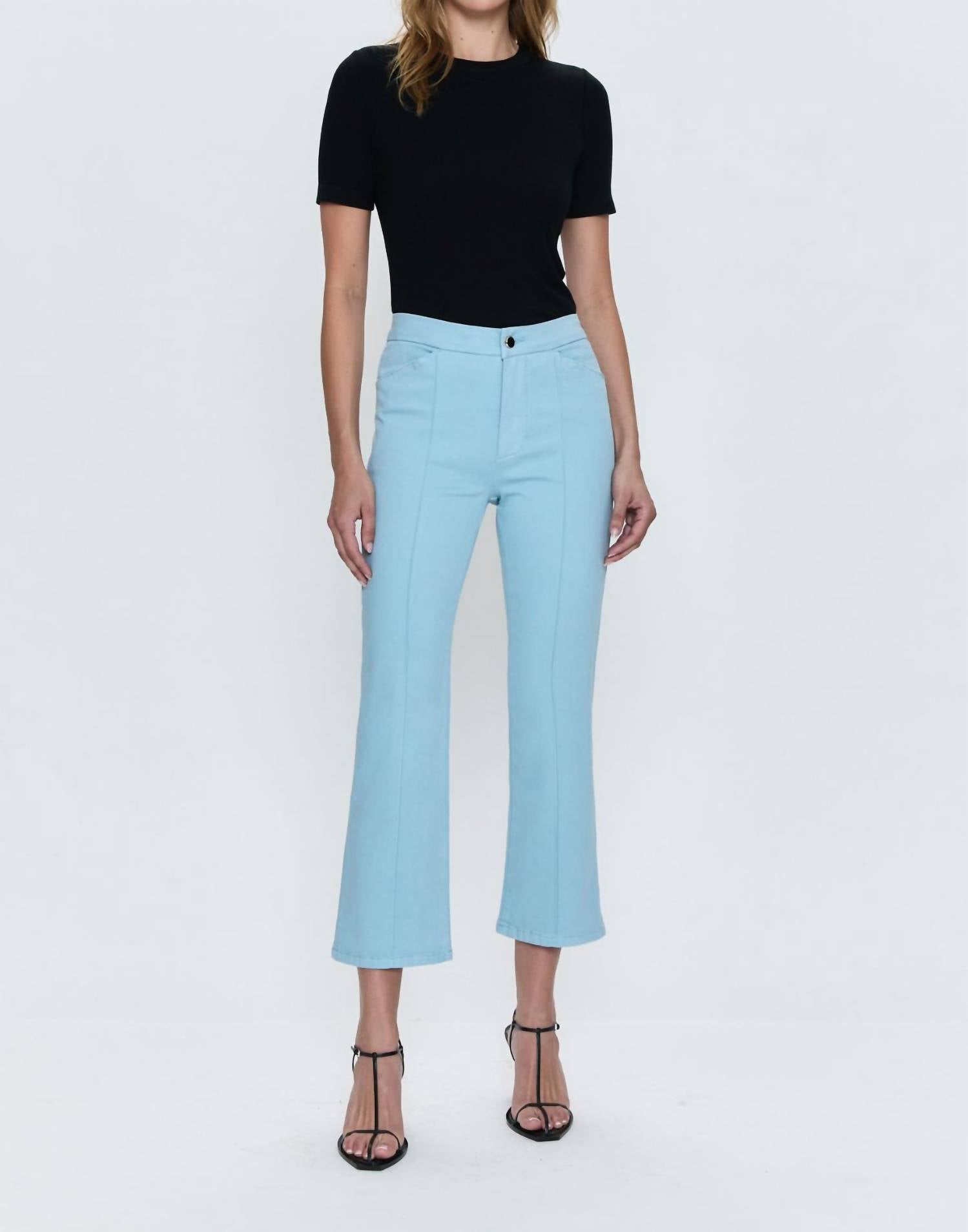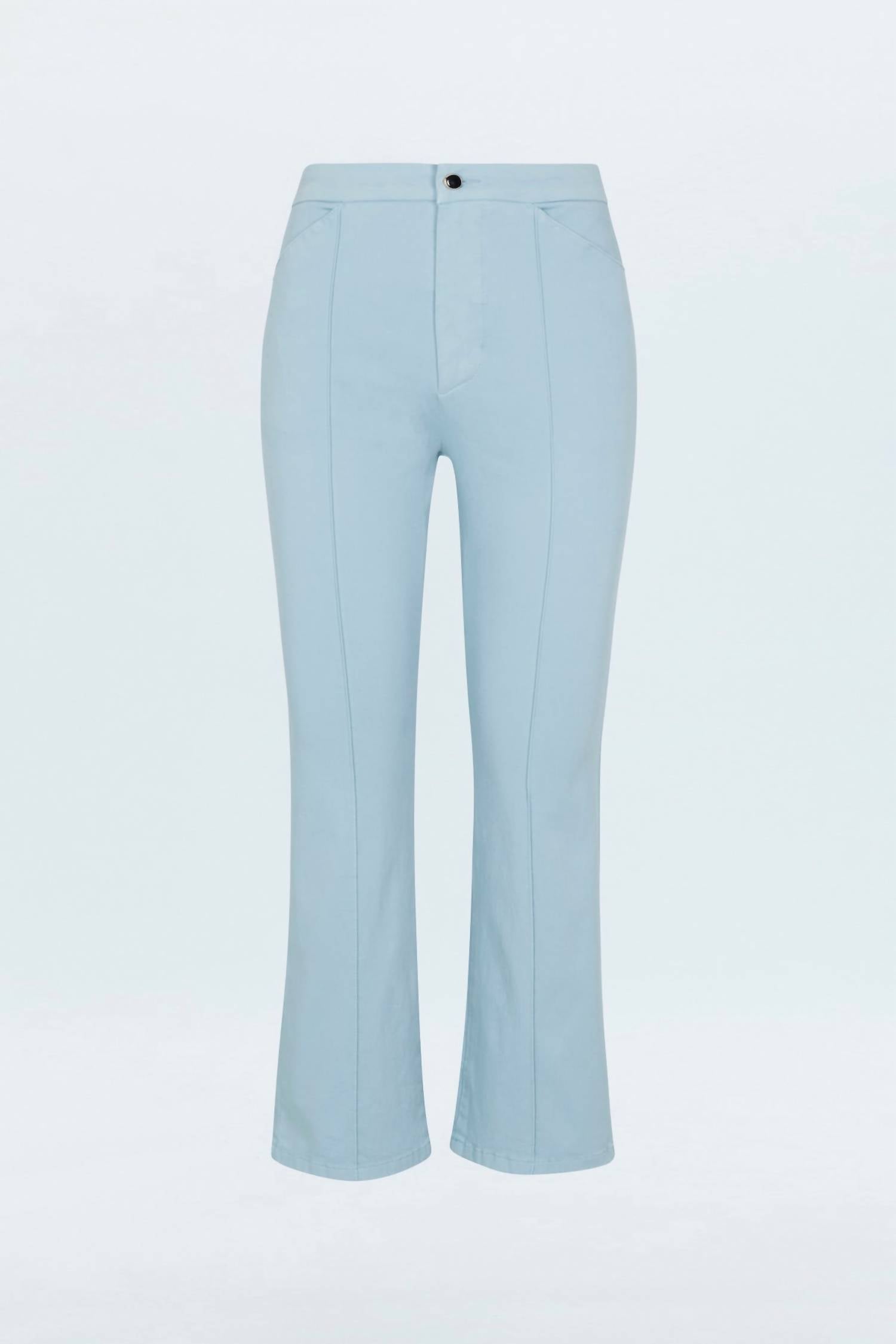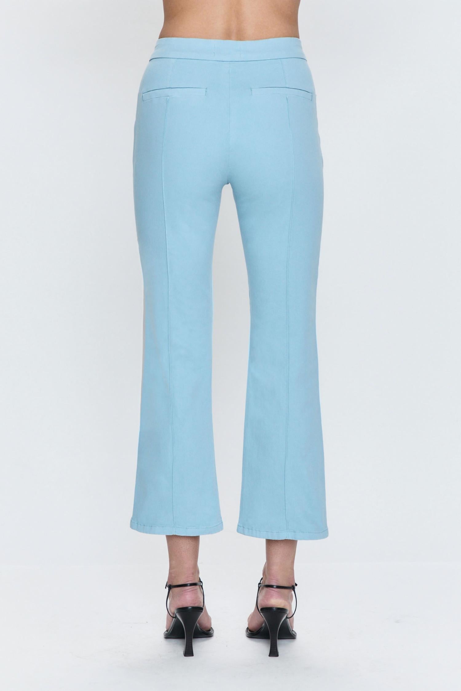 Apresentamos a Calça Flare Simone Kick da Pistola, confeccionada em mistura de algodão na cor Frost Blue, um tom frio. Com cós médio e 68 cm de comprimento, esta calça oferece um material leve e elástico, com caimento justo e estilo boca de sino. Com detalhes de costura franzida e bolsos frontais e traseiros funcionais, a calça combina estilo e praticidade com eficiência. Fechamento: Abotoamento. Cuidados: Lavar à máquina.