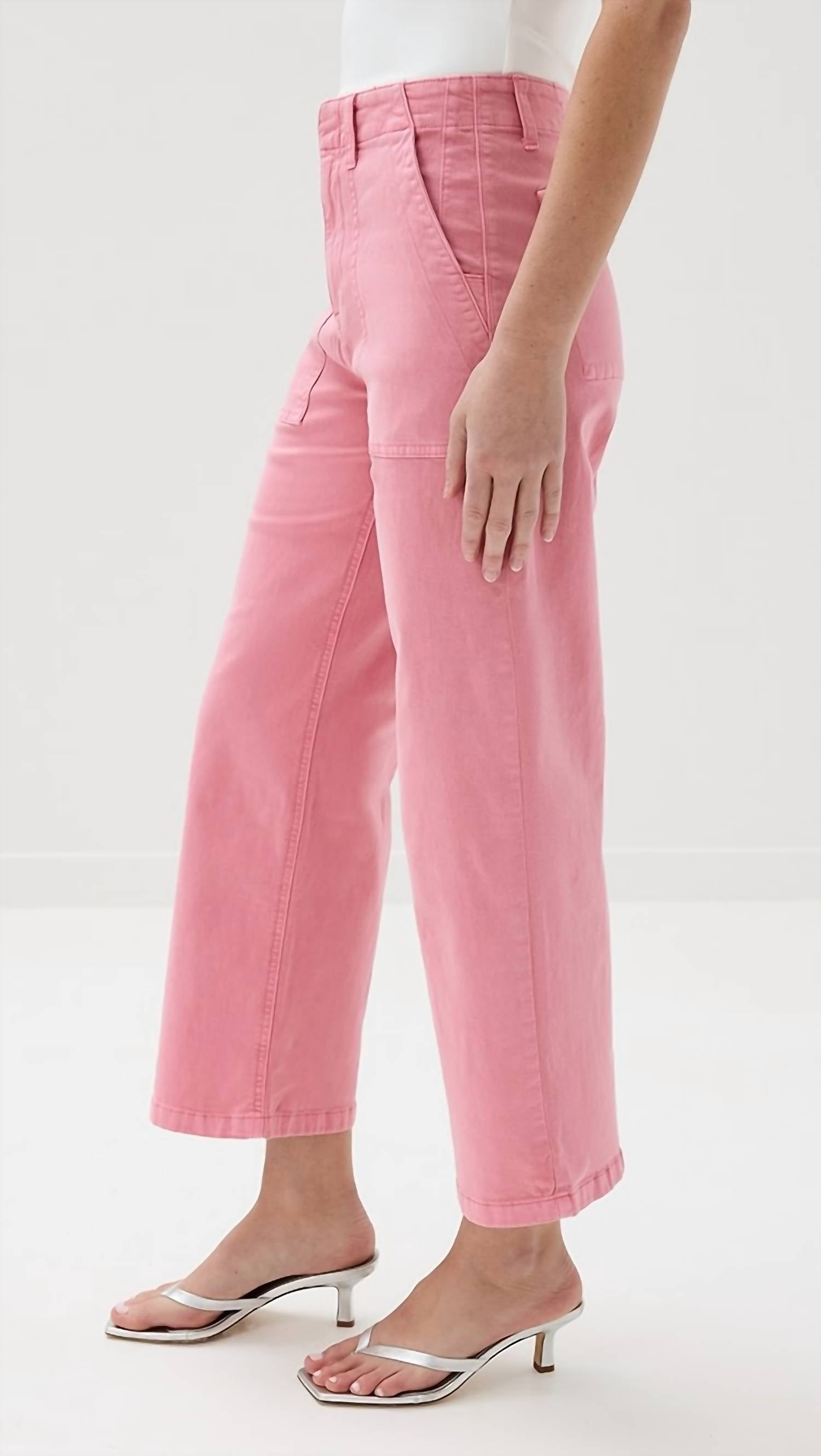 Apresentamos a Calça Larga Sophia Twill da PISTOLA, sua nova peça-chave para um conforto elegante em Rosa Peônia. Esta calça larga e de cintura alta apresenta um corte largo com bainha curta até o tornozelo e costura interna de 66 cm. Confeccionada em uma mistura de algodão elástico com 98% algodão e 2% elastano, o design inclui bolsos frontais práticos e bolsos traseiros com aba e botões, enfatizando a inspiração utilitária. Fechamento: Fechamento por botão. Cuidados: Lavar à máquina.