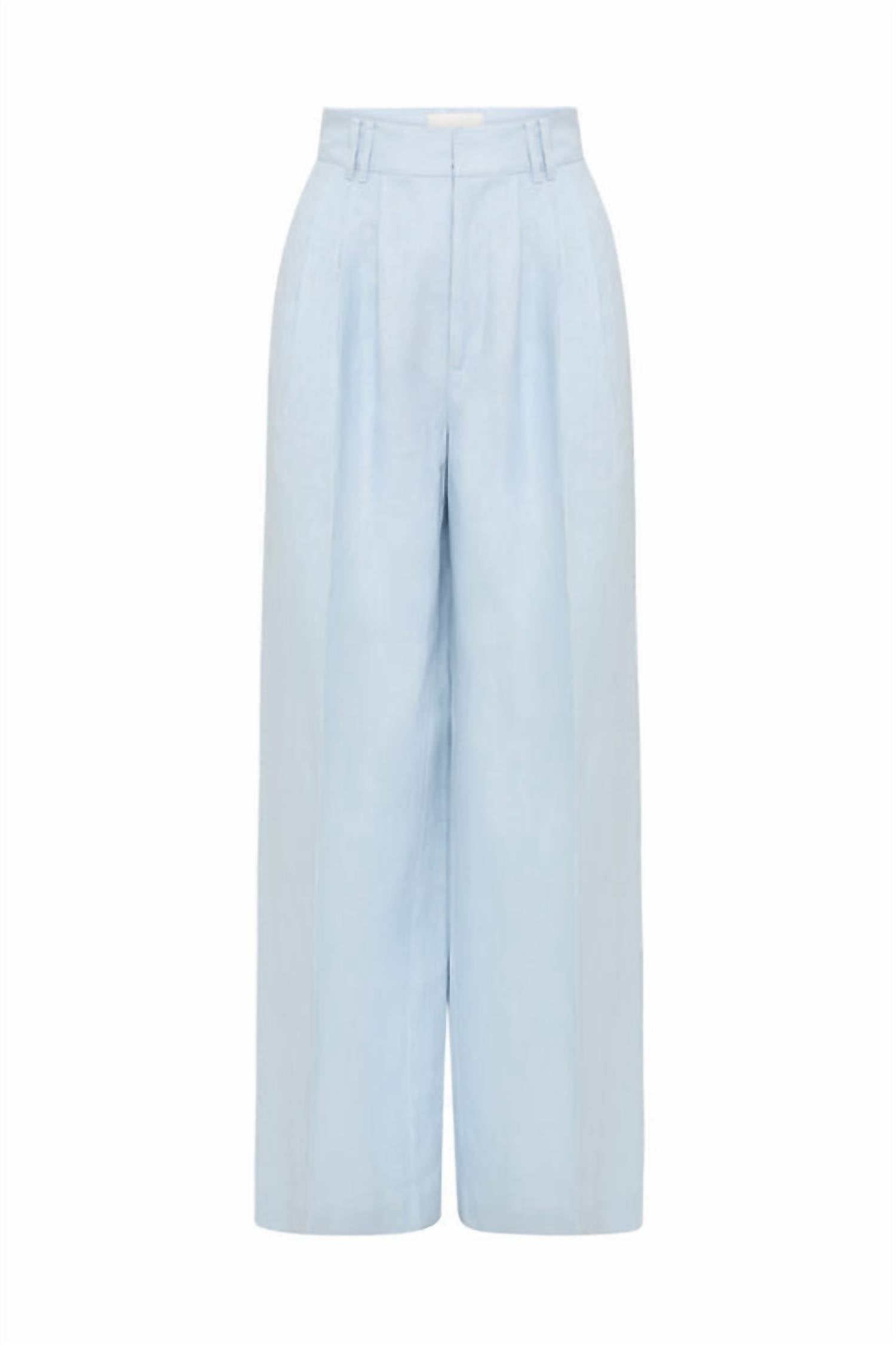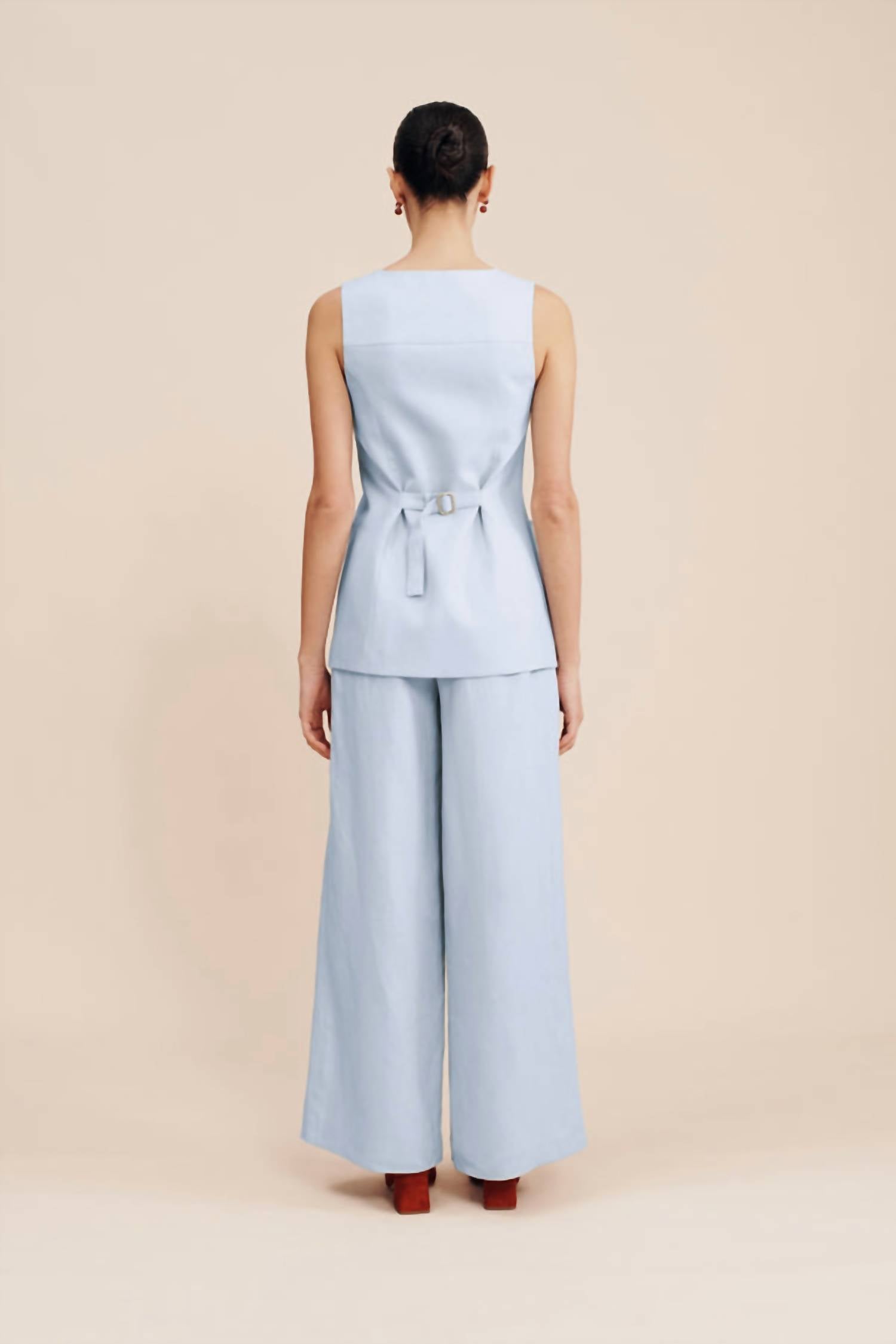 Discover the Parker Trousers in Silver Blue by POSSE, crafted from 100% airy, certified linen for a comfortable, stylish look. These high-rise trousers feature a relaxed fit with a wide-leg style, complete with side seam pockets for added functionality. The design includes front pleats, double hook and bar opening, and a concealed center front fly zip for an elegant finish. Ideal for a minimalist, summer ensemble, either paired with the matching Lorenzo Vest or a simple tank.
