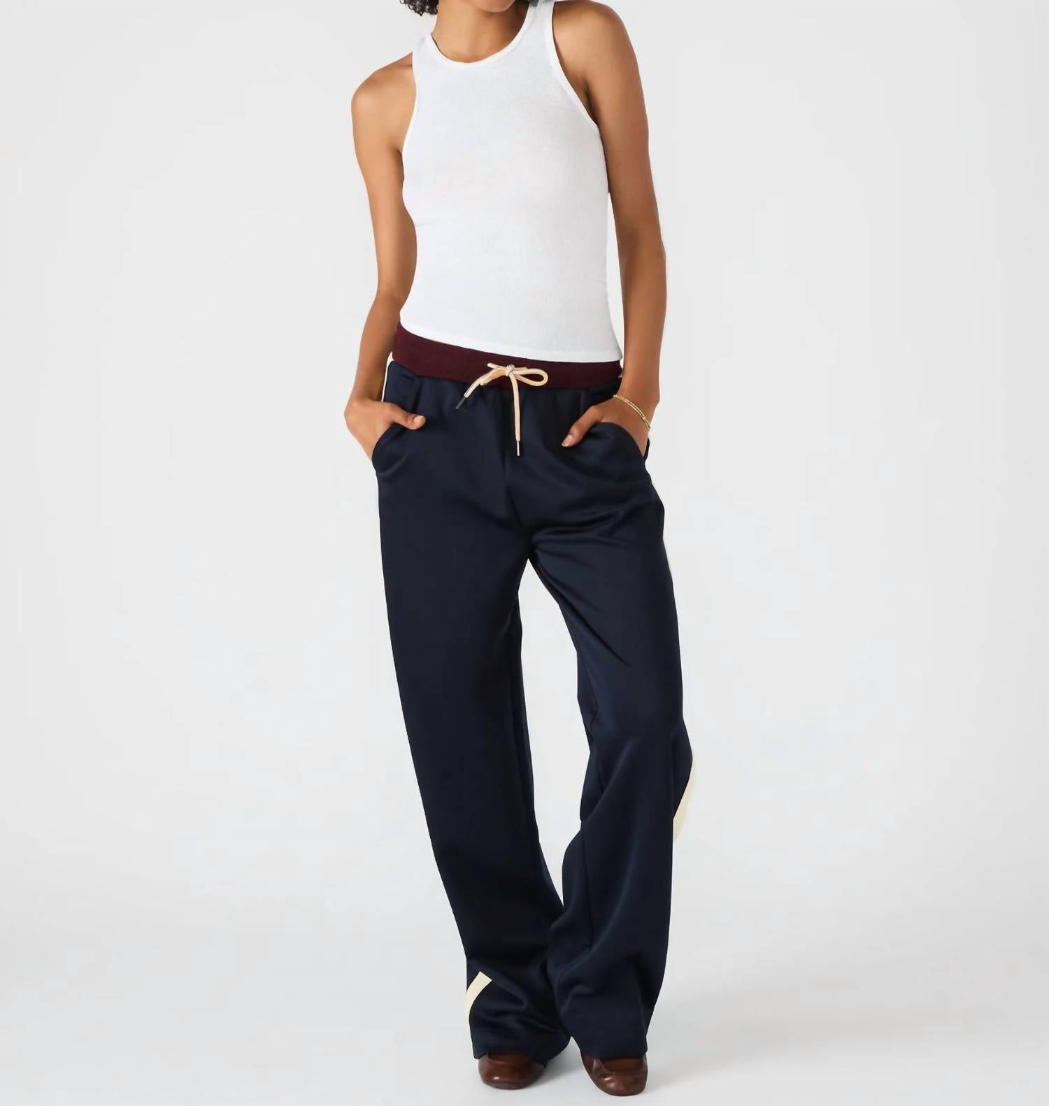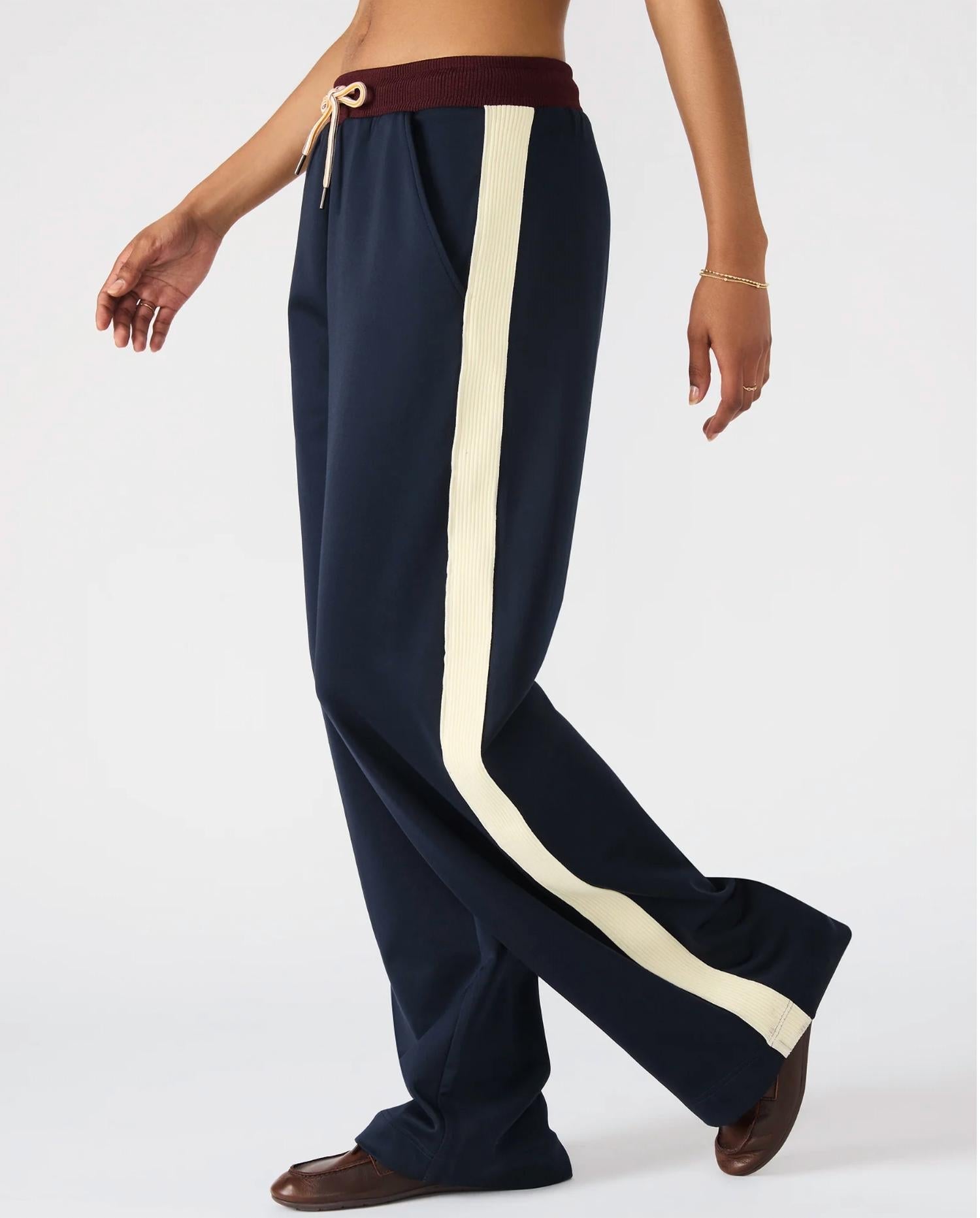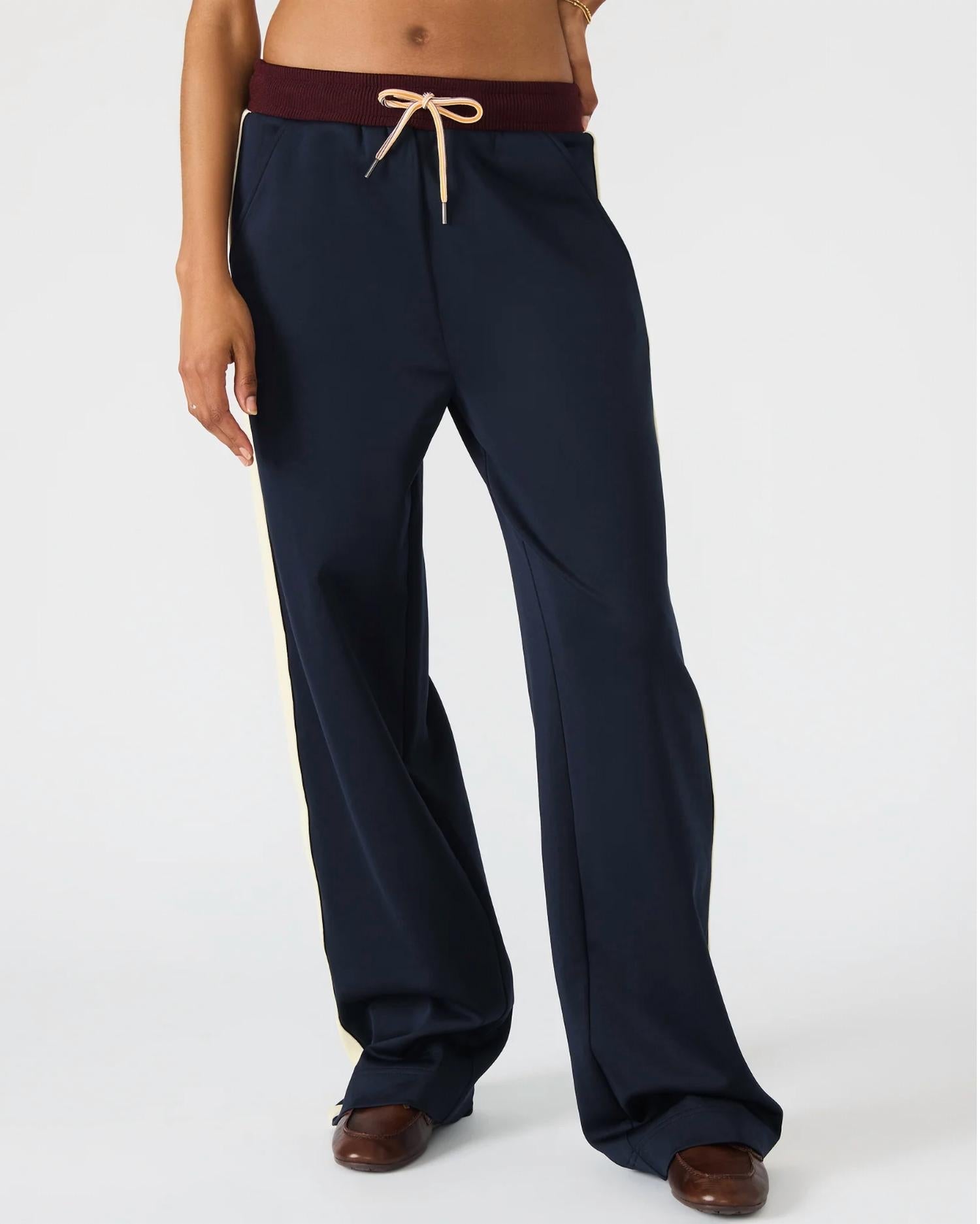 The perfect pant for running around town and looking cool while doing it. Upgrade your athleisure wardrobe with the Women's Daisy Athletic Track Pants by Steve Madden. These stylish black track pants feature a modern tie-front closure and stripe pattern, enhancing both aesthetics and functionality with two functional front pockets. Crafted from 64% polyester, 31% cotton, and 5% spandex, these pants offer comfort and flexibility for your active lifestyle. Imported and designed for ease of care, these pants require hand washing to maintain their look and feel. Charlotte, who is 5'8.5", wears a size small, demonstrating the comfort fit of this dynamic piece.
