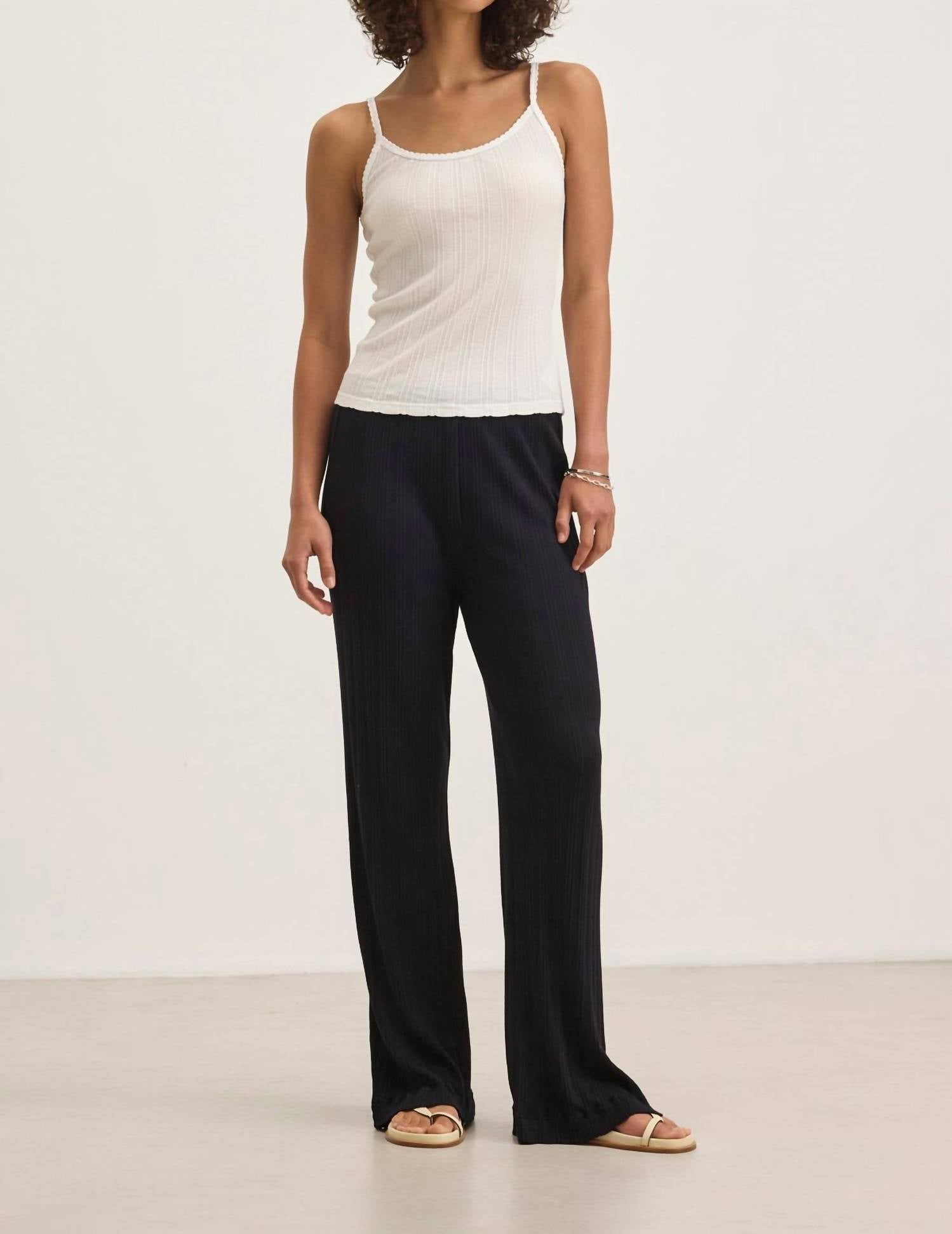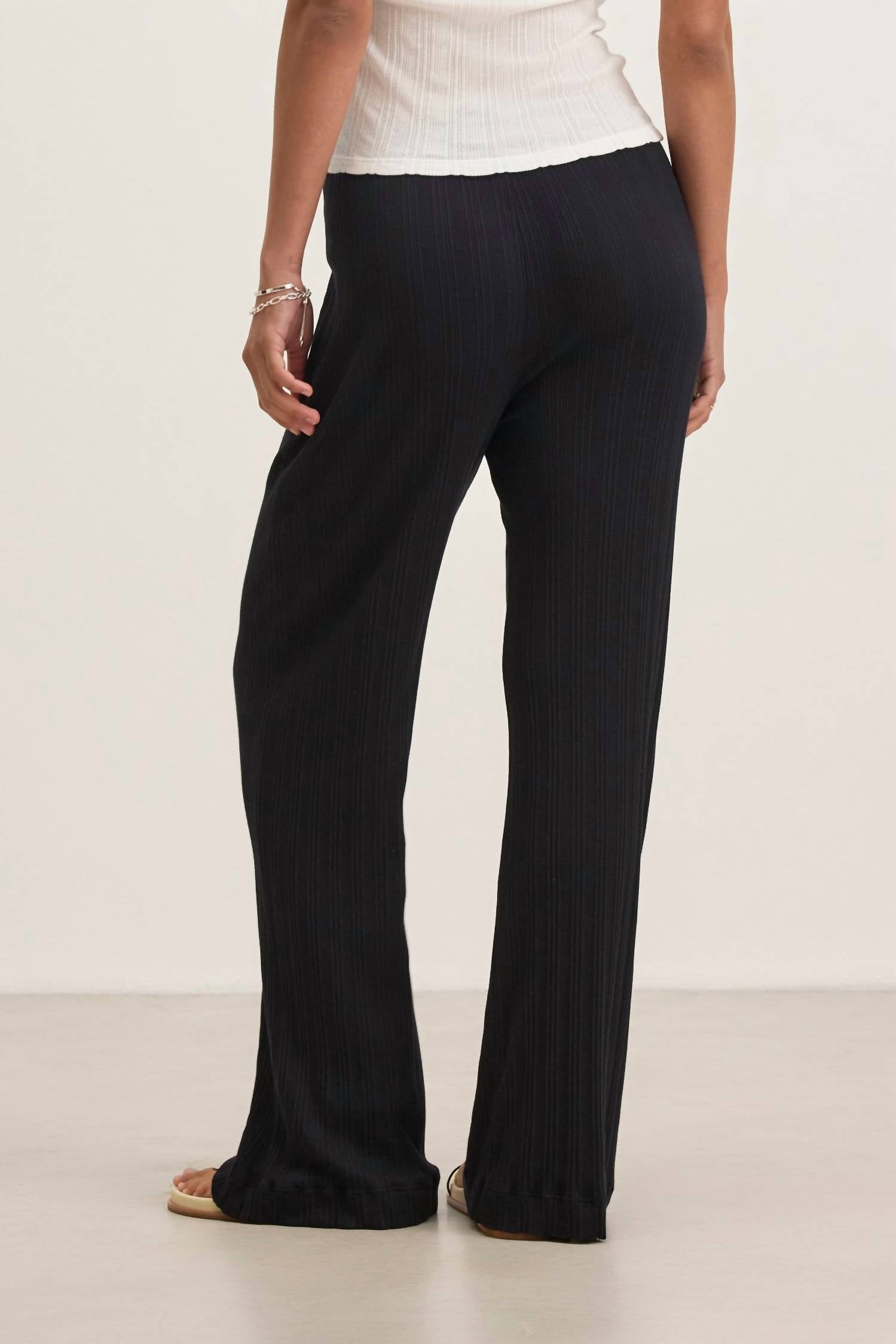 Calças levemente flare estão na moda agora, e estas não são exceção. Combine-as com sua camiseta favorita para um look mais casual ou com sua blusa de botões favorita para uma saída à noite. Descubra a Calça Alemi Pointelle da Velvet by Graham & Spencer, criada para um look minimalista e pronto para viagens. Esta calça é feita nos EUA com uma mistura macia de algodão e modal, com detalhes canelados em pointelle e uma elegante perna larga. Projetada com cós elástico para um fecho de puxar confortável e sem esforço, garante um ajuste confortável e relaxado, sem bolsos. Cuidados: Lavar à máquina. Ideal para uma renovação de guarda-roupa de primavera em preto clássico e perfeita para qualquer viagem cheia de estilo.