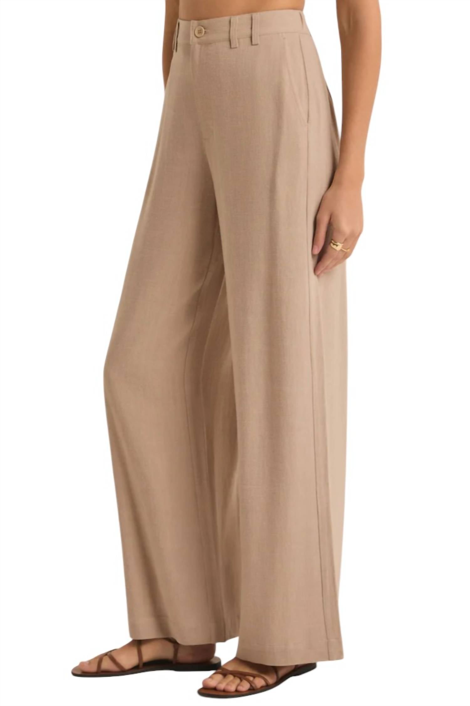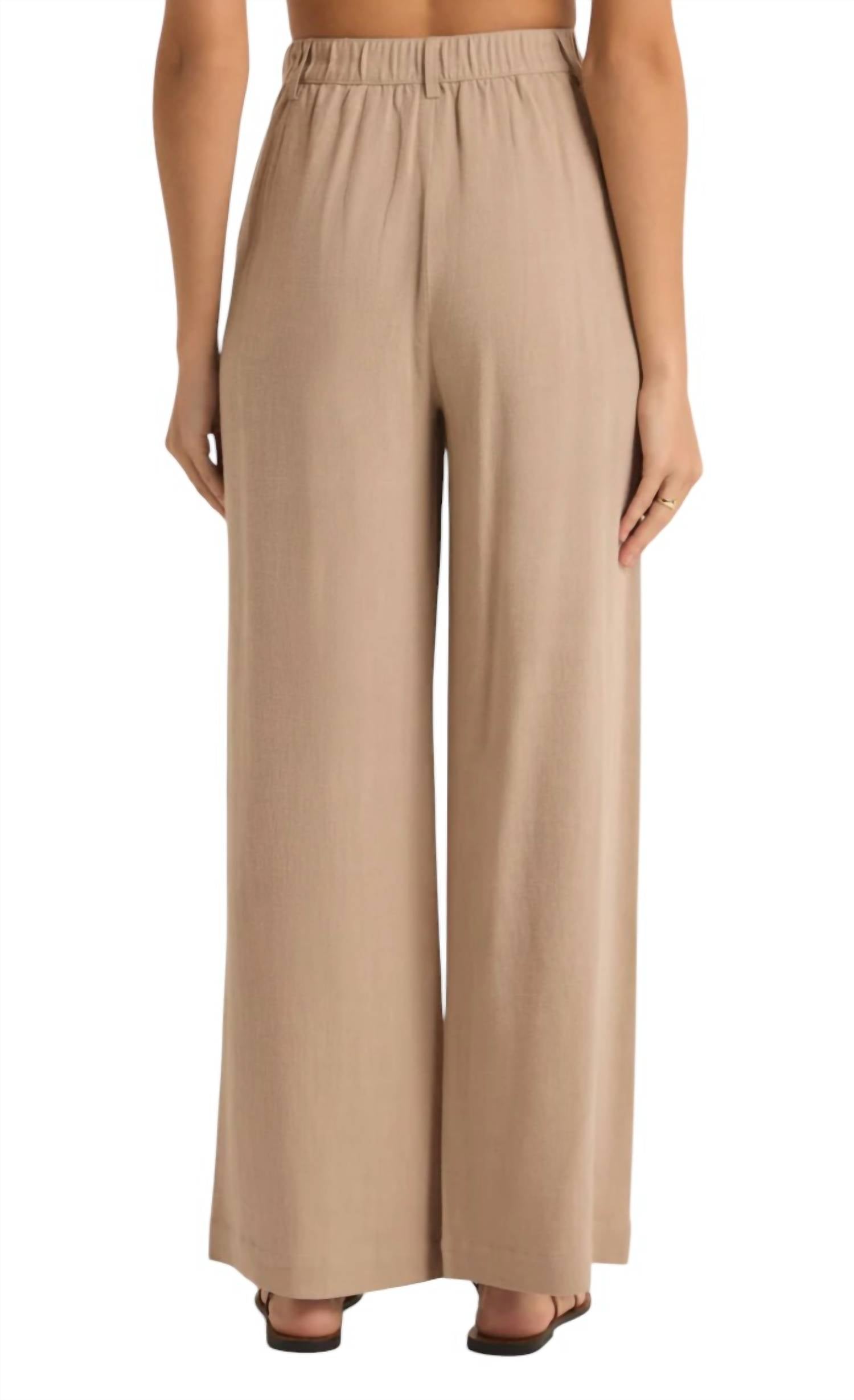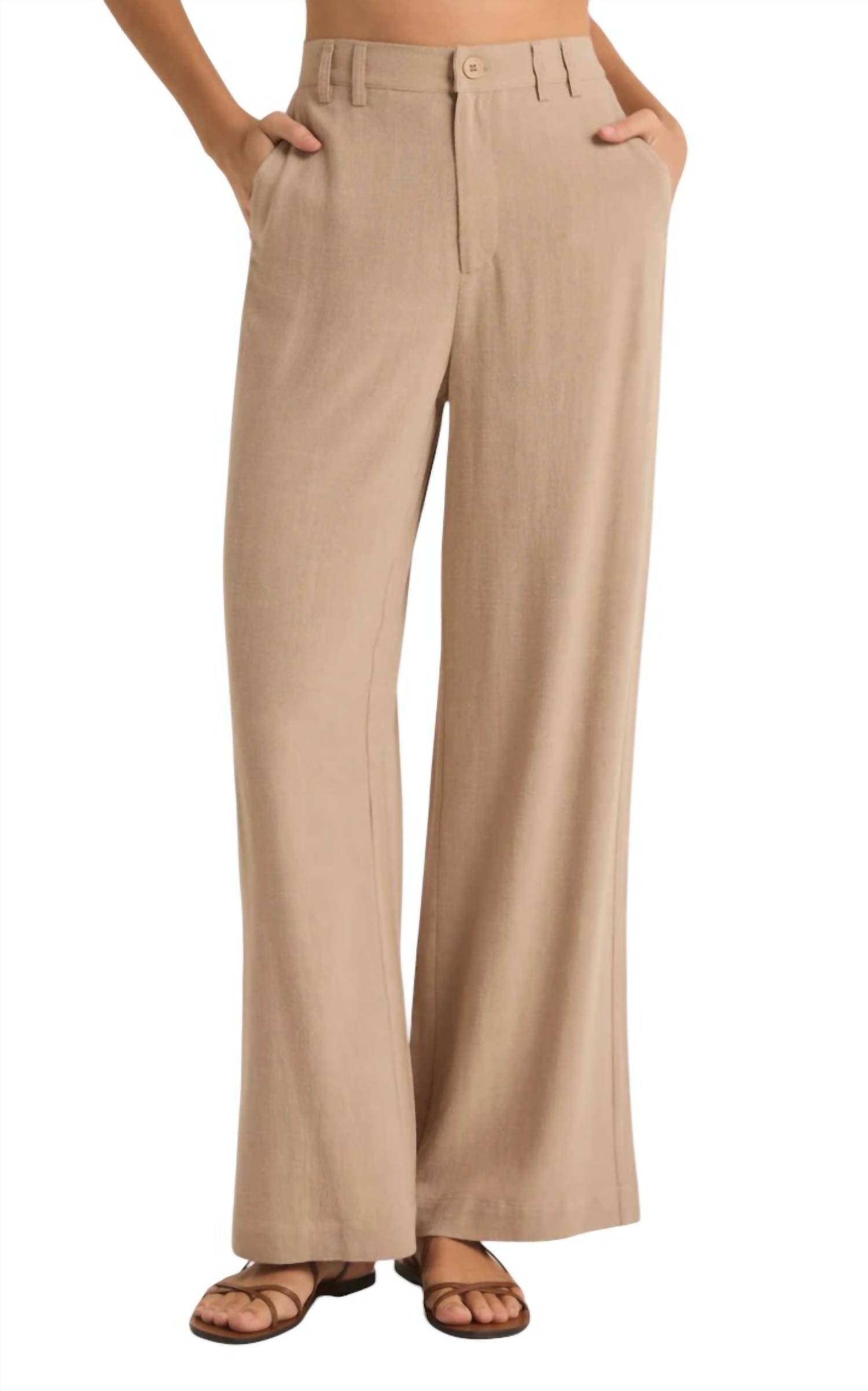 A Calça Micah da Z Supply é uma peça versátil e essencial para qualquer ocasião. Esta calça longa e de cintura alta possui zíper frontal, passantes para cinto e bolsos laterais, além de bainha larga. Confeccionada em 86% rayon e 14% linho, é perfeita para um brunch ou um café. A modelo veste tamanho P.