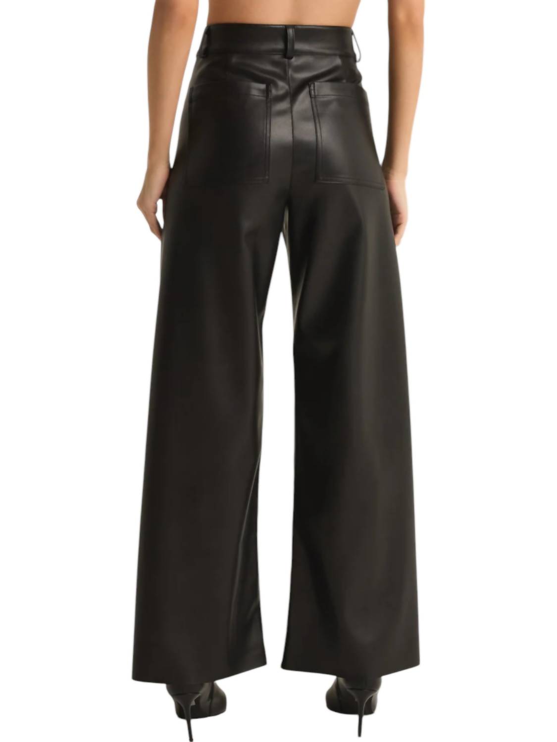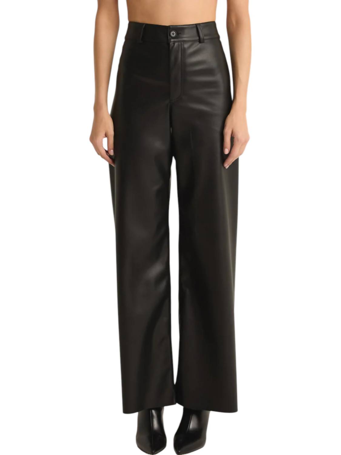 Couro sintético Butter Touch. Cintura alta e comprimento total. Braguilha com zíper e botão. Bolsos traseiros. 100% poliuretano. Limpe com facilidade ou lave à mão com detergente neutro.