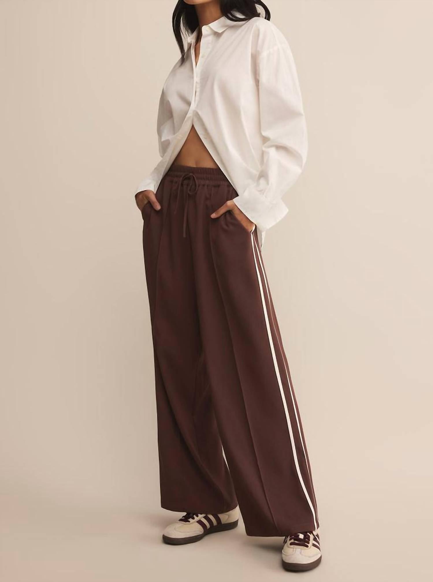 Experience the effortless elegance of the Saunder Track Pant by Z Supply, crafted from breathable crinkle woven fabric in a stylish Sandalwood hue. Featuring a high-rise, elastic waistband, and tie closure, these wide-leg pants are both comfortable and chic with a standout stripe detail at the seams. Made from 100% Modal, they offer full-length coverage at 40.5 inches. For care, hand wash cold and hang to dry or opt for dry cleaning. Alyssa is wearing a medium.
