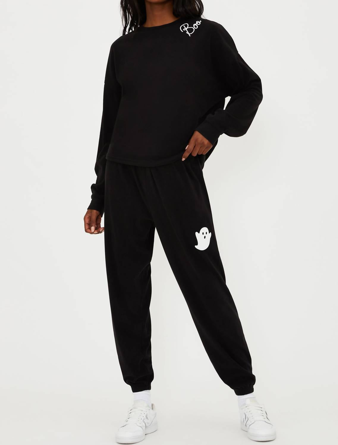 Leggings you can dress up or down for any occasion. Introducing the Georgie Sweatpants by Beach Riot, a playful addition to your casual wardrobe in Boo Black. Crafted from a blend of 92% polyester and 8% spandex, these sweatpants feature a fun ghost graphic pattern. Designed with a regular fit and a tapered leg style with practical pockets, they ensure both comfort and style. Closure: Pull-on. Care: Machine wash and lay flat to dry. Ideal for women seeking a minimalist and cheeky design, perfect for Halloween or a dinner party this winter.