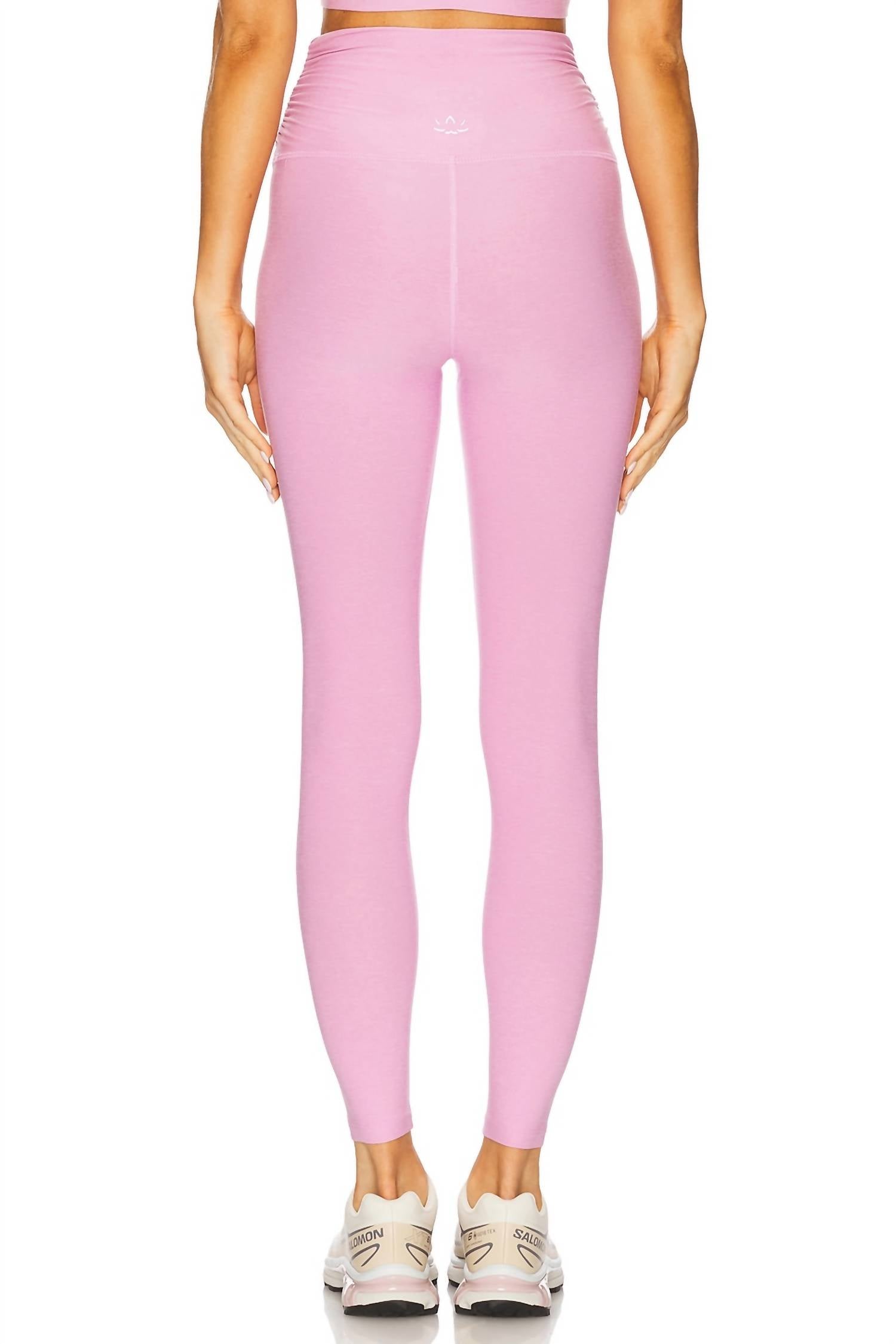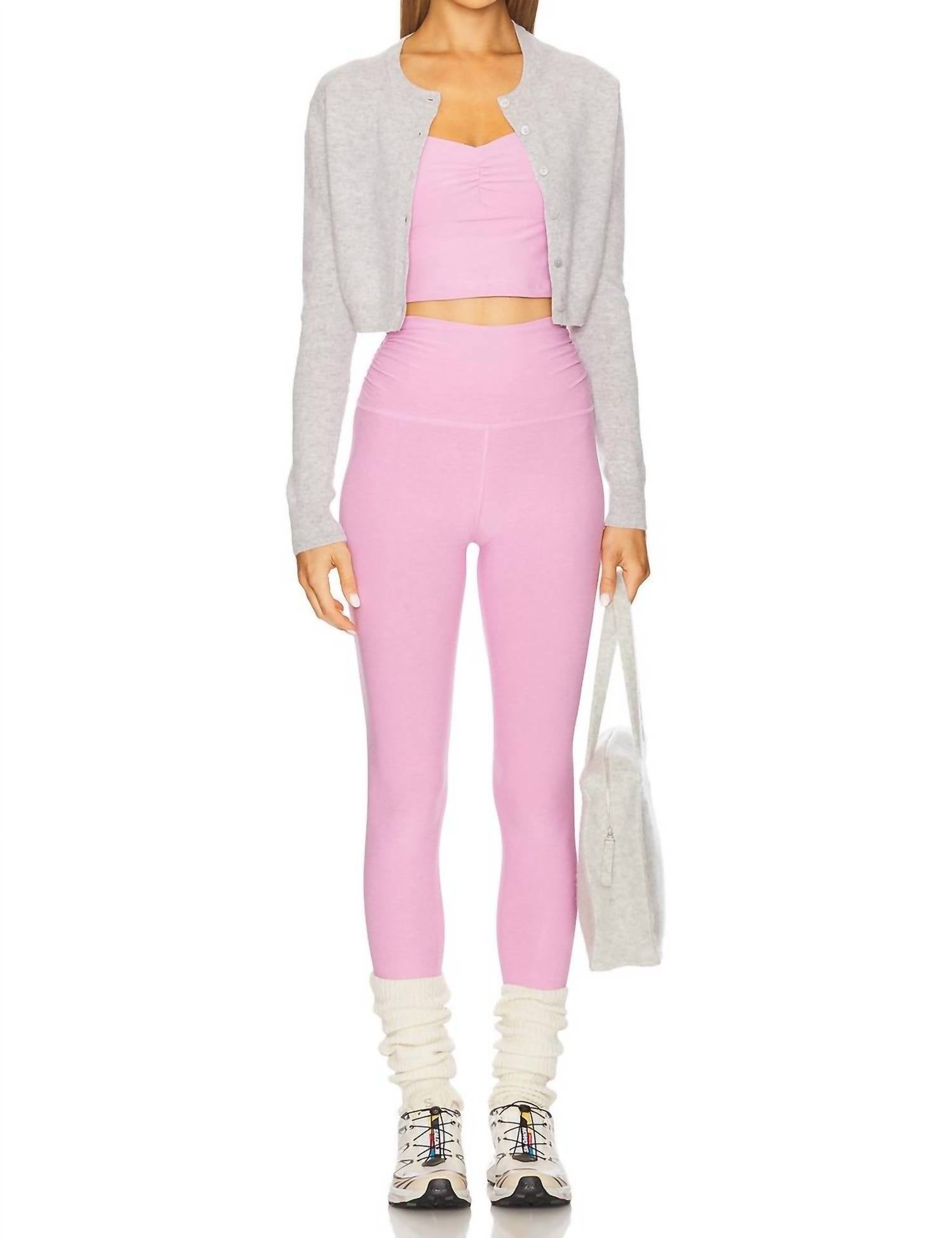 Eleve seu guarda-roupa de treino com a Legging BEYOND YOGA Caught Spacedye Raise The Barre com franzidos na cor Pink Haze Heather, uma referência estilosa ao estilo barre e ballet. Esta legging slim fit apresenta comprimento midi com 61 cm de costura interna, cós alto de 30 cm e franzido elegante nas laterais para um toque de estilo. Confeccionada em uma mistura de 87% poliéster e 13% elastano, esta legging oferece um estilo de sustentação com cós elástico, garantindo conforto e flexibilidade em cada movimento. Feita nos EUA com tecido jersey elástico, ela pode ser lavada na máquina e deve ser seca na horizontal, tornando-a uma peça esportiva ideal para o Dia dos Namorados ou qualquer ocasião fitness.