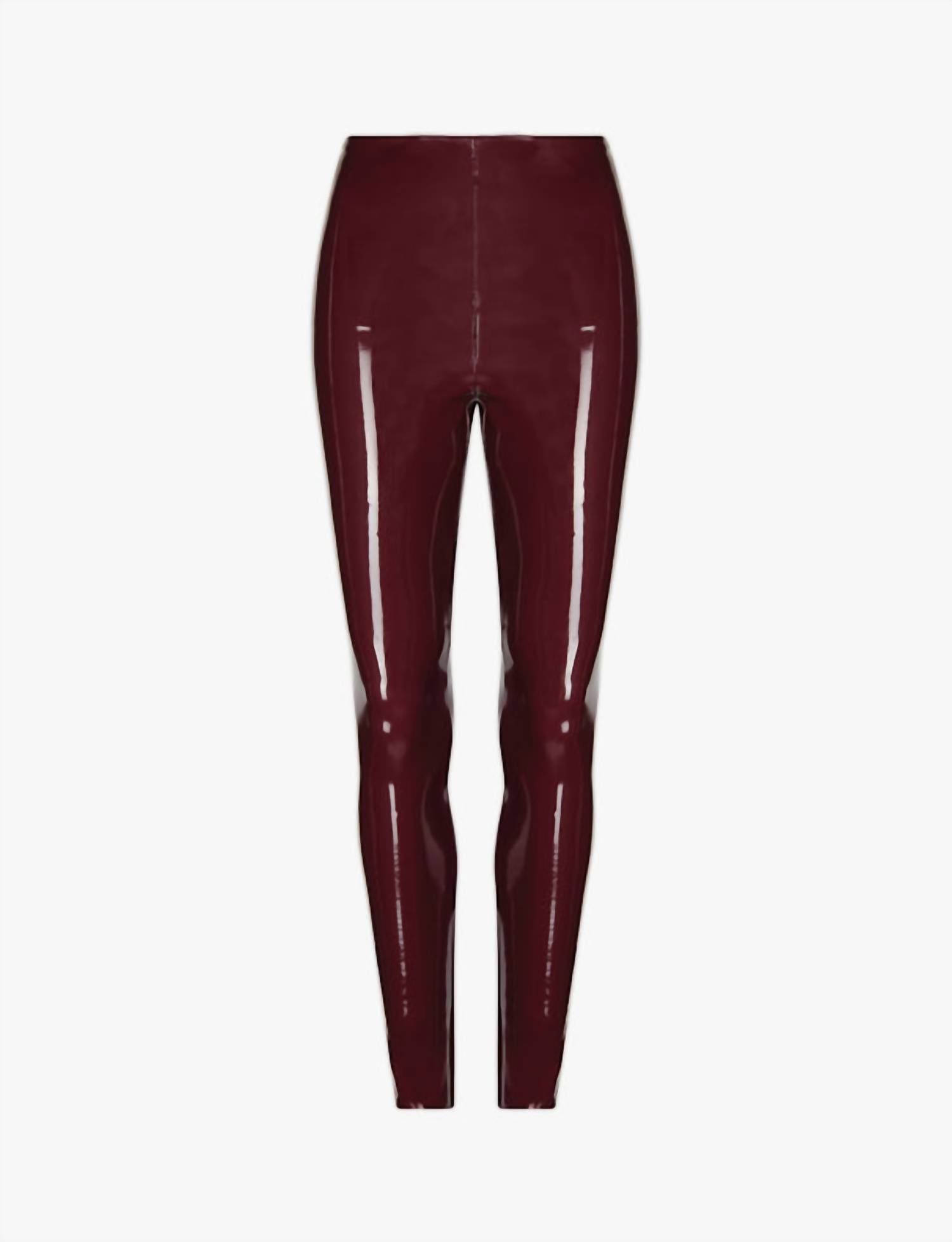 Discover the sleek comfort of the Burgundy Faux Patent Leather Leggings by Commando, a stylish addition to your wardrobe perfect for a preppy, Holiday Party look. Crafted in the USA with a faux patent leather body (97% viscose, 3% elastane with polyurethane coating) Waistband (72% nylon, 28% elastane), these leggings feature a high rise and a slim fit with a skinny leg design. Closure: Pull on. Care: Machine wash, line dry. Experience all-day confidence with our internal waistband technology and smoothing, firming fabric, sized with a 29.375-inch inseam and an 11.75-inch rise, offering perfect stretch recovery.