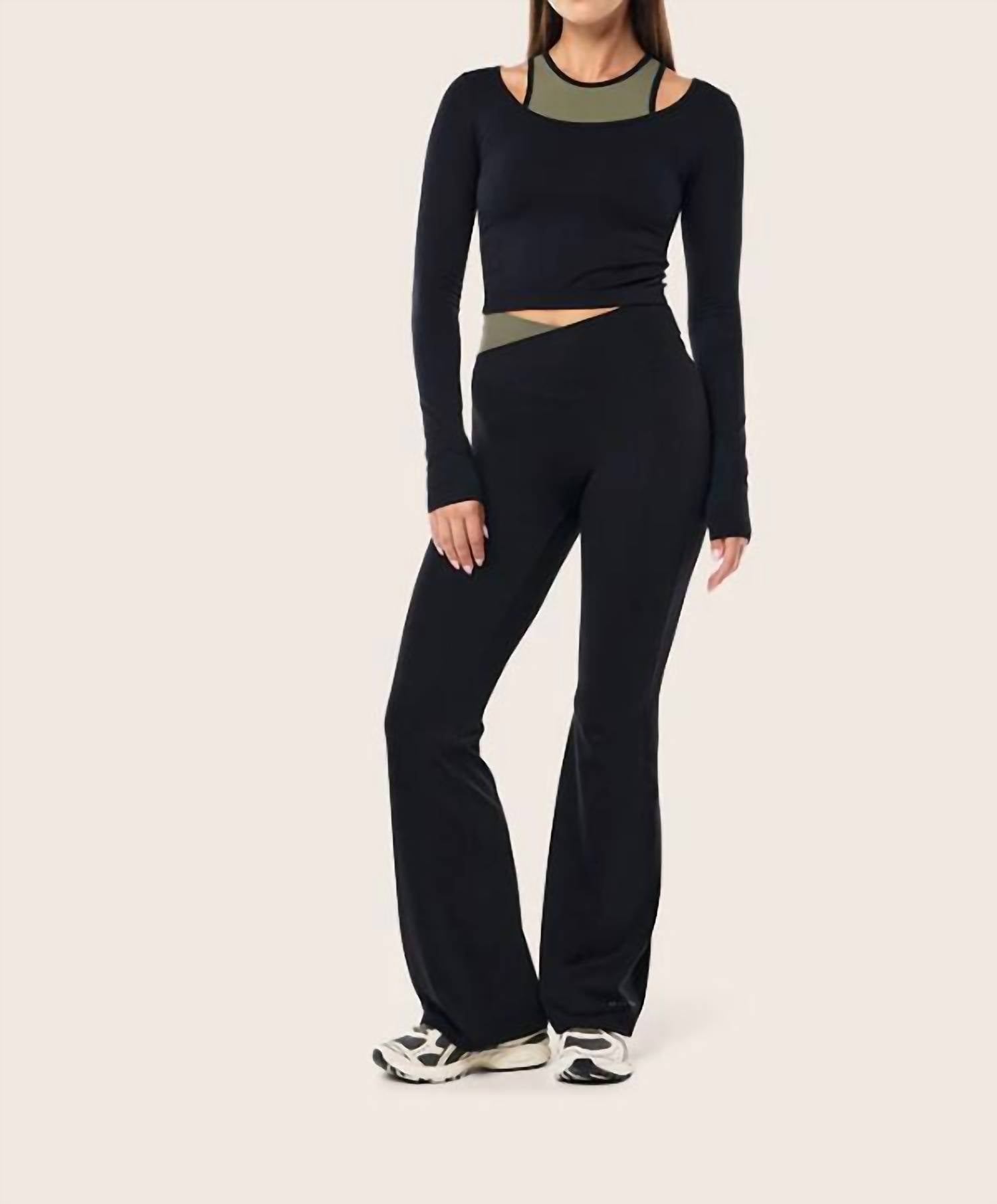Leggings you can dress up or down for any occasion. Elevate your activewear collection with the Wander Flare Legging by P.E. NATION in Black & Dusty Olive, designed for comfort and style. This high-rise, full-length legging features a relaxed, flared leg fit, crafted from a nylon blend using the brand's Studio Soft fabrication for a lightly peached, matte finish. The folded double-layer V waistband is accented by contrast P.E. Nation branding, adding a stylish touch to your workout ensemble. Care instructions include a cold gentle machine wash inside-out and line drying in the shade to maintain the legging's quality and appearance. 82% Nylon, 18% Elastane.