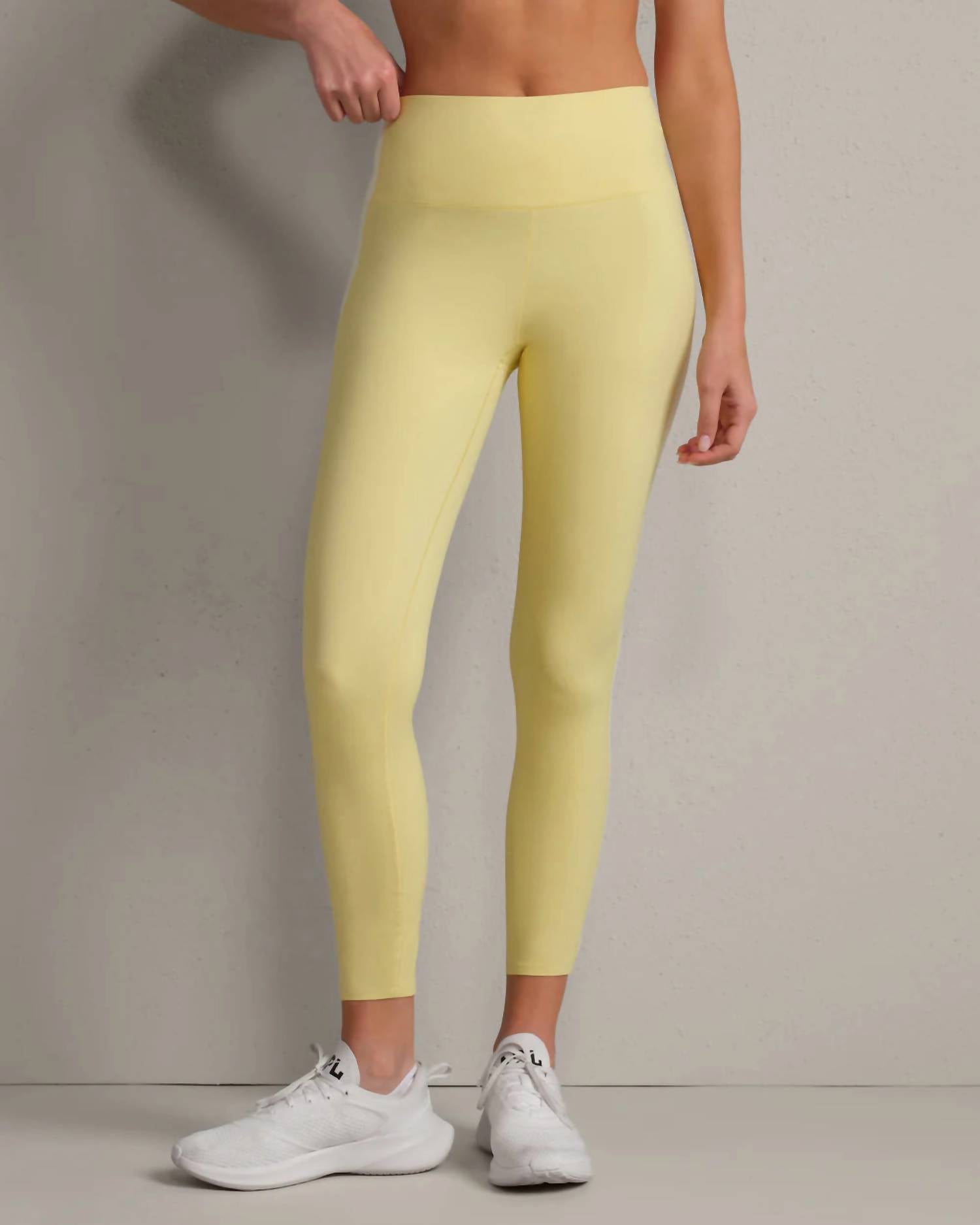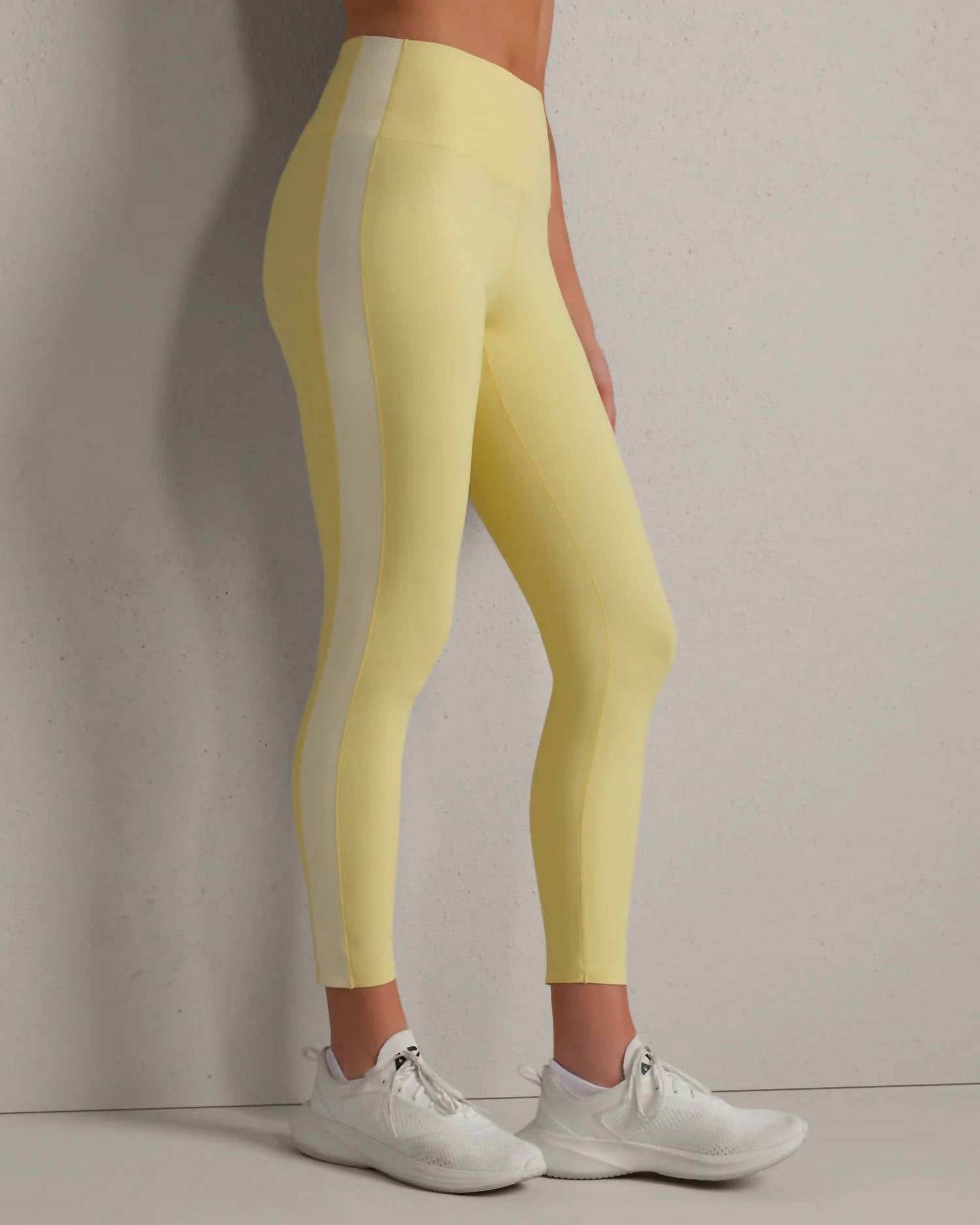 Introducing the RHONE ReviveForm Color Block 7/8 Legging, a perfect blend of style and performance in a vibrant yellow hue. Designed with a high-rise waist and a slim fit through the skinny leg, these leggings offer support without restriction, thanks to the midweight stretch fabric made from recycled polyester and Lycra. These pull-on leggings feature a wide double-layer waistband with soft elastic and side drop-in pockets to fit most phones, enhanced with GOLDFUSION® Anti-Odor Technology and UPF 50+ sun protection. Care is effortless with machine wash instructions, tumble dry low—avoid bleach, fabric softener, ironing, or dry cleaning for longevity.