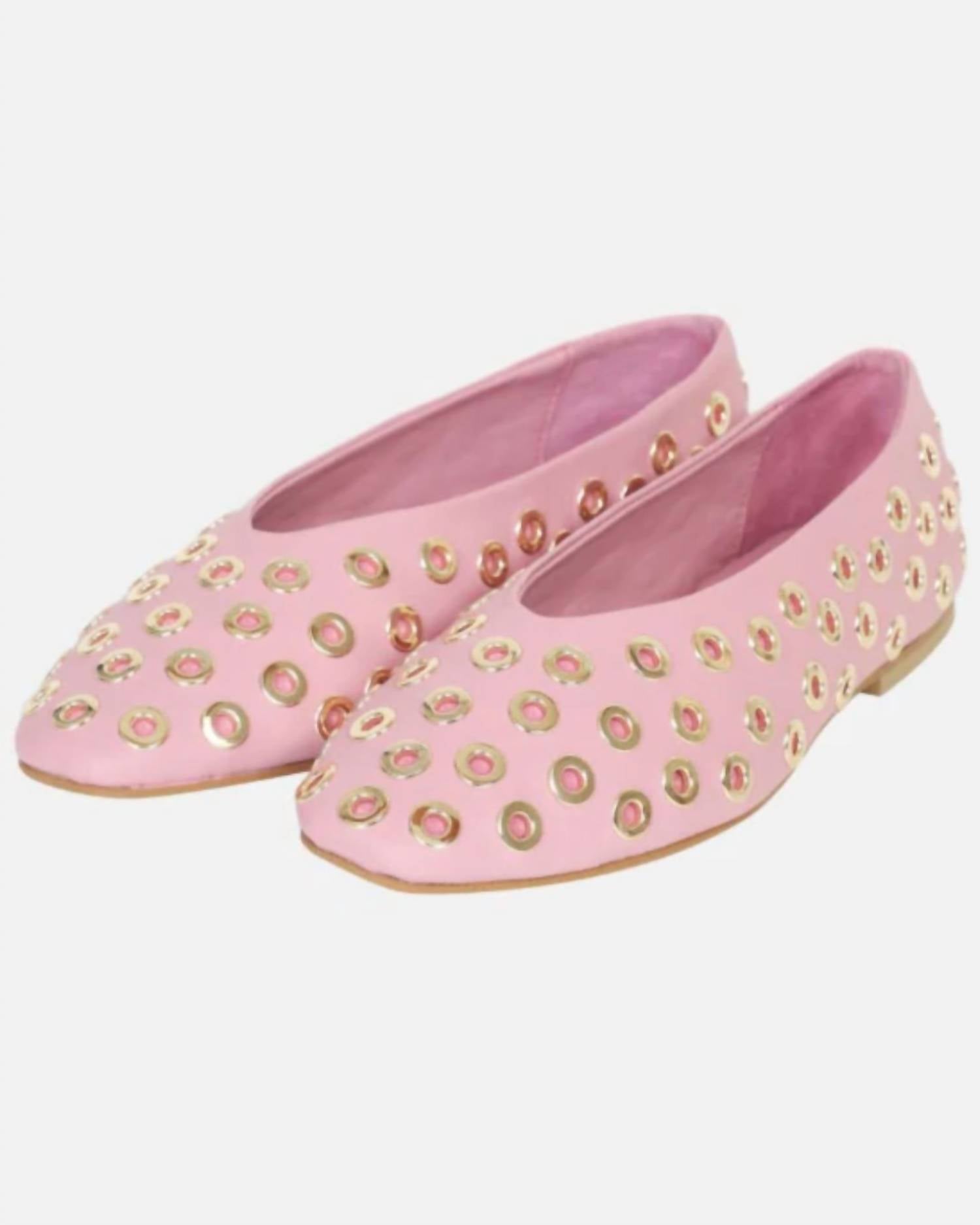 Presenting the Women's Stud Ballerina Flats by Berenice, a stylish addition to the casual-chic trend with a touch of edge. These flat ballerinas are crafted from pink leather, adorned with gold studs for an elegant yet modern look. Perfect for summer occasions and engagements, they effortlessly transition from office wear to evening outings. Embrace comfort and style with these versatile flats, ideal for pairing with jeans, flowing dresses, or midi skirts.