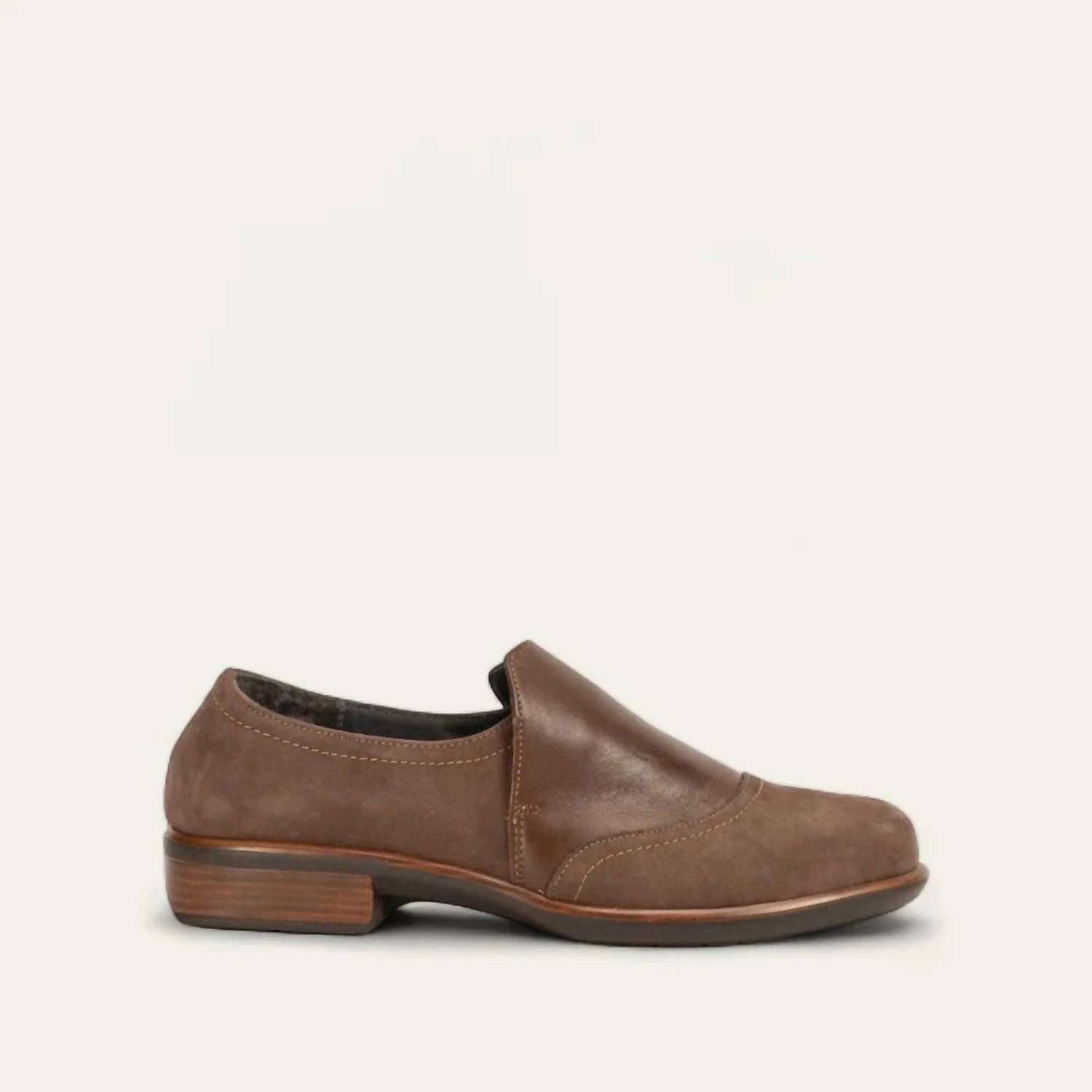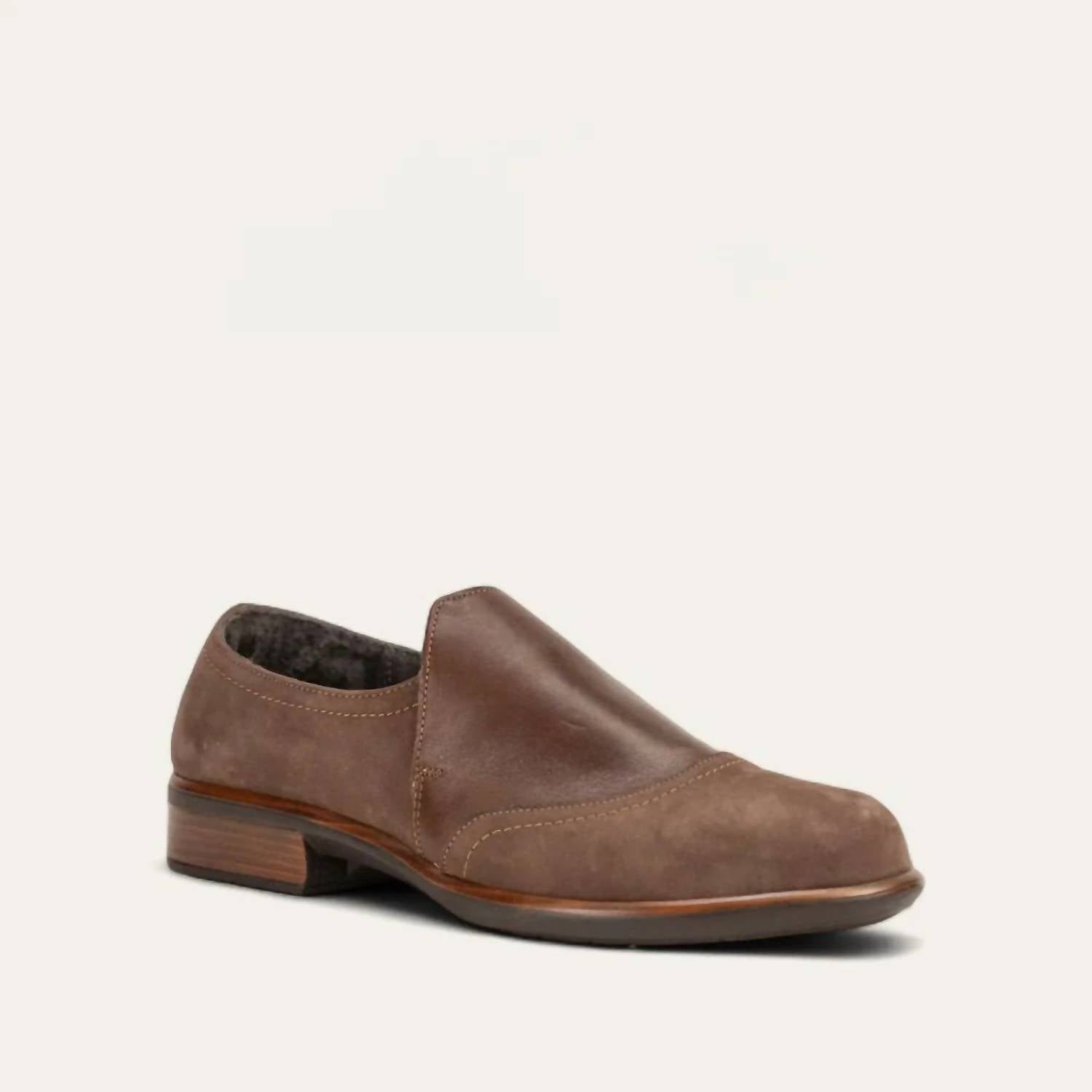 A classic loafer that is both comfortable and polished. Step into elegance with the Women's Angin Leather Shoes by NAOT, perfect for both the office and casual outings. Crafted in a rich Coffee Bean Nubuck Toffee color, they feature a mix of leather, suede, and nubuck with hidden gore for an easy slip-on experience. Enjoy comfort with a removable cork and latex footbed and a slip-resistant polyurethane sole, complemented by a low 1.5" flat heel. These orthotic-friendly shoes offer a medium width and true-to-size fit, advising half sizes to size up for optimal comfort.