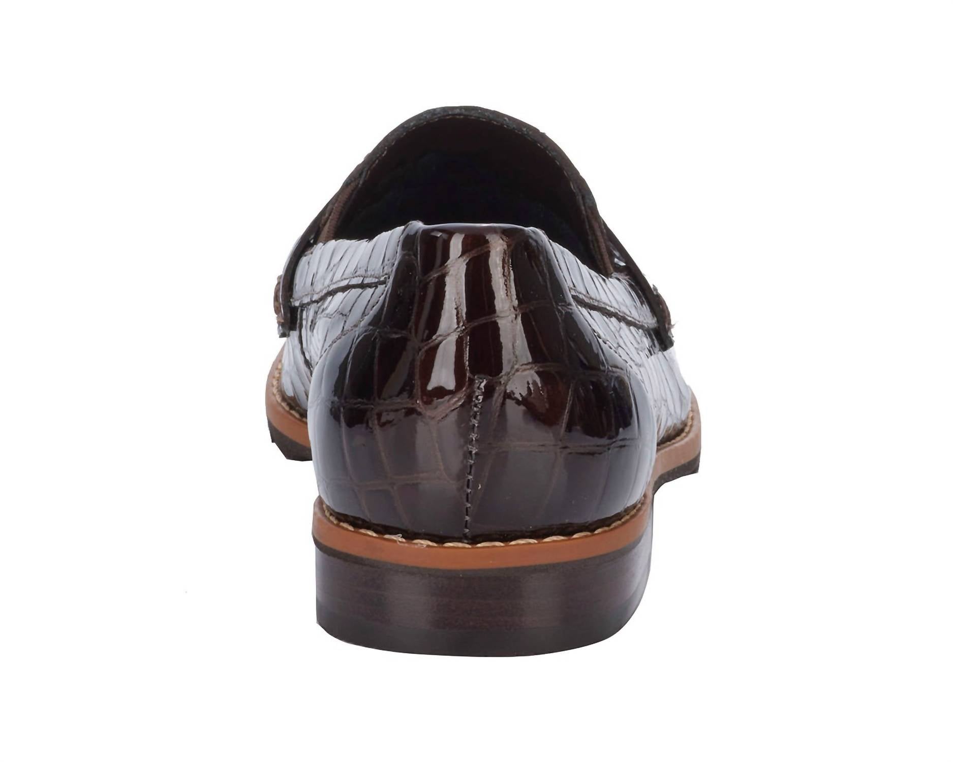 A classic loafer that is both comfortable and polished. Step into elegance with the Women's Winnie II Loafer by Ros Hommerson, featuring a sleek round toe design perfect for any evening event. Crafted from glossy patent leather, these brown loafers offer a touch of Boho Chic glamour for the summer season. The flat block heel measures 1 inch, providing comfortable yet stylish support. Ideal for the modern woman seeking understated sophistication.