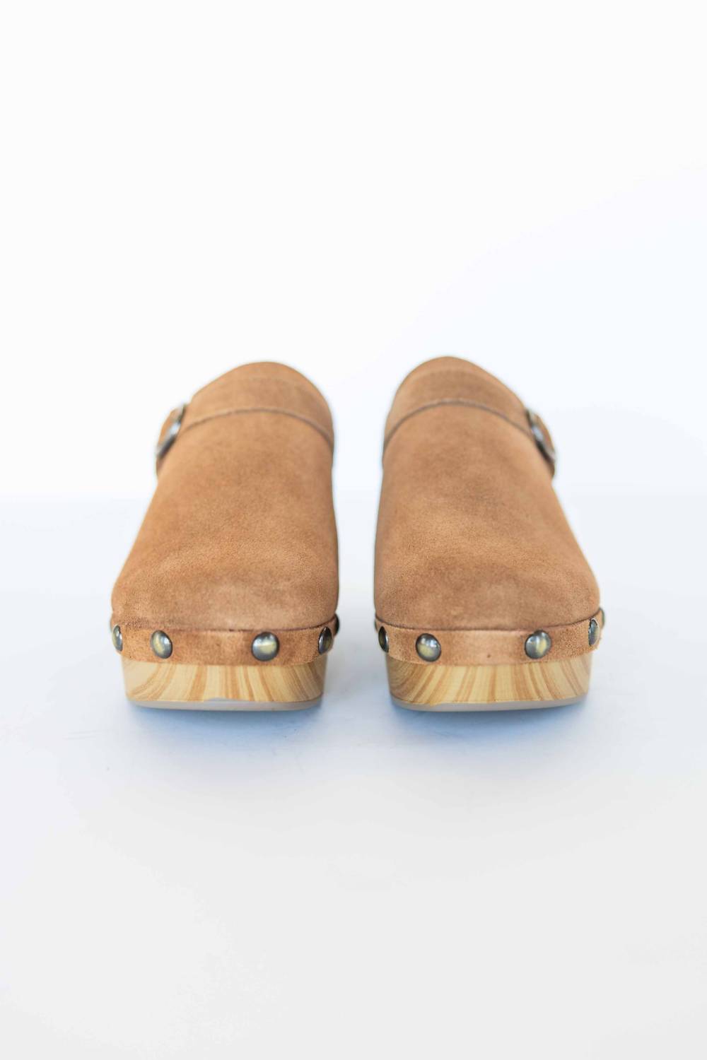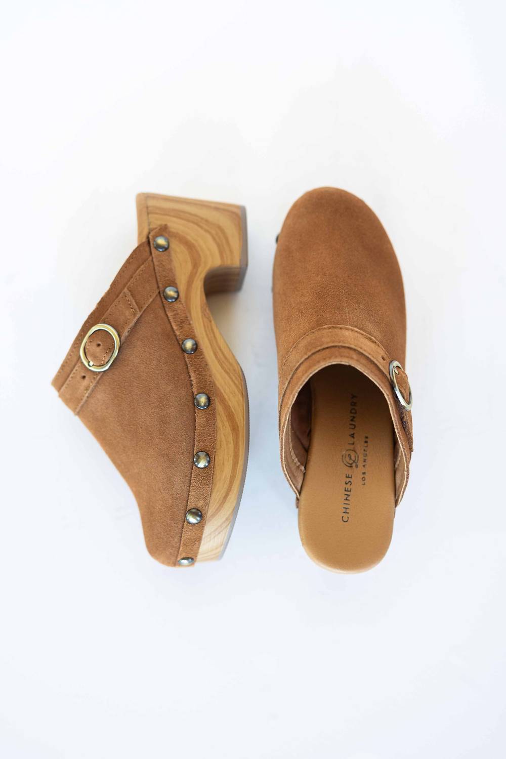 Slip them on and go! Step into effortless style with the Women Cindy Casual Clog by Chinese Laundry, perfectly crafted in a tan suede. The slip-on design includes a suede leather upper adorned with silver studs and complemented by a classic silver buckle. Resting on a defined 1.5 inches platform heel of 2.75 inches, it's a chic addition to your summer streetwear and travel ensembles. Embrace your inner bohemian with this retro-inspired favorite, offering both comfort and style.