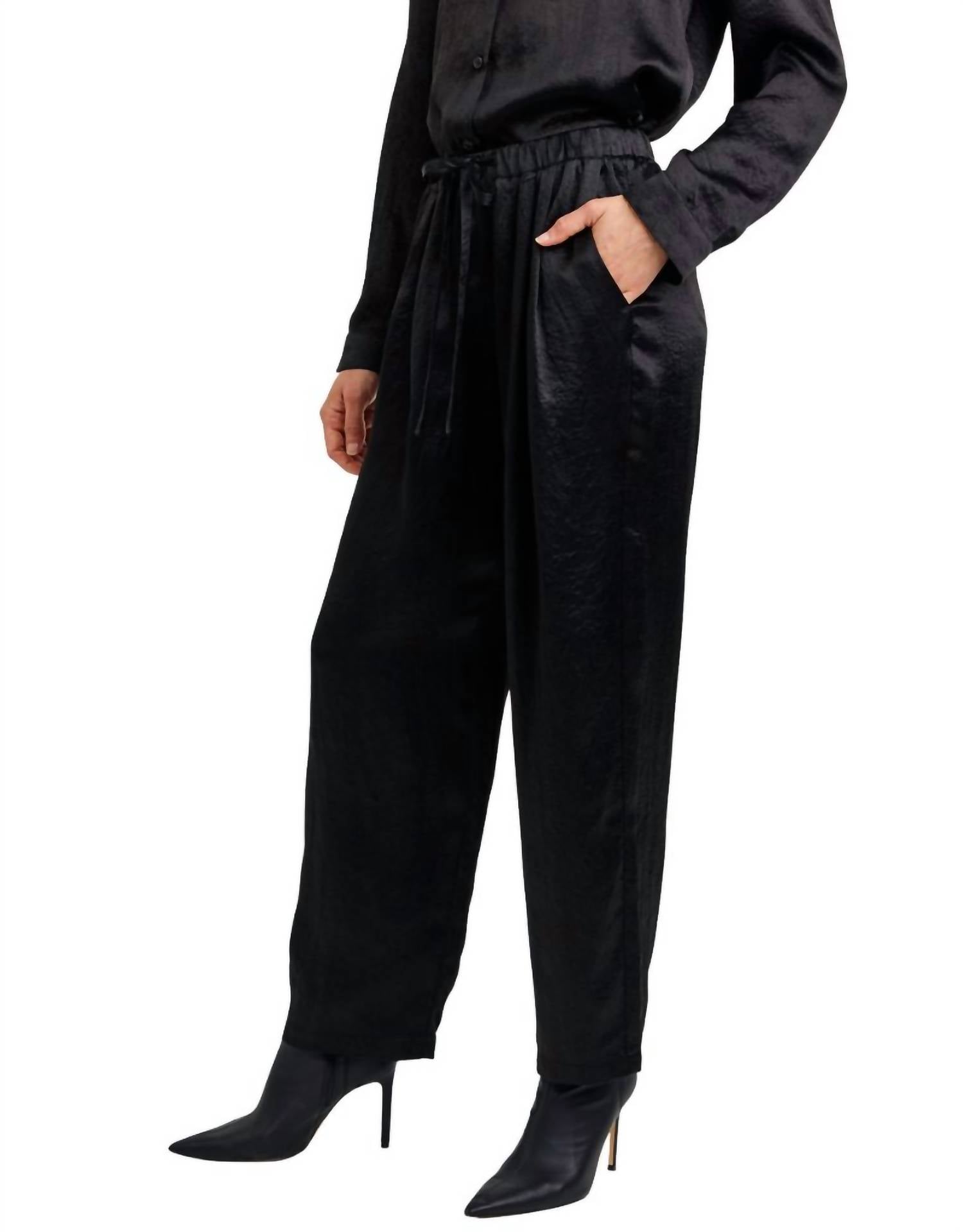 Elevate your workwear wardrobe with the Textured Silky Trouser Pants by Bella Dahl, an ideal choice for summer engagements. Designed for women, these black, wide-leg trousers feature a pull-on style with a convenient drawstring waistband and two side slant pockets. Made in the USA, these pants boast a regular fit and are composed of 100% acetate with a textured finish. Care instructions suggest machine washing and line drying for effortless maintenance.