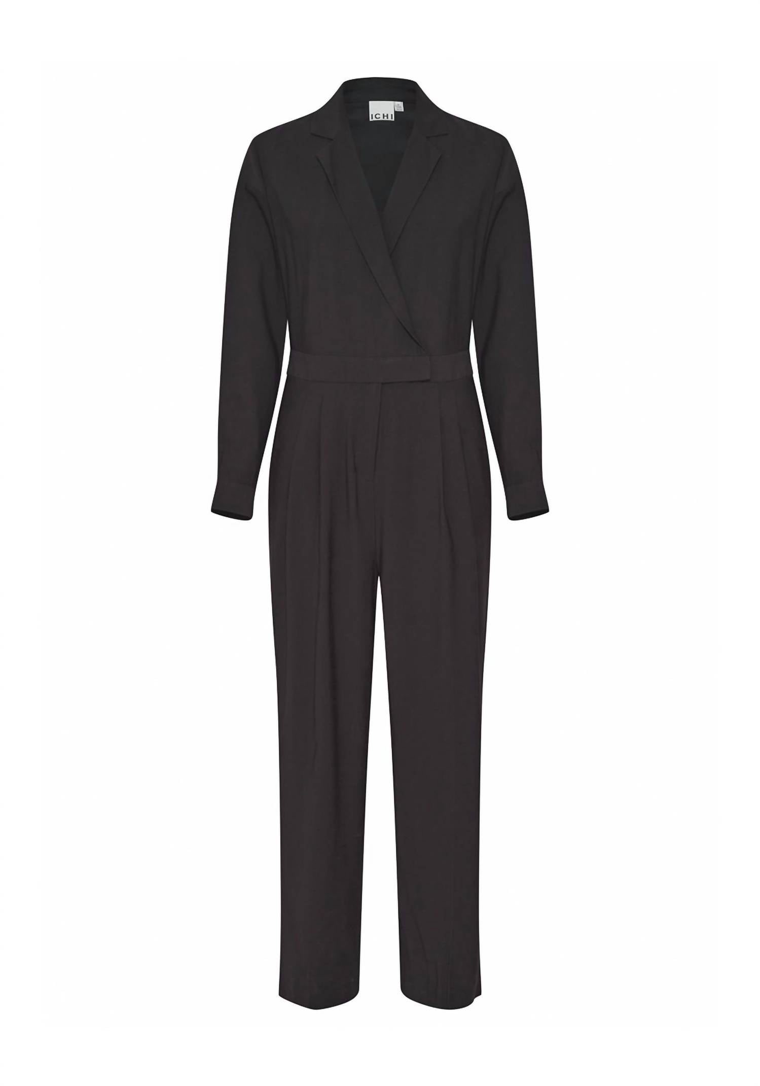 Presenting the Women's Ramla Wrap Jumpsuit by ICHI, an elegant black piece perfect for evening events. This jumpsuit features long sleeves with button cuffs and a wrap style with eyelet and zip fastening, all complemented by a sophisticated folded lapel collar. Crafted from a viscose blend of 90% Viscose and 10% Polyester, it guarantees a comfortable regular fit. Easy to care for, simply machine wash at 30°C. Ideal for those seeking a chic workwear look this fall.