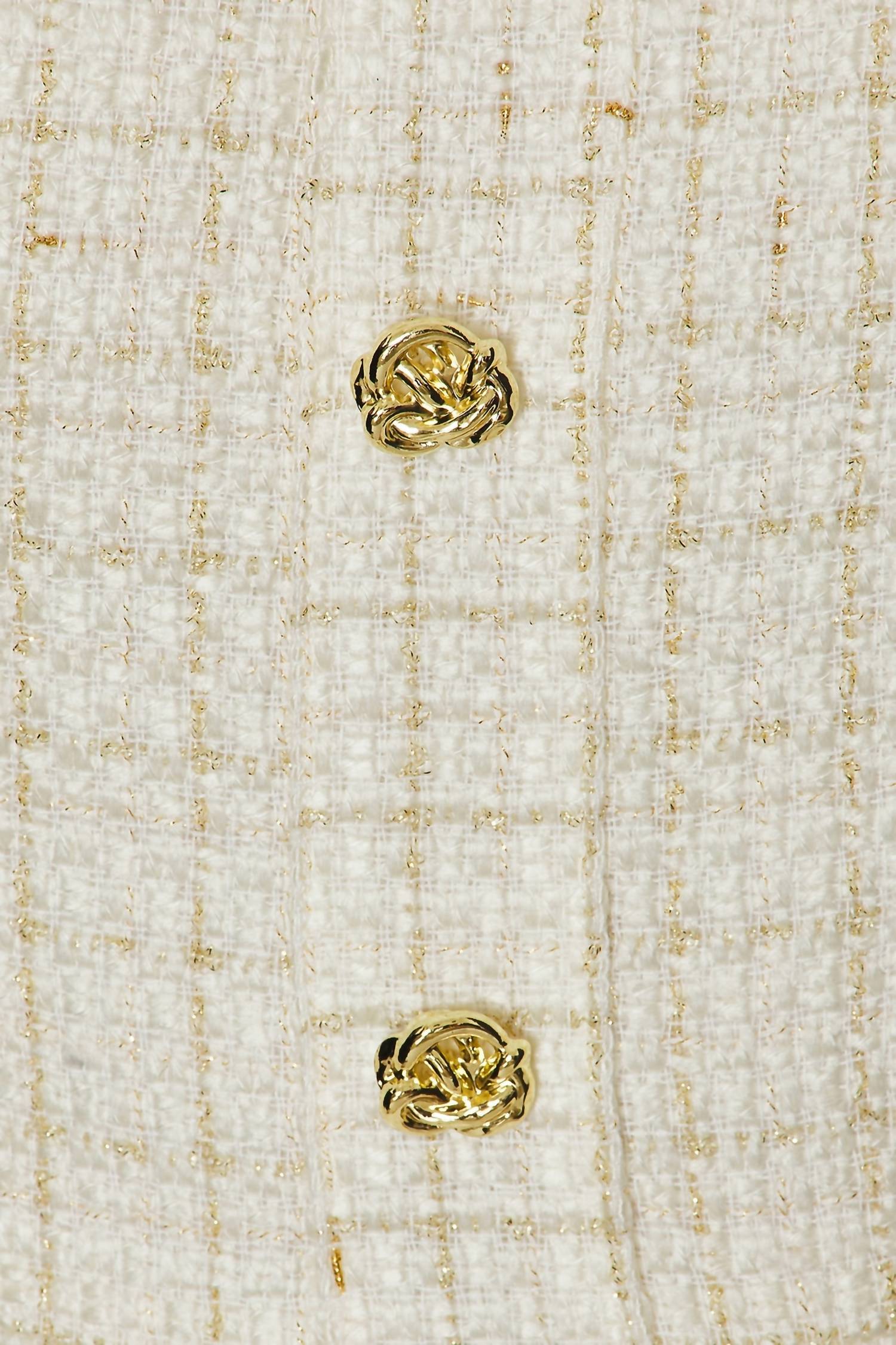Introducing the Fallon Romper by Amanda Uprichard, crafted for a chic holiday party look. This romper features a zip closure and is made from a luxurious blend of 50% polyester, 35% acrylic, and 15% wool, offering both comfort and sophistication. The golden buttons and snowy wool-kissed tweed bring a touch of elegance, perfectly complementing its tailored aesthetic with shapely seams. Care for this minimalist piece with a dry clean to maintain its festive elegance.