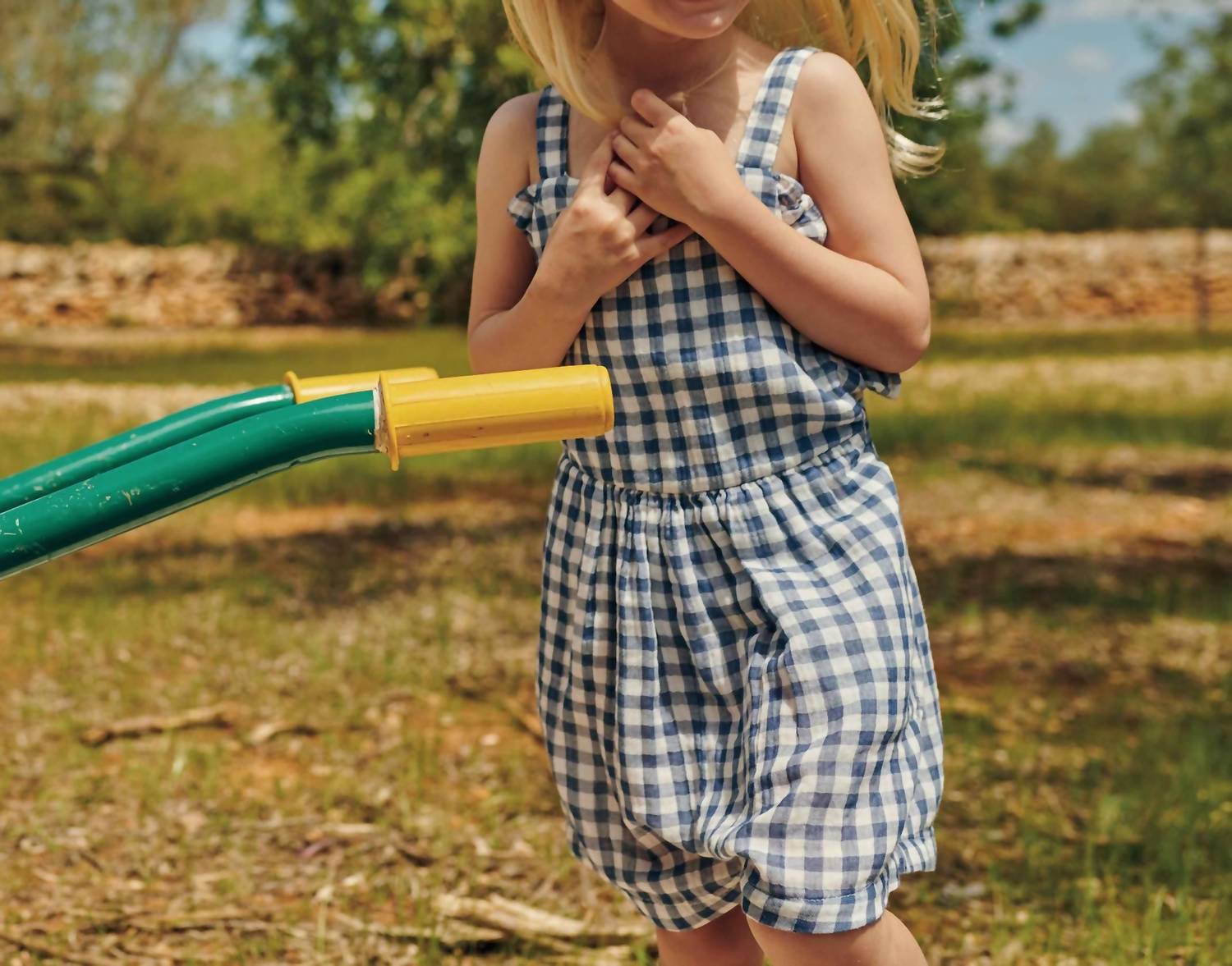 Introducing the Girl's Gingham Muslin Jumpsuit by Búho, a delightful piece in a bluestone hue made for summer adventures. Crafted from a cotton blend using French fabric, this short jumpsuit features charming ruffle details and comfortable straps with an elastic band on the back, ensuring a perfect fit. Proudly made in Morocco, it's designed with a pull-on closure for easy dressing. Perfect for back-to-school or Thanksgiving celebrations, this jumpsuit embodies a playful 90s fashion vibe that your child will adore.