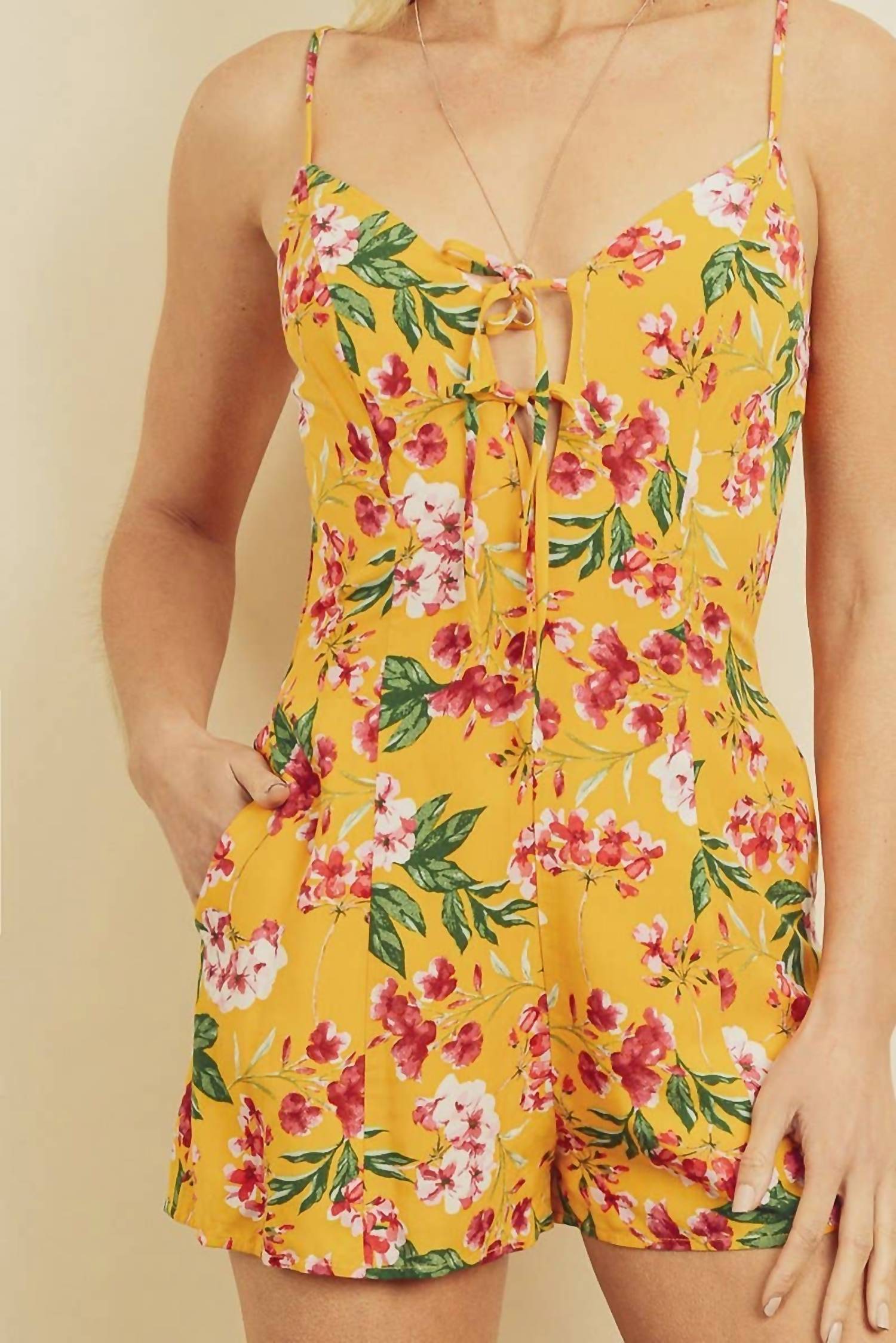 Não é preciso muito para que esta peça fique descolada sem esforço. Adicione algumas joias chamativas para dar um toque especial ou calce tênis para um visual mais casual. Abrace a vibe do verão com o Macacão Aloha Sunshine da Dress Forum, um item essencial boho-chic em amarelo vibrante com estampa floral. Confeccionado em 100% rayon, este macacão possui alças ajustáveis e detalhe de amarração frontal, proporcionando conforto e estilo. Inclui bolsos laterais para maior praticidade e fecho de zíper invisível nas costas para um ajuste elegante. Uma escolha perfeita para um dia de praia no Dia de Ação de Graças, pensado para mulheres que adoram um visual descontraído e estiloso.