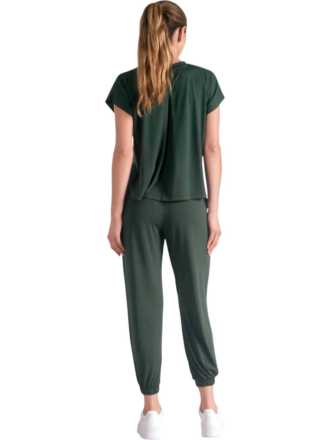 It doesn't take much for this one piece to look effortlessly cool. Add some statement jewelry to dress it up, or throw on some sneakers for a more casual vibe. Experience easy sophistication designed for chic versatility in dark green. Crafted from a blend of 72% Modal, 24% Polyester, and 4% Spandex. Offers a soft, comfortable fit with an effortlessly stylish tapered leg. Pull-on closure and convenient pockets make it perfect for a laid-back travel look. Machine wash. Model is wearing a size small at 5'11", 34" bust, 24" waist, and 36" hips.