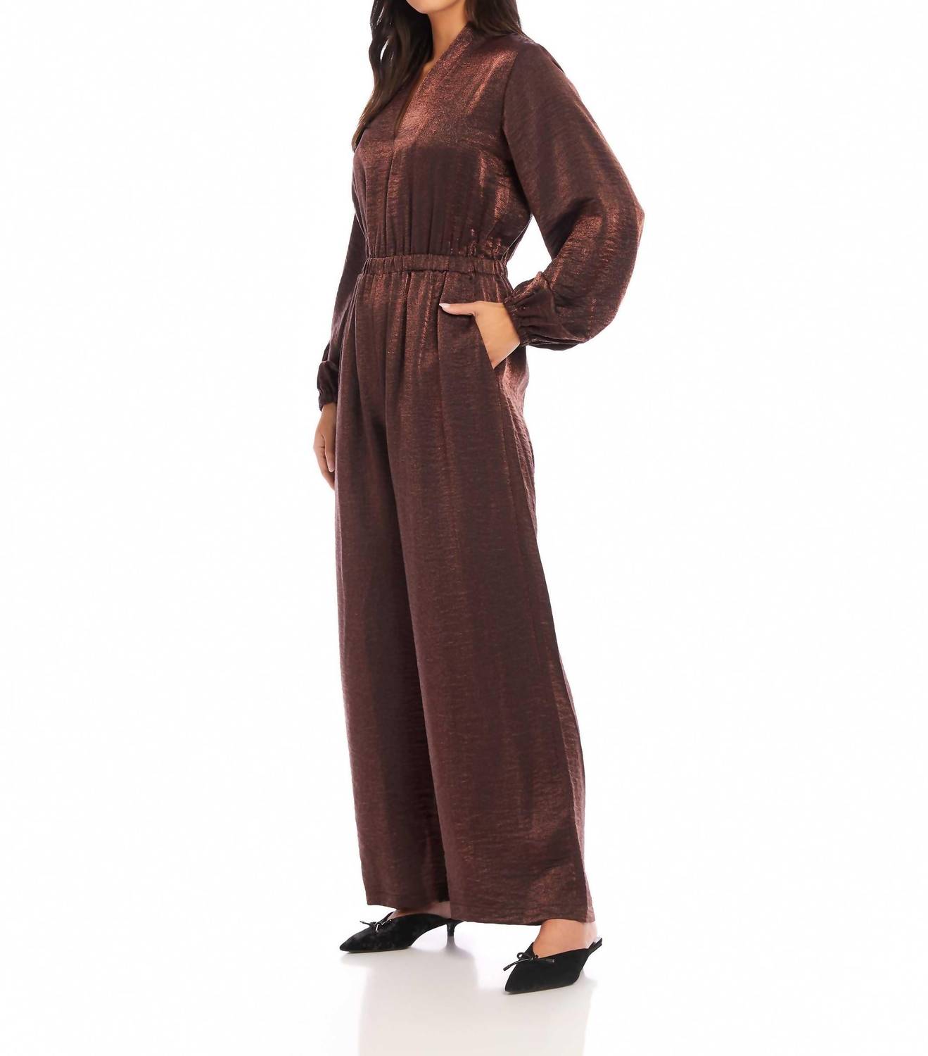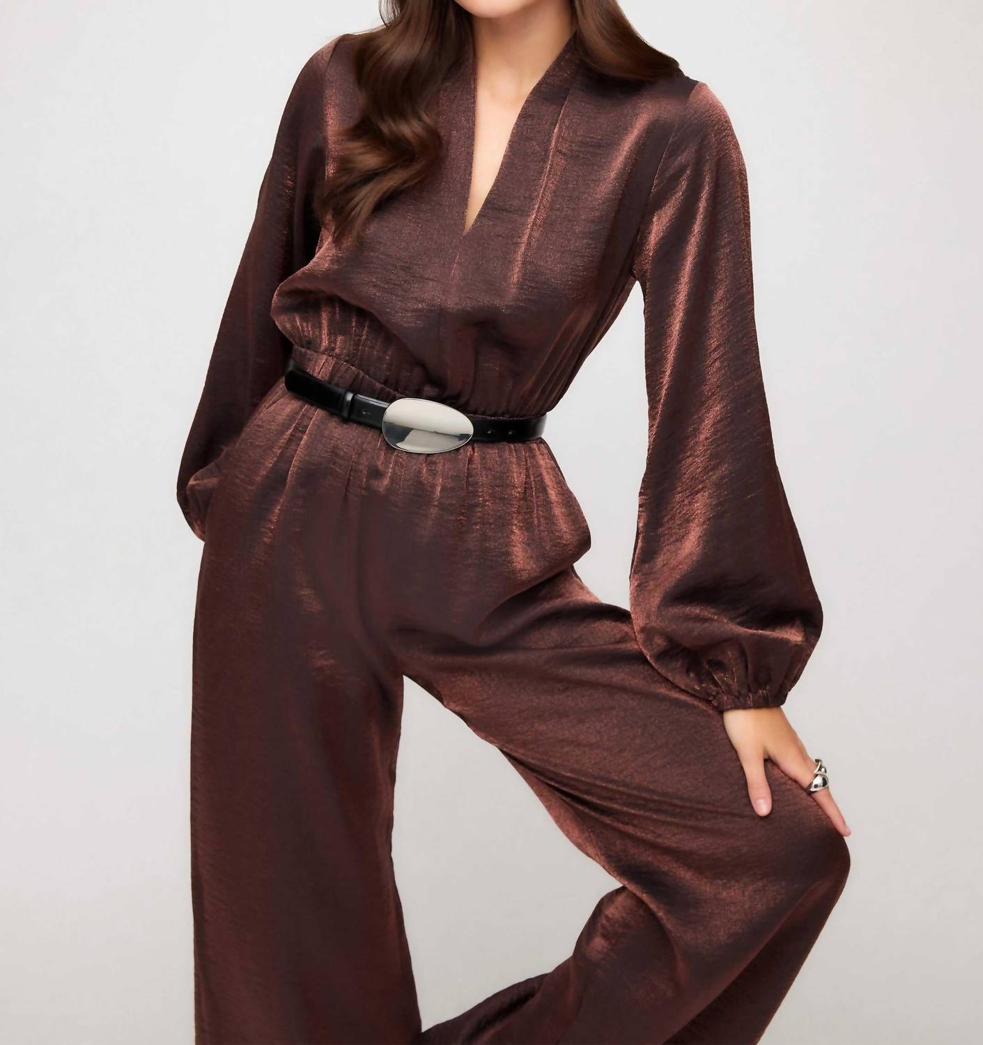 Eleve seu guarda-roupa com o Macacão Relaxed com decote em V Skyler da Fifteen Twenty, confeccionado em um material luxuoso e brilhante que exala um luxo discreto. Este macacão, em um sofisticado tom marrom, apresenta mangas compridas tipo blusão e decote em V, perfeito para qualquer jantar ou comemoração de Ano Novo. Fabricado nos EUA com 82% viscose e 18% nylon, inclui um fecho de zíper invisível nas costas e bolsos laterais práticos. Cuide dele lavando à mão com água fria e secando na horizontal para uma elegância duradoura.
