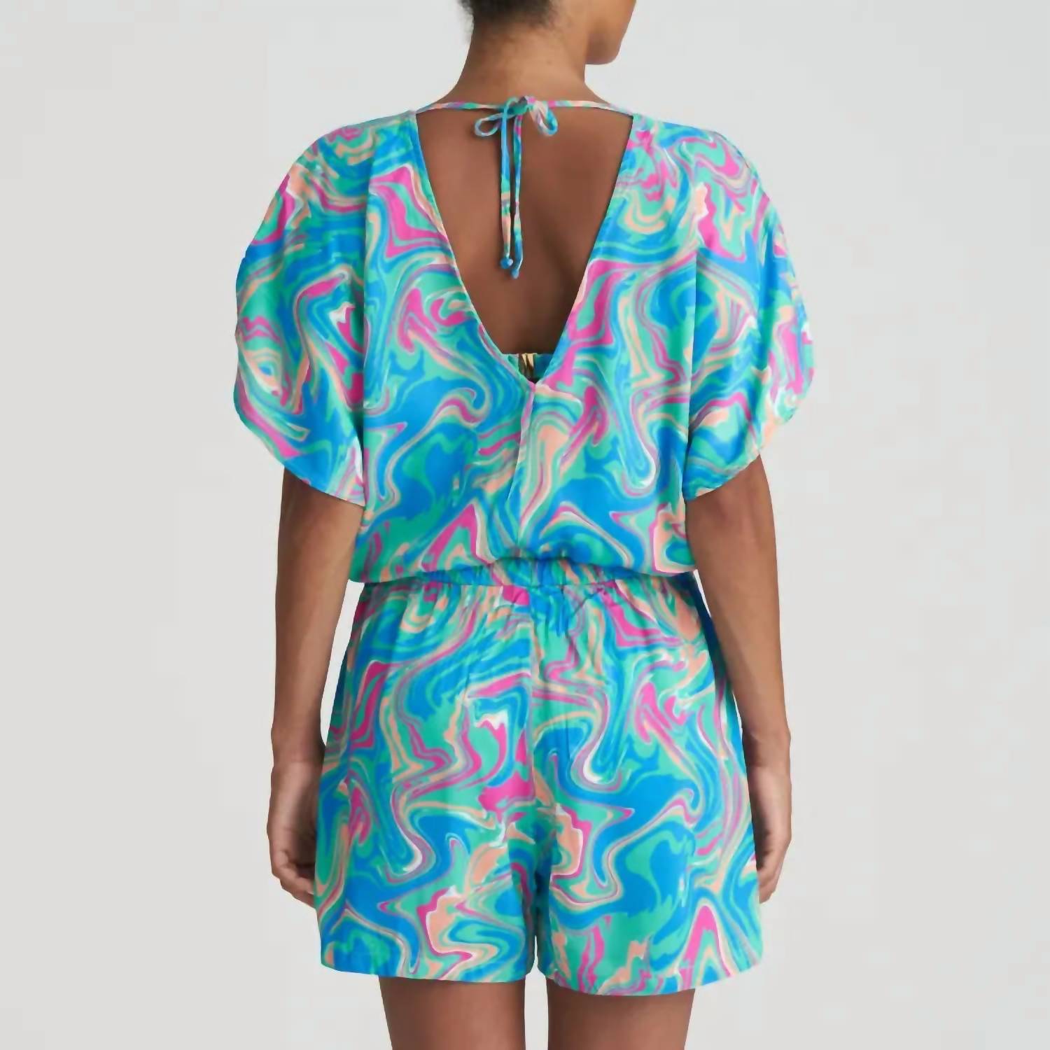Throw it on and go! Experience effortless elegance with the Marie Jo Arubani Swimwear Jumpsuit in Ocean Swirl. This patterned jumpsuit features airy butterfly sleeves and a stylish low-cut design on both the front and back, perfect for a summer beach day. Crafted from 100% Viscose, it boasts a relaxed fit with straight legs and a convenient pull-on closure. Care instructions include a 30°C hand wash and line dry; do not bleach or tumble dry.