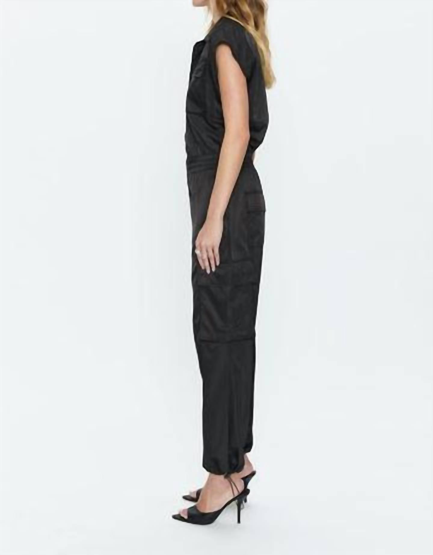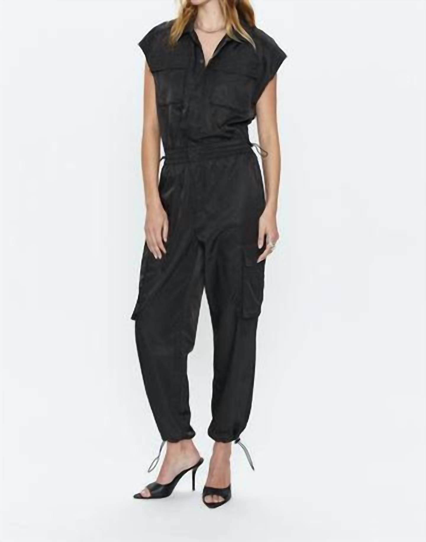 Descubra o elegante Macacão Cargo Jade da PISTOLA, a combinação perfeita de estilo e praticidade para sua coleção de streetwear de primavera. Este macacão preto liso apresenta um corte folgado e bolsos práticos, tornando-o uma peça essencial para as férias. Confeccionado em 100% poliéster, oferece conforto e durabilidade. Para facilitar os cuidados, esta peça pode ser lavada na máquina e seca na secadora.