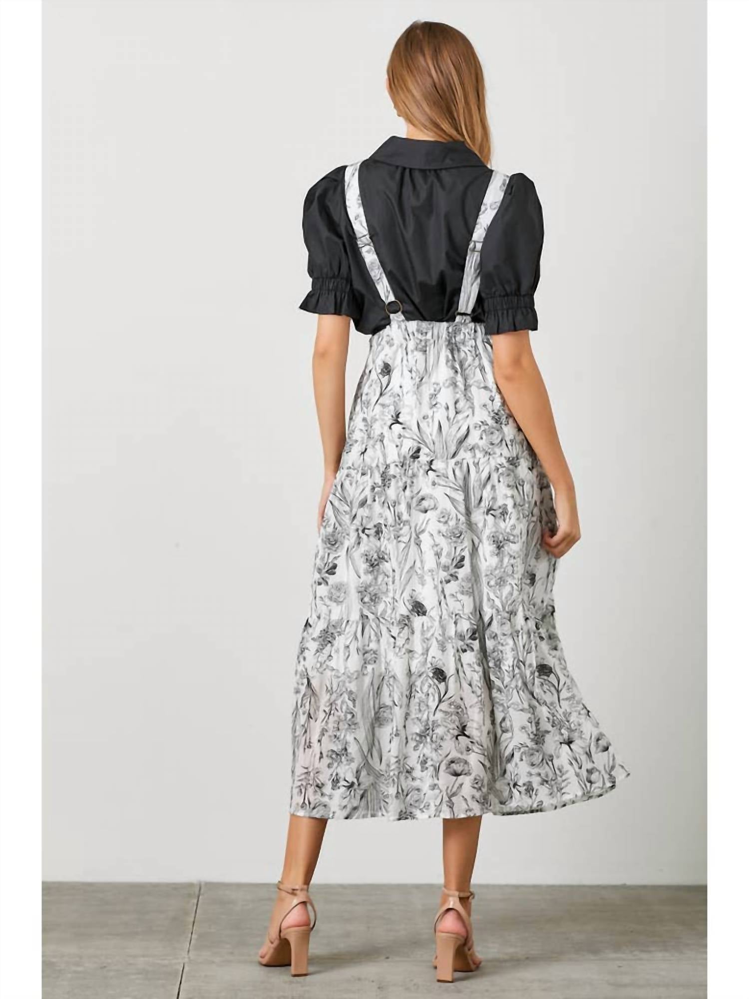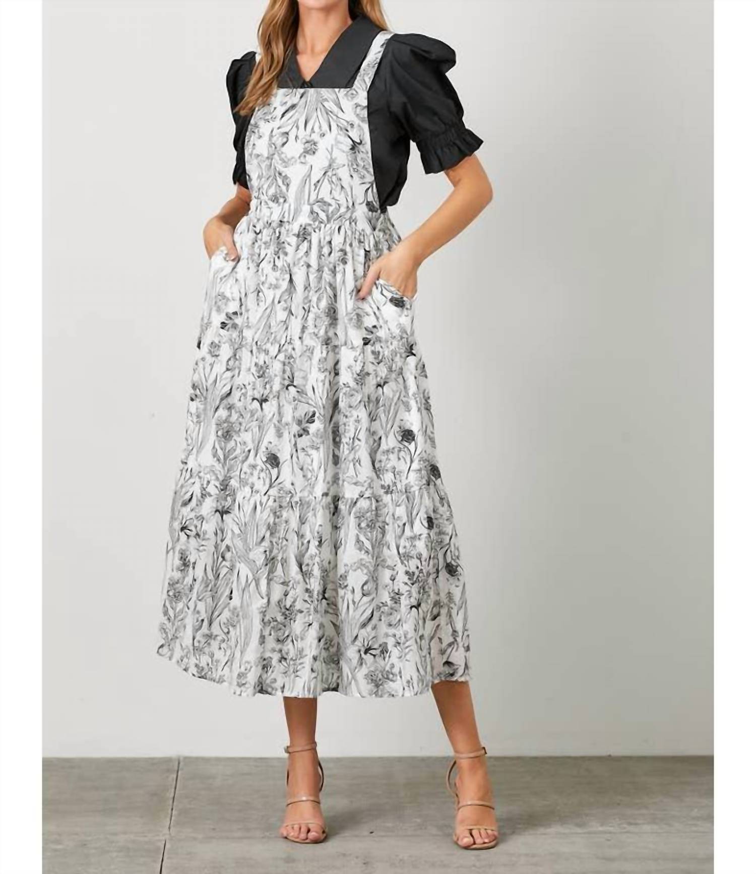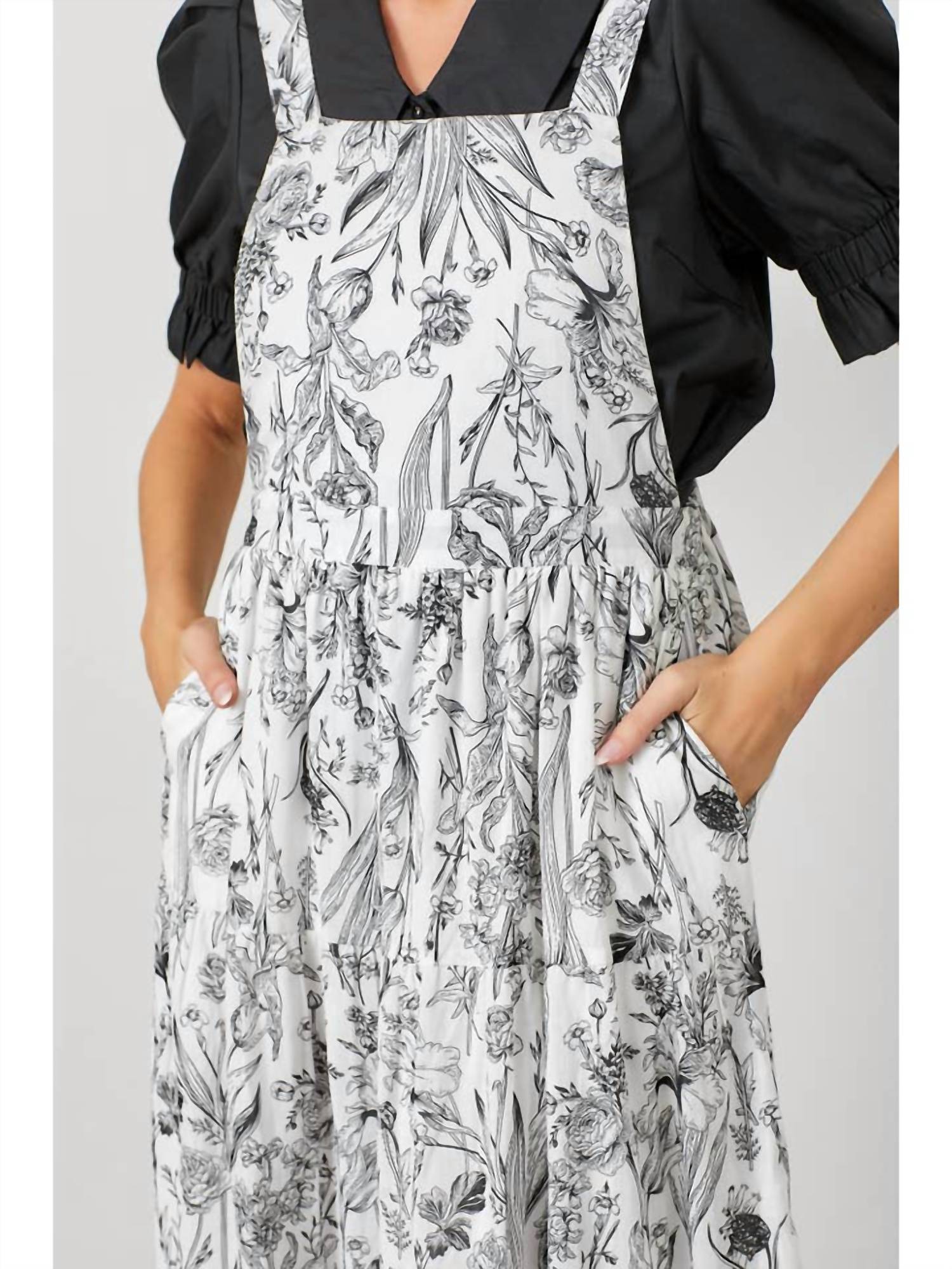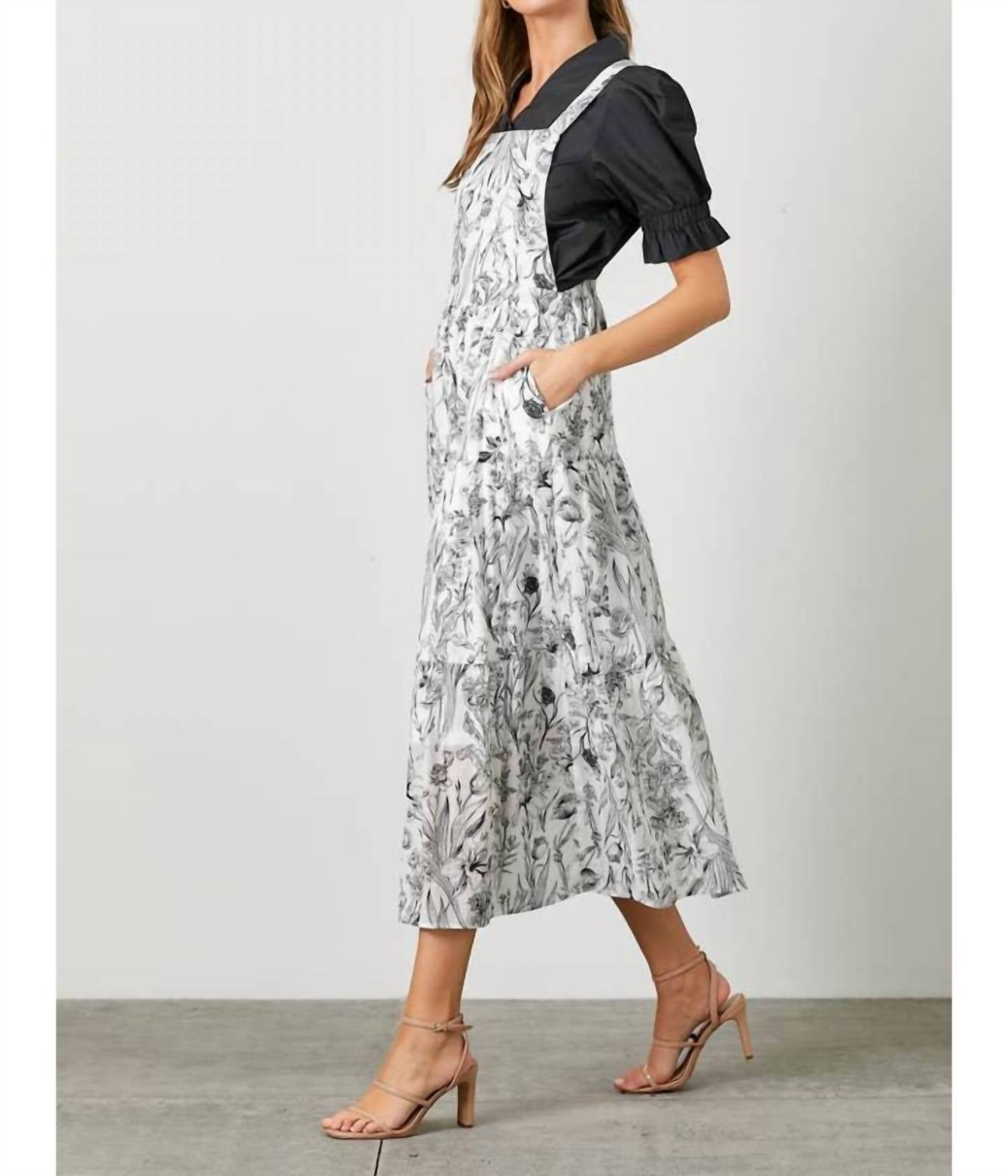 Meet the Caplan Midi Jumper by Polagram, designed for playful elegance in a boho chic style. This jumper features long adjustable straps and a tiered midi-length skirt, crafted from a comfortable blend of 60% cotton and 40% polyester. It comes in white with delicate black floral details, and is fully lined for added comfort, complete with side seam pockets for practicality. Closure: Pull-on style. Care: Machine wash cold, hang dry, do not bleach. Available in sizes S (46" length, 24" waist) to 3X (47" length, 39" waist), accommodating both standard and plus sizes. Ideal for spring outings or Easter celebrations.