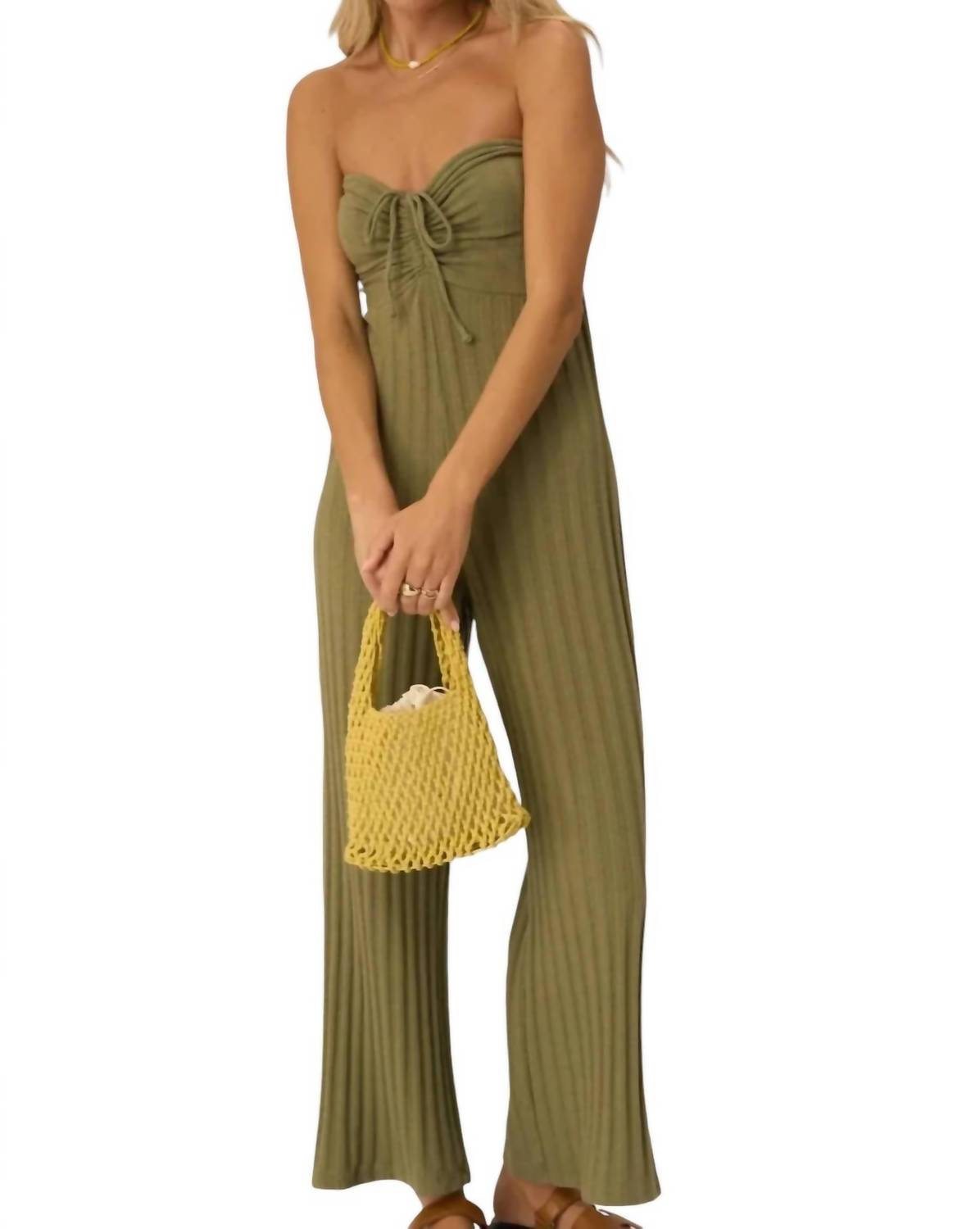 Não é preciso muito para que esta peça fique descolada sem esforço. Adicione algumas joias chamativas para dar um toque especial ou calce tênis para um visual mais casual. Este Macacão Marselha sem alças canelado apresenta um tecido canelado largo texturizado com decote coração, cintura alta e pernas largas. Confeccionado em uma mistura de 48% algodão, 48% poliéster e 4% elastano, oferece um caimento solto e fecho por pressão para um estilo e conforto sem esforço.