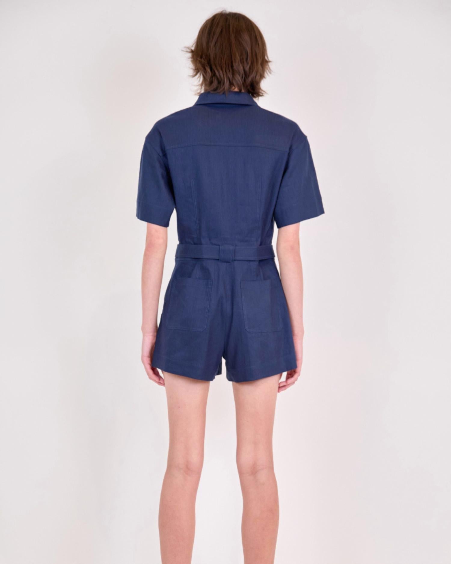 Embrace effortless sophistication with the Aspen Short Sleeve Romper by SIMKHAI, tailored for the modern woman in a striking Midnight hue. This romper features short sleeves and a structured linen blend, comprised of 51% Linen, 46% Rayon, and 3% Spandex, offering a comfortable and refined fit. With a cinched waist and wide-leg, high-rise silhouette, it is elevated by a practical front zip closure and pockets for added convenience. Care for this elegant piece with a machine wash on a gentle cycle, tumble dry low, and a warm iron if necessary.