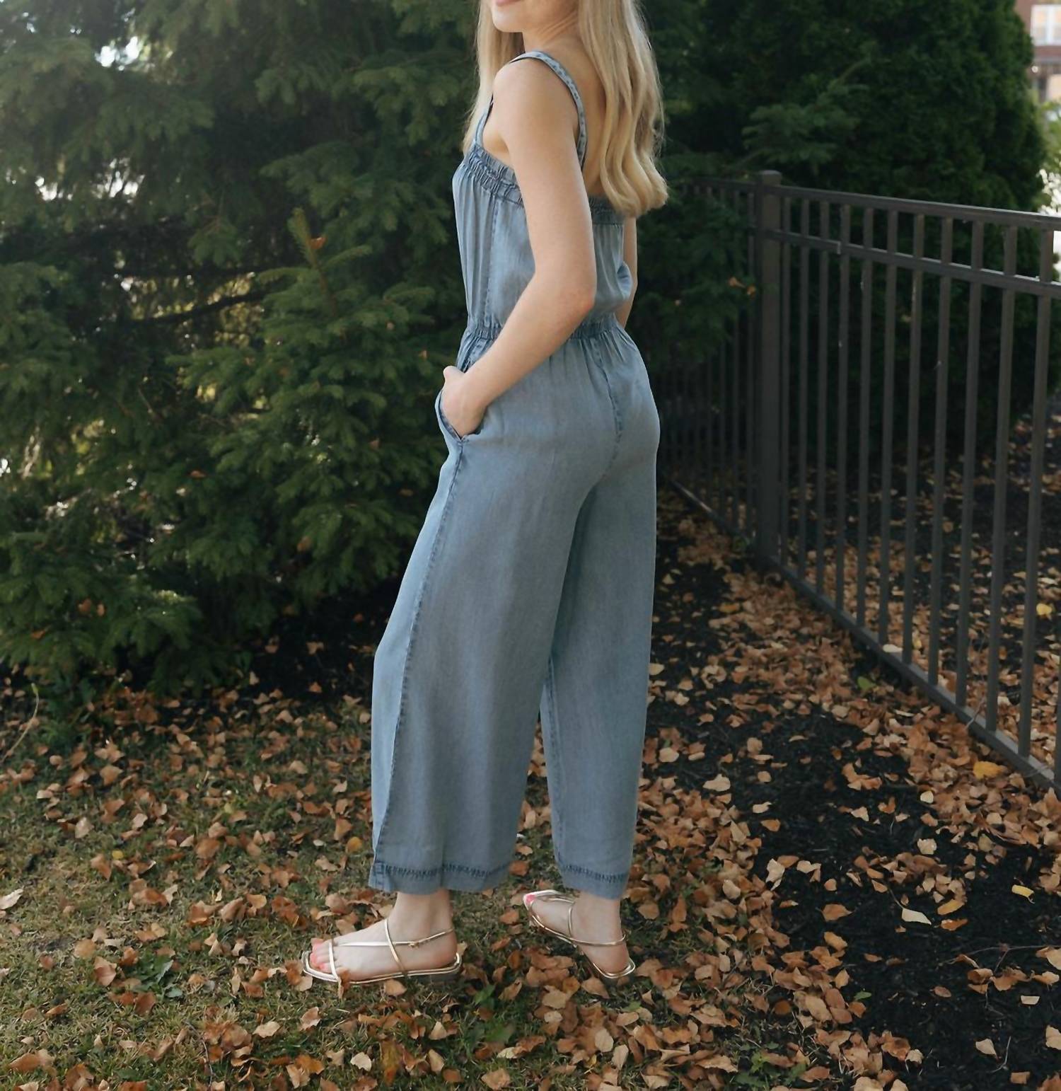 Discover the Solara Chambray Jumpsuit by Z Supply, a stunning piece in blue crafted for your summer getaways. This sleeveless jumpsuit features a cropped length with a flattering square neckline and adjustable straps, offering a customizable fit. Made of 100% Lyocell, it comes with convenient side pockets, while its pull-on design ensures ease of wear. Measurements for size XS include a length of 54", a stretchy bust of 27", and a 24" inseam.
